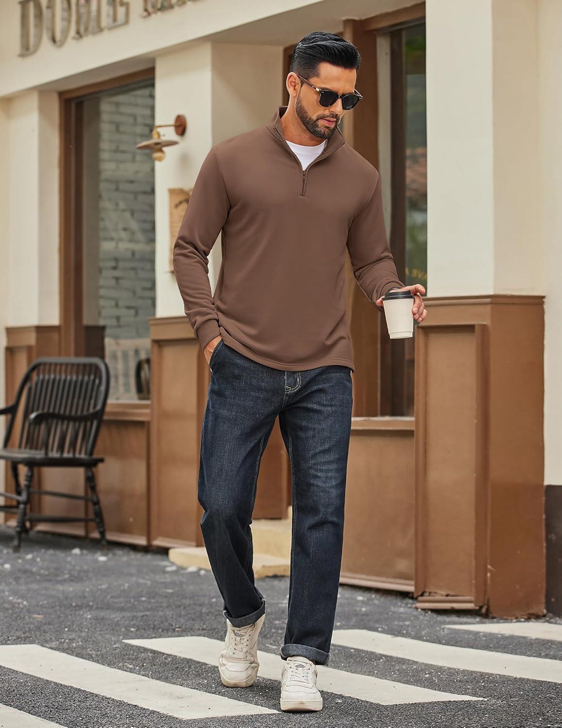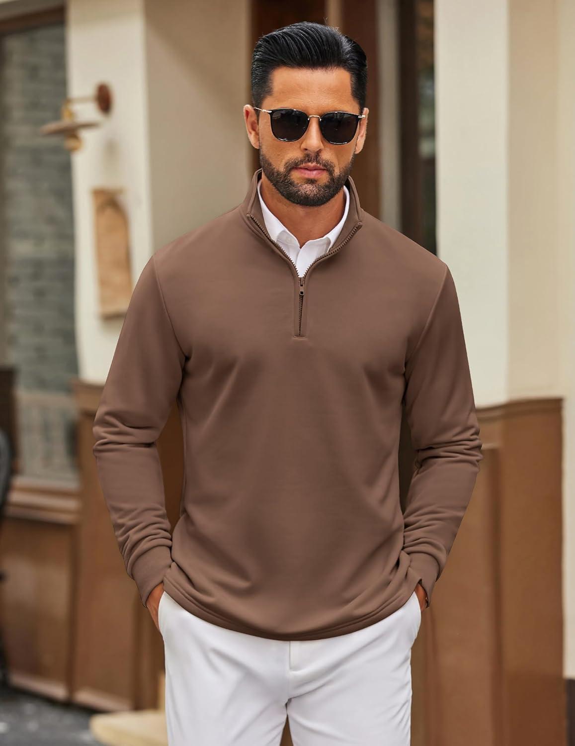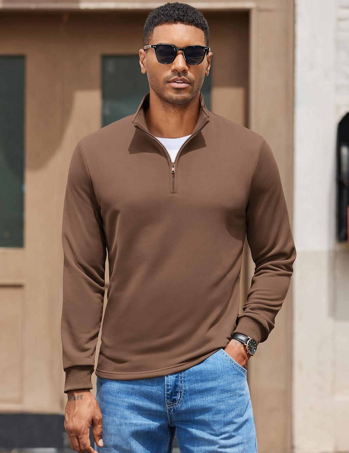 COOFANDY Men’s Quarter Zip Pullover Sweatshirt Mock Neck Quilted Sweatshirt Lightweight Casual Long Sleeve Polo Shirt(Brown)