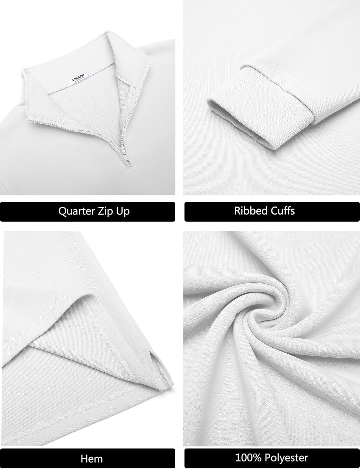 COOFANDY Men's Quarter Zip Pullover Sweatshirt Mock Neck Quilted Sweatshirt Lightweight Casual Long Sleeve Polo Shirt(White)