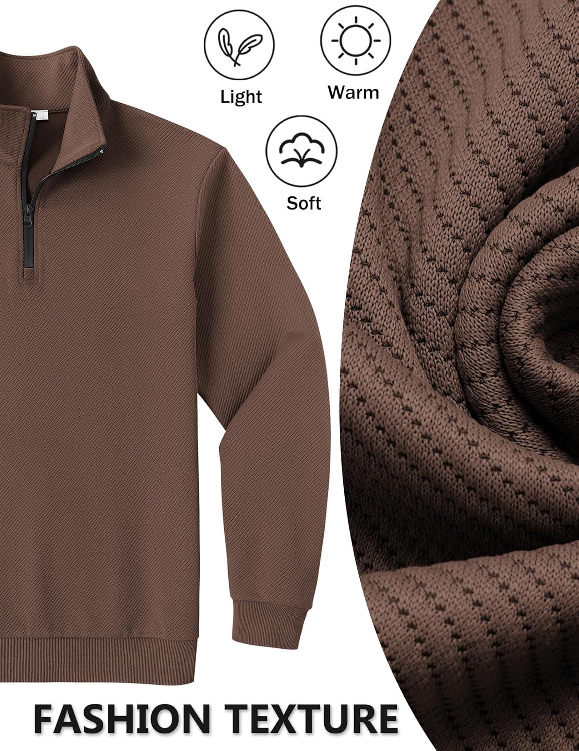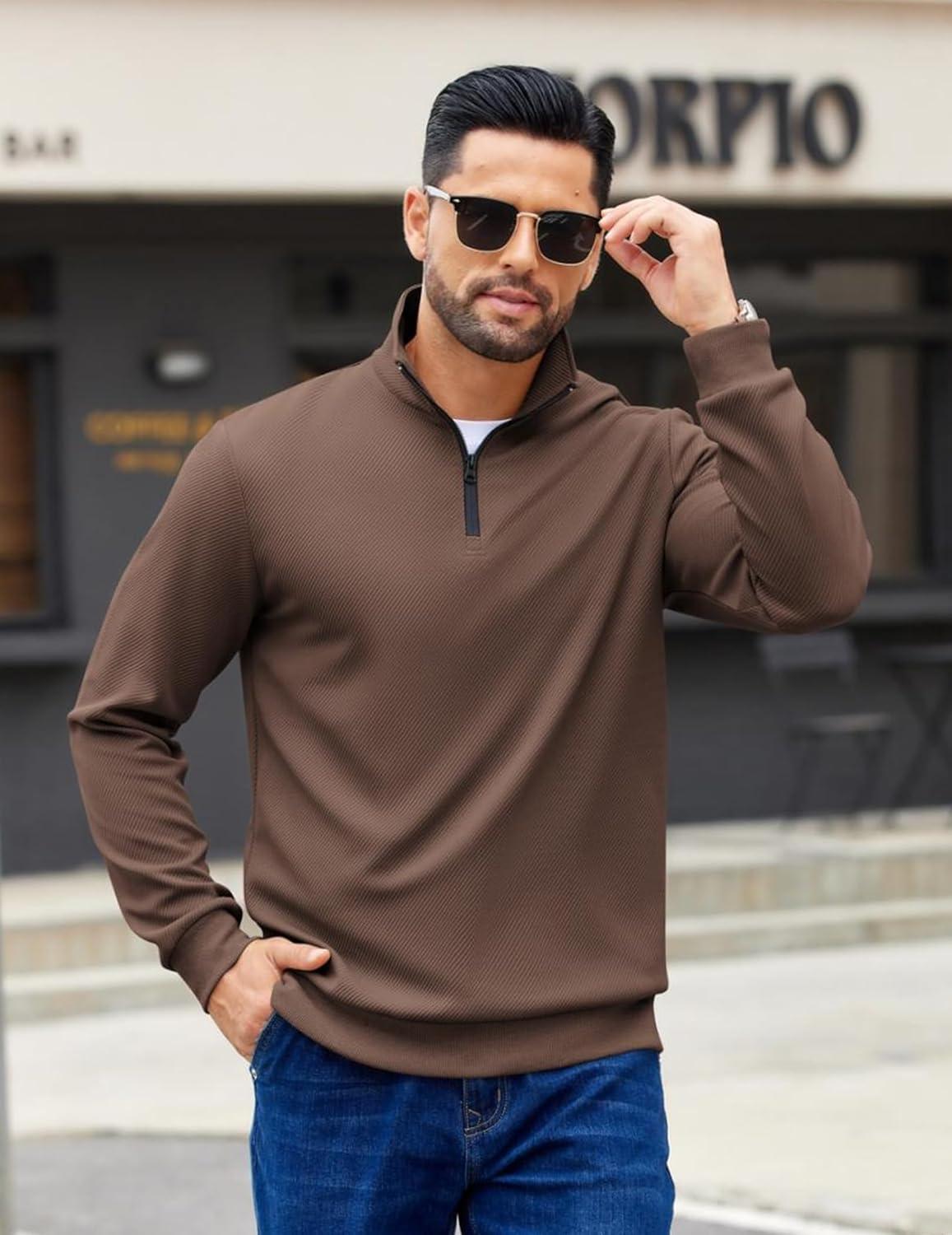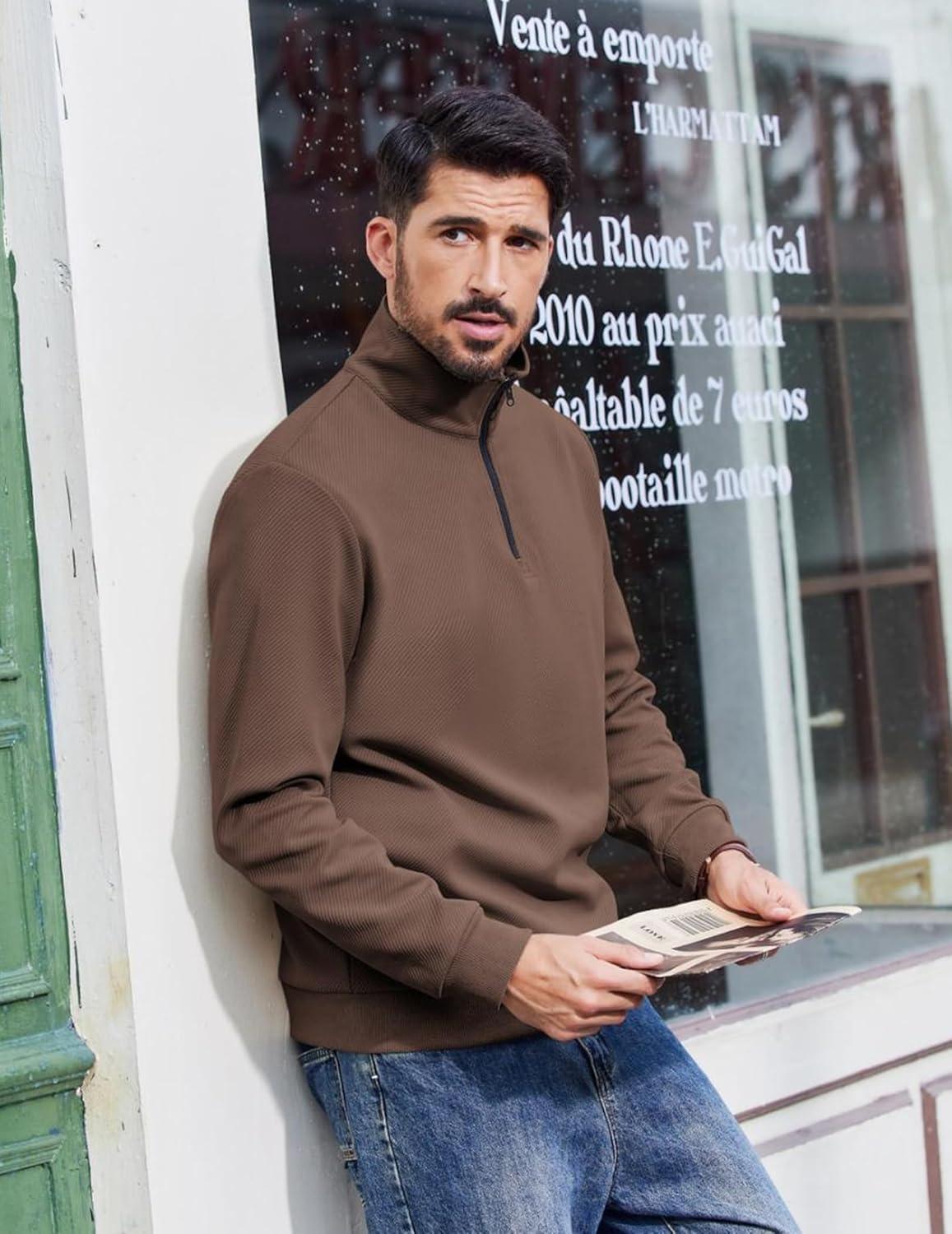 COOFANDY Mens Quarter Zip Pullover Sweatshirts Lightweight Long Sleeve Mock Neck Sweater Polo(Brown)