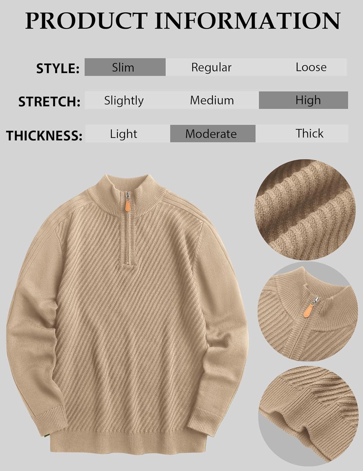 COOFANDY Mens Quarter Zip Sweater Casual Slim Fit Pullovers Sweaters Knit Twill Texture Pullover(Light Khaki)