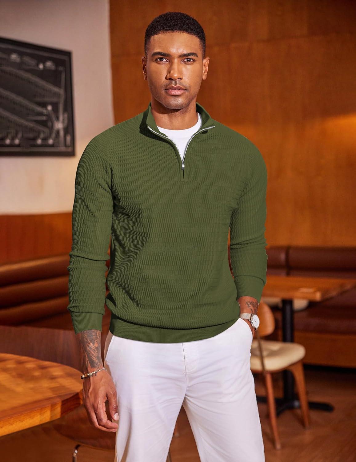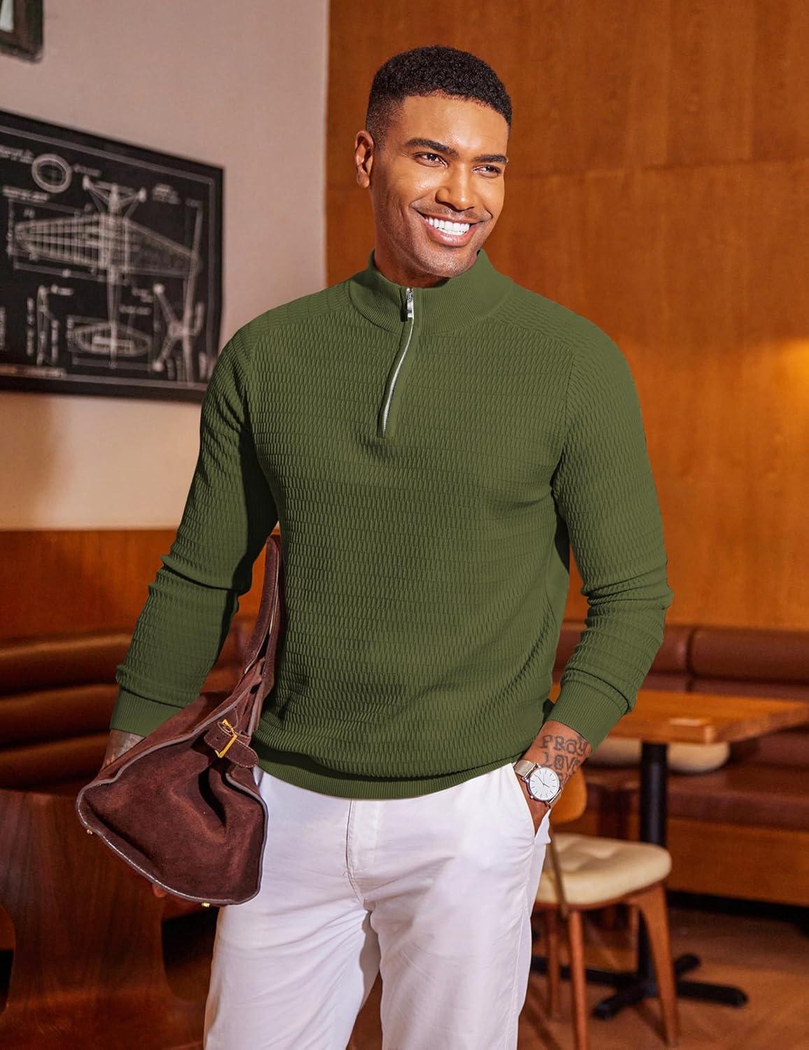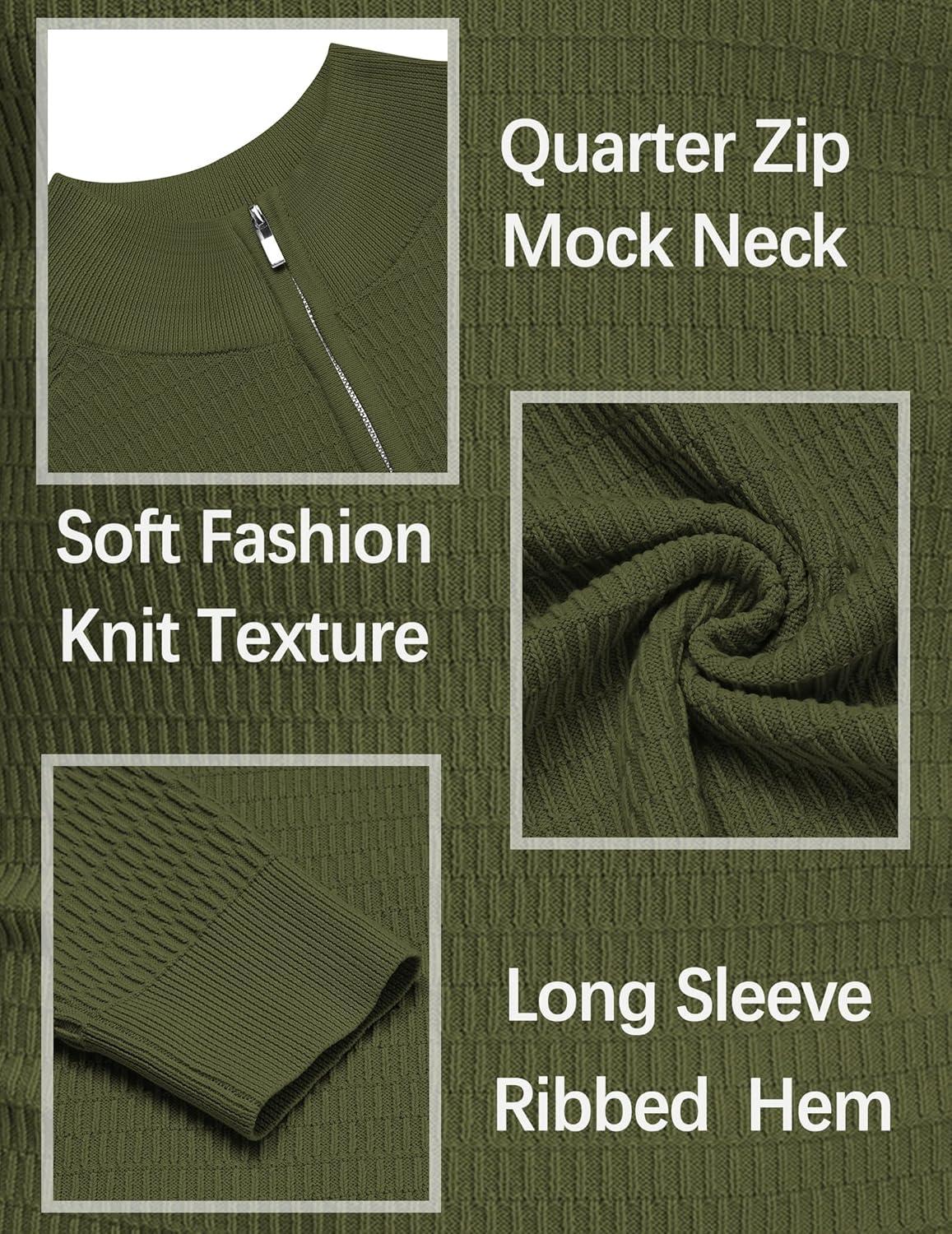 COOFANDY Men's Quarter Zip Sweater Slim Fit Lightweight Mock Neck Pullover Knit Texture Polo Sweaters(Army Green)