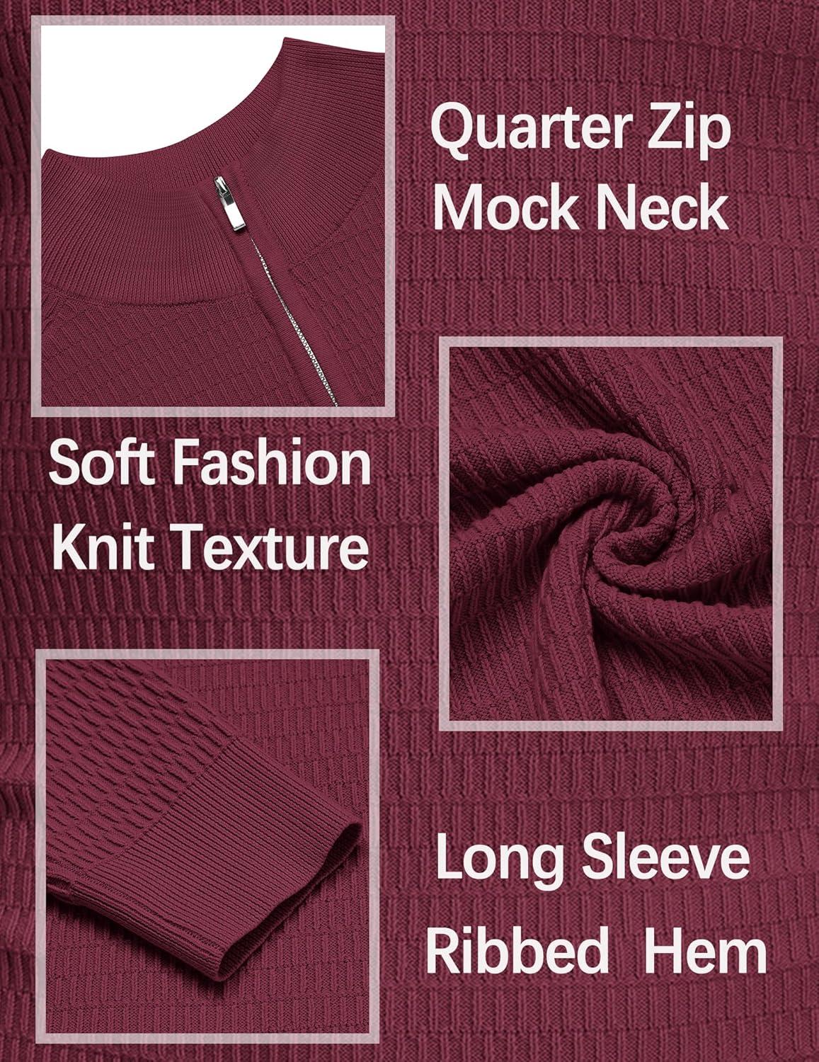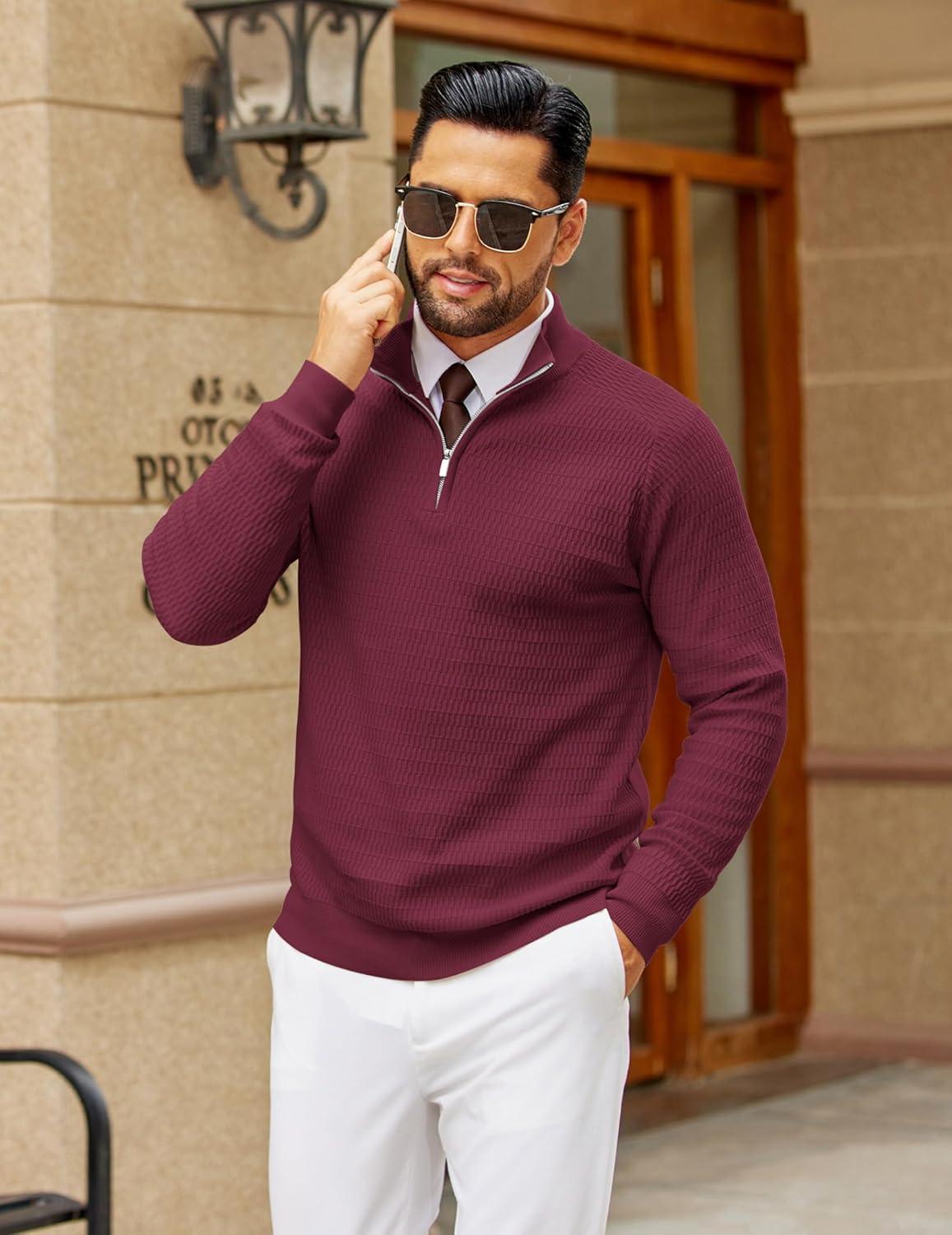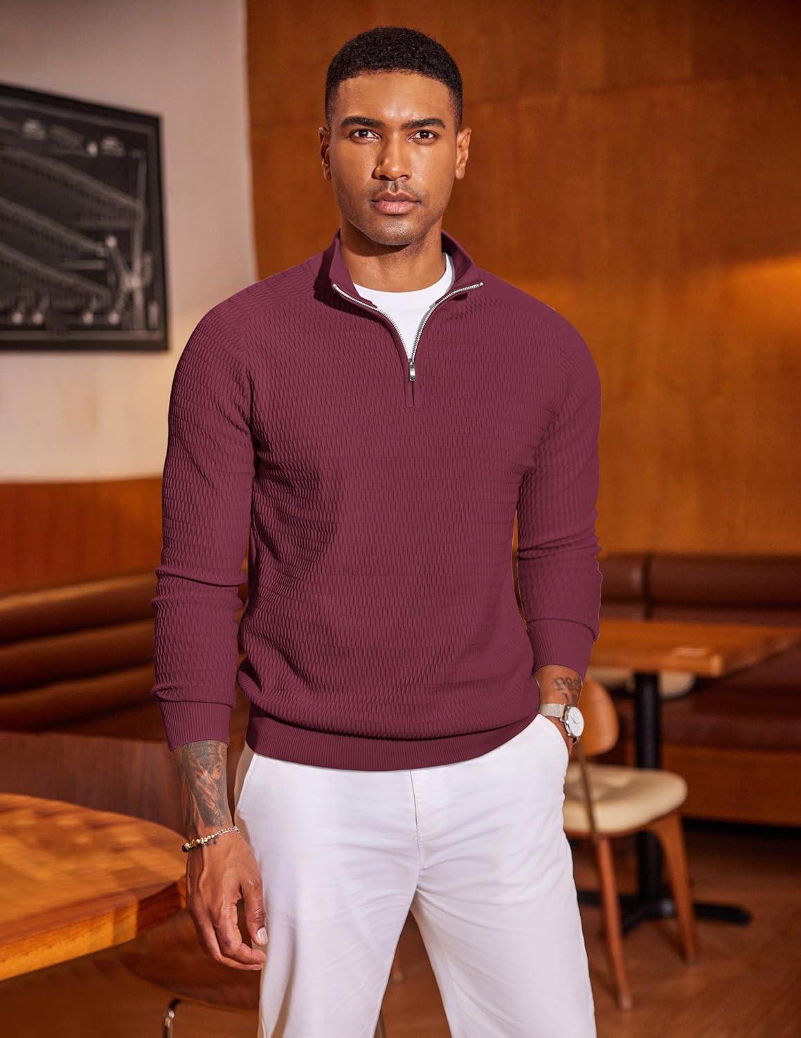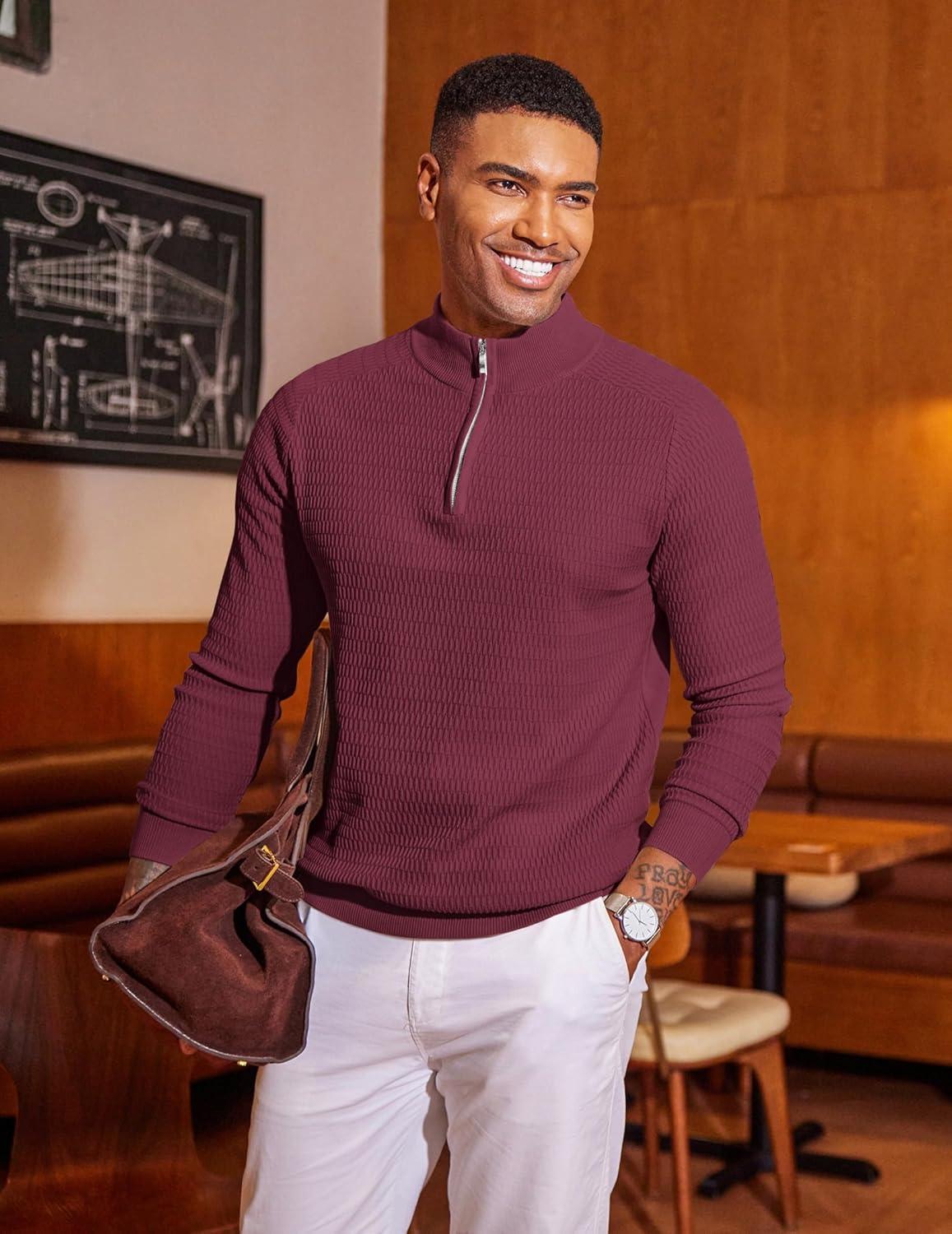COOFANDY Men's Quarter Zip Sweater Slim Fit Lightweight Mock Neck Pullover Knit Texture Polo Sweaters(Wine Red)