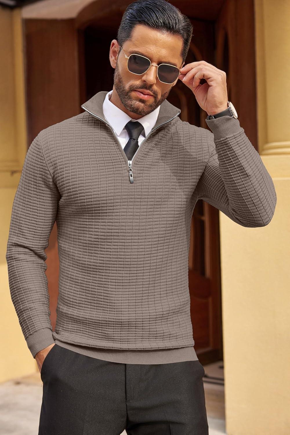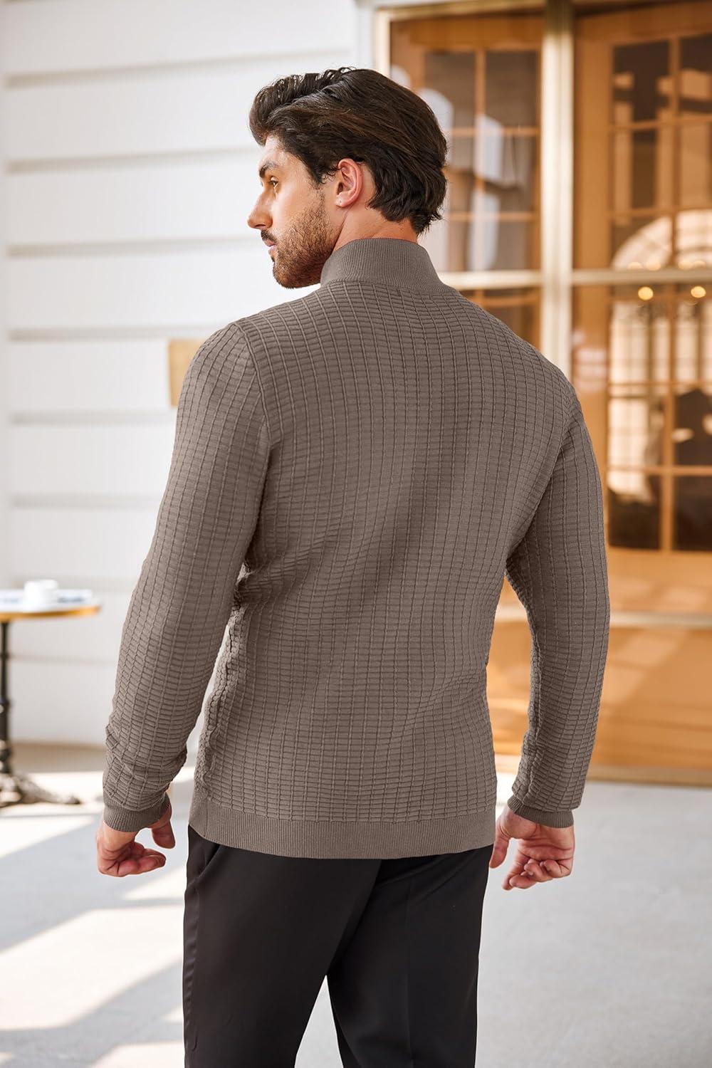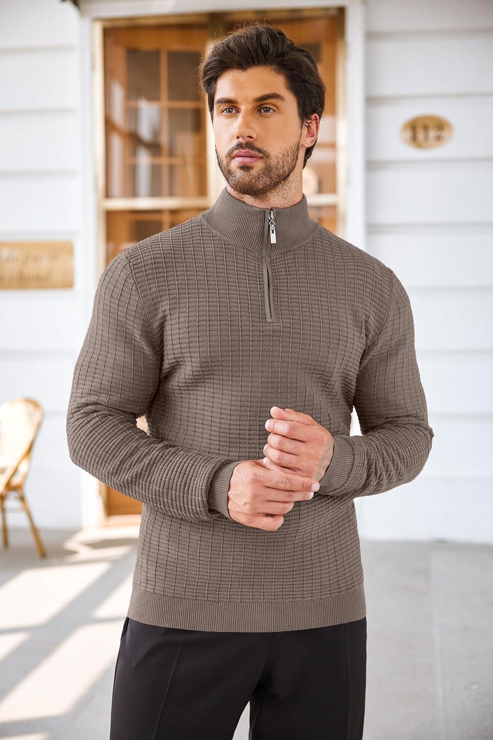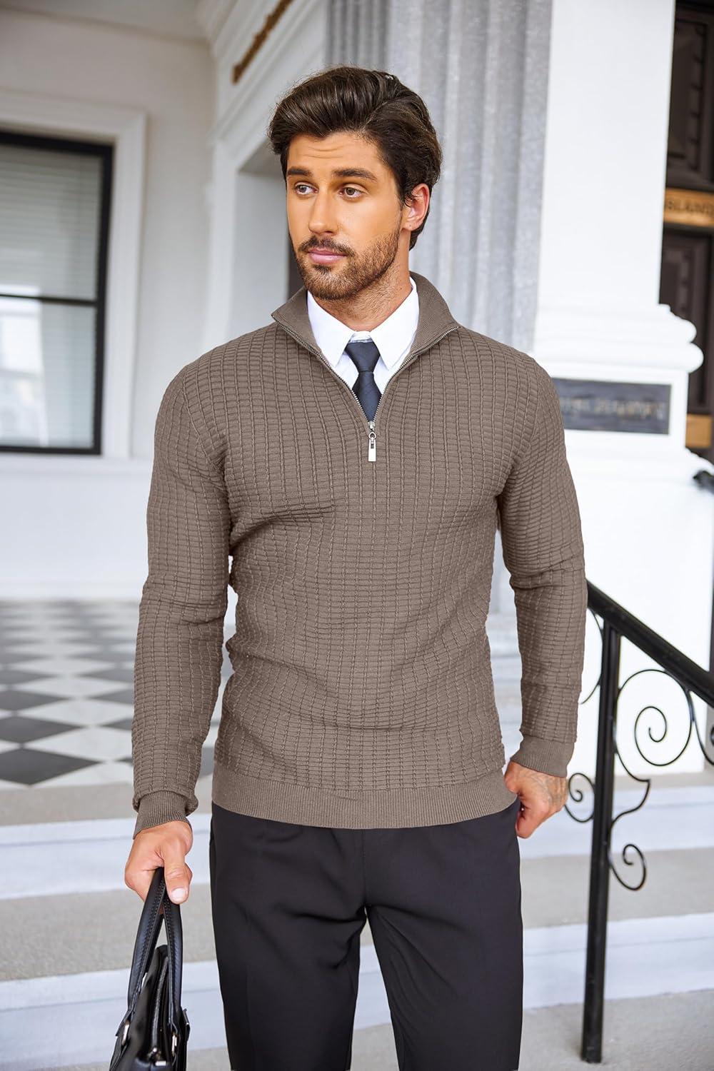 COOFANDY Men’s Quarter Zip Sweaters Slim Fit Lightweight Cotton Knitted Casual Mock Neck Pullover Sweaters(Brown)