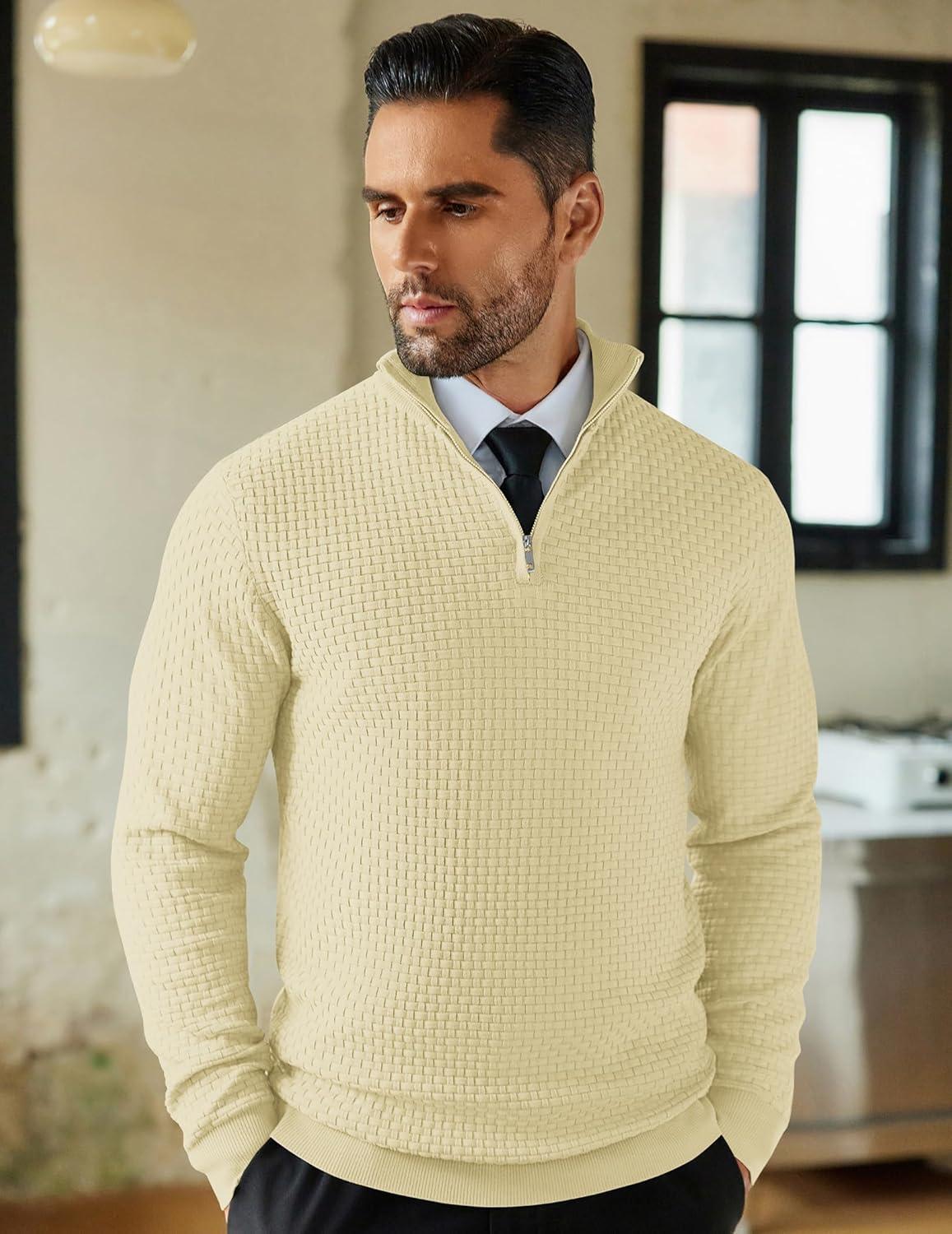 COOFANDY Men’s Quarter Zip Sweaters Slim Fit Lightweight Knitted Mock Neck Pullover Casual Polo Sweaters(Beige)