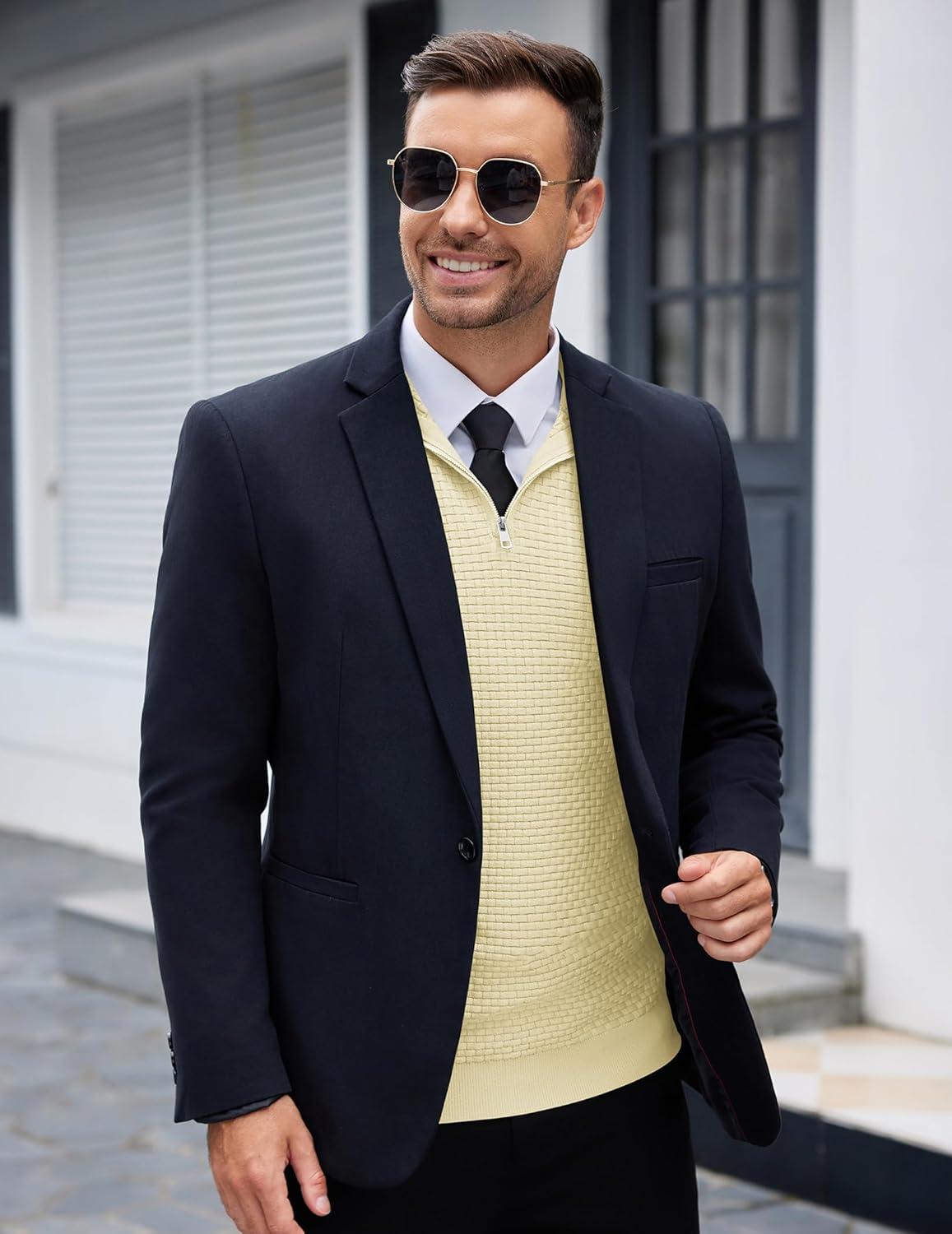 COOFANDY Men’s Quarter Zip Sweaters Slim Fit Lightweight Knitted Mock Neck Pullover Casual Polo Sweaters(Dark Blue)