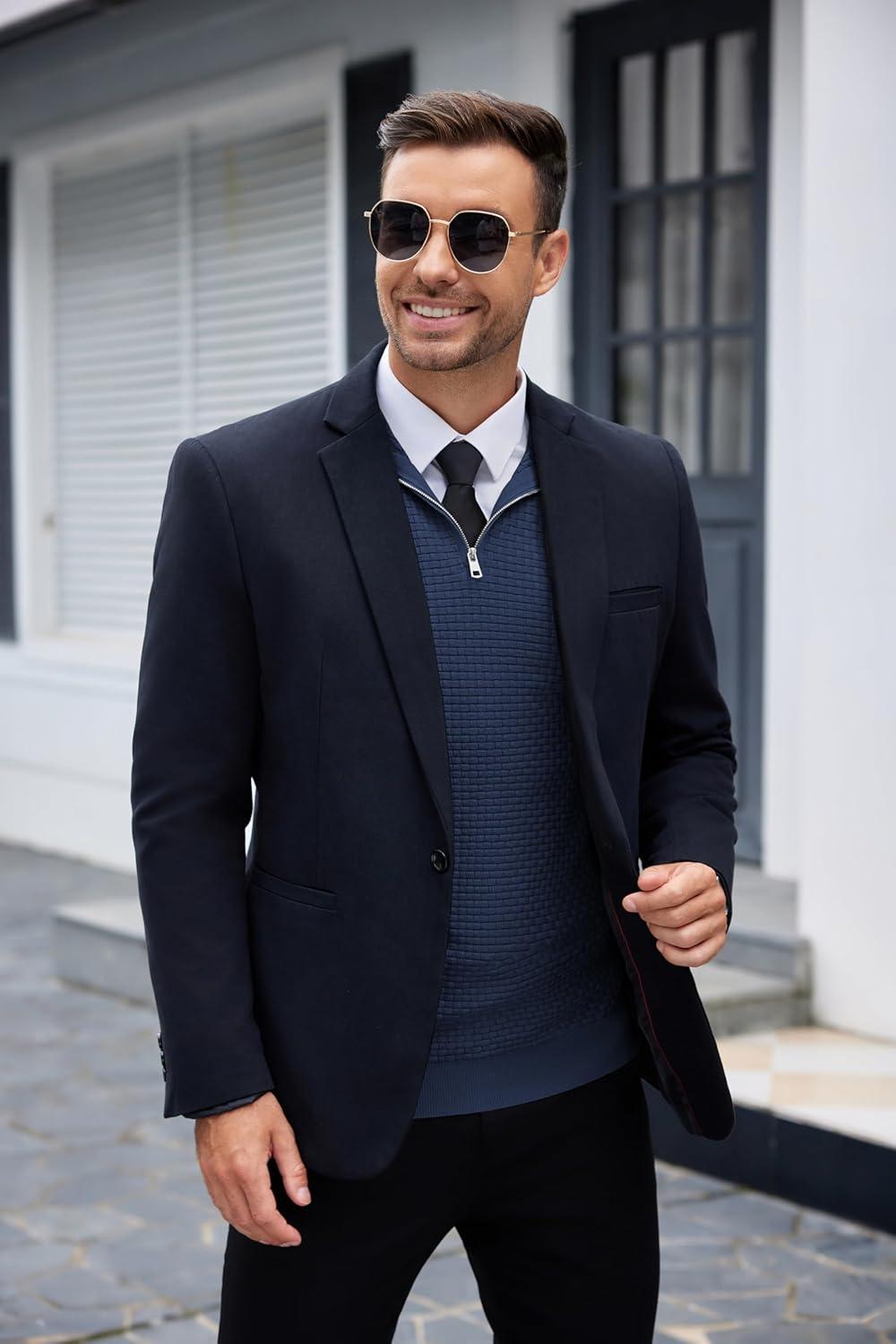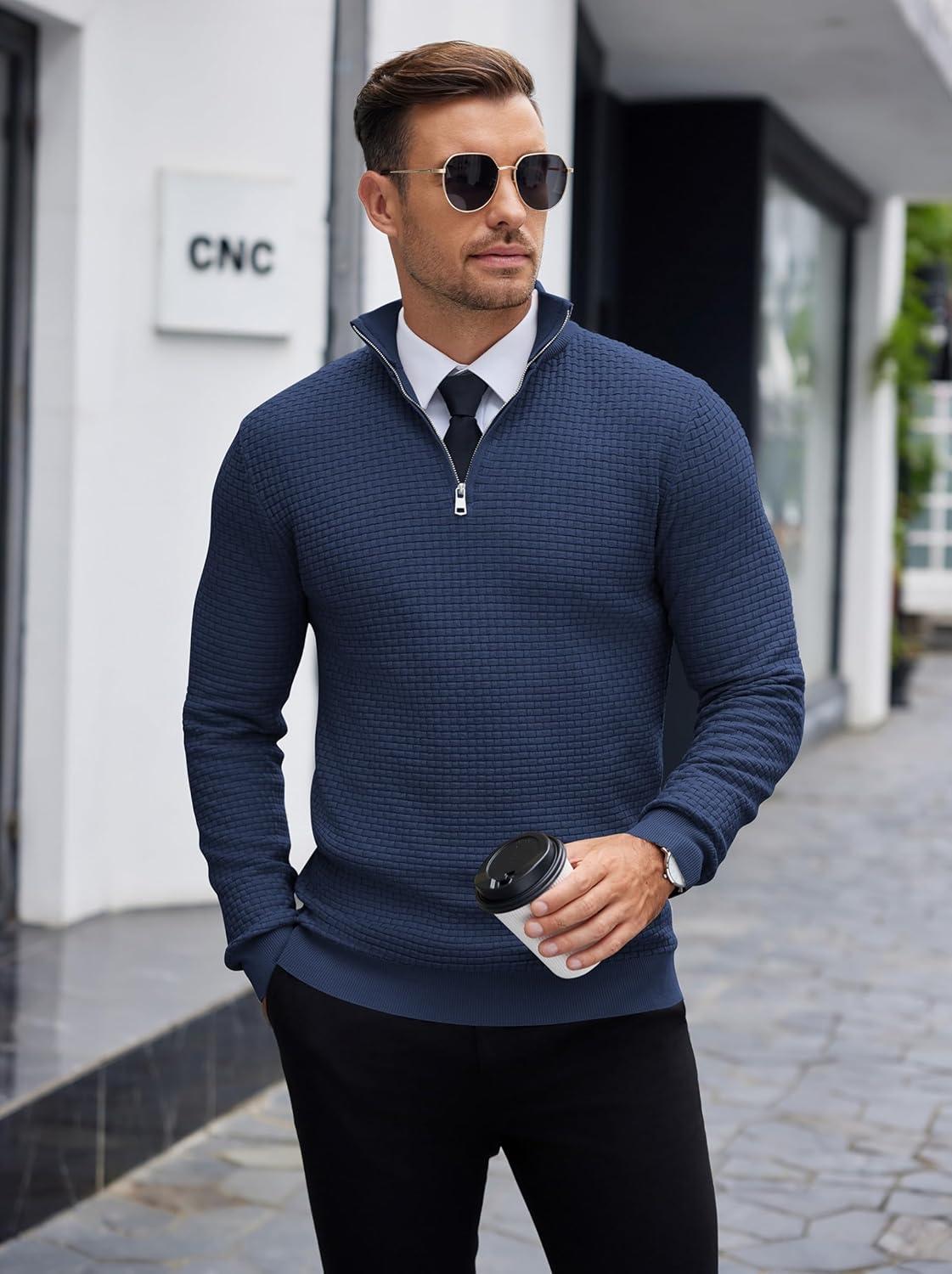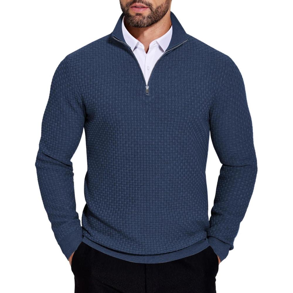 COOFANDY Men’s Quarter Zip Sweaters Slim Fit Lightweight Knitted Mock Neck Pullover Casual Polo Sweaters(Navy Blue)