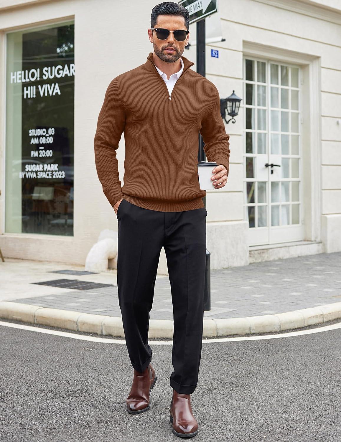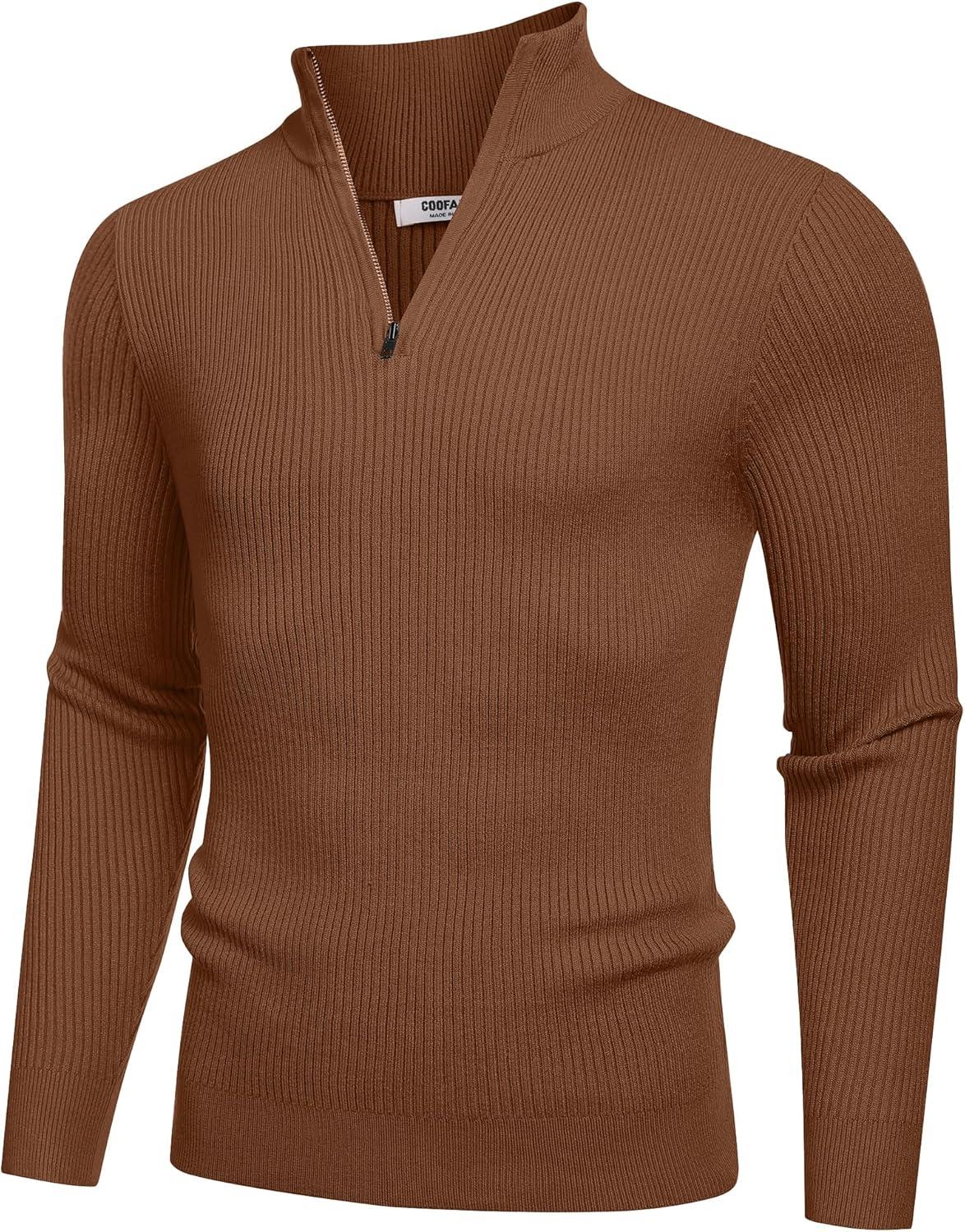 COOFANDY Men’s Quarter Zip Sweaters Slim Fit Mock Neck Pullover Sweaters Lightweight Knitted Polo Sweater(Brown)