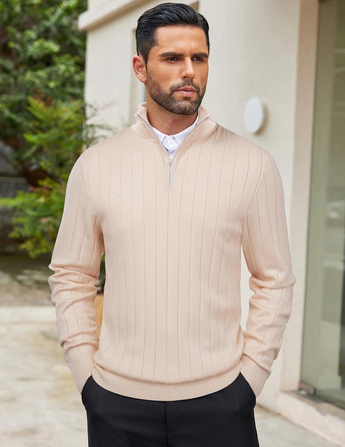 COOFANDY Men’s Quarter Zip Sweaters Slim Fit Mock Neck Pullover Sweaters Lightweight Knitted Polo Sweater(Ribbed Beige)