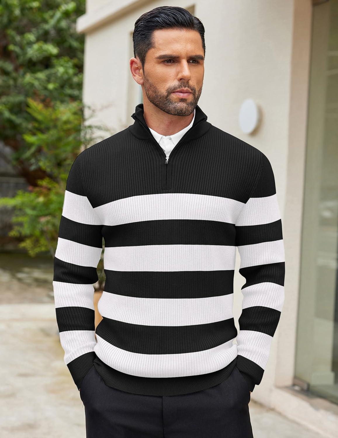 COOFANDY Men's Quarter Zip Sweaters Slim Fit Mock Neck Pullover Sweaters Lightweight Knitted Polo Sweater(Stripe Black & White)