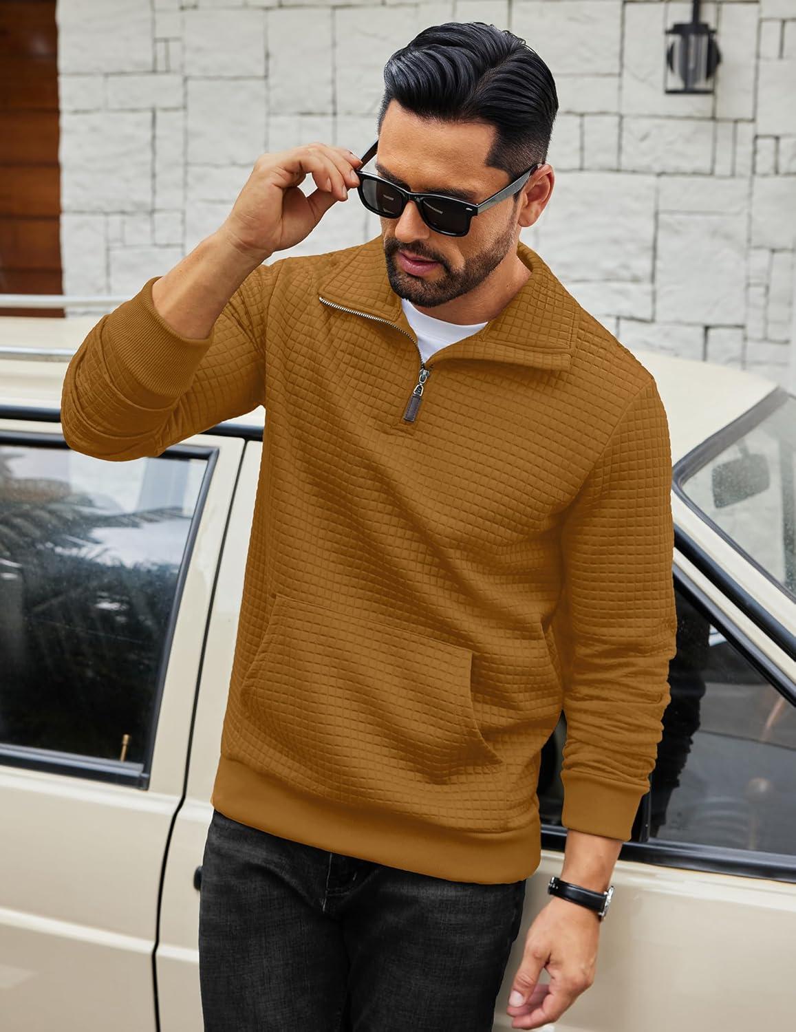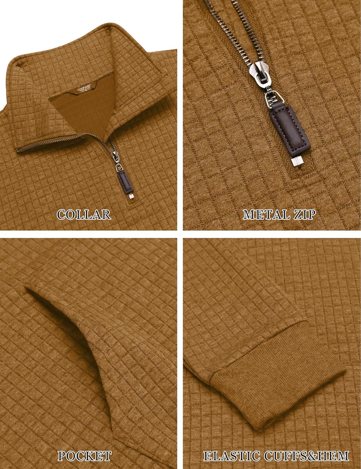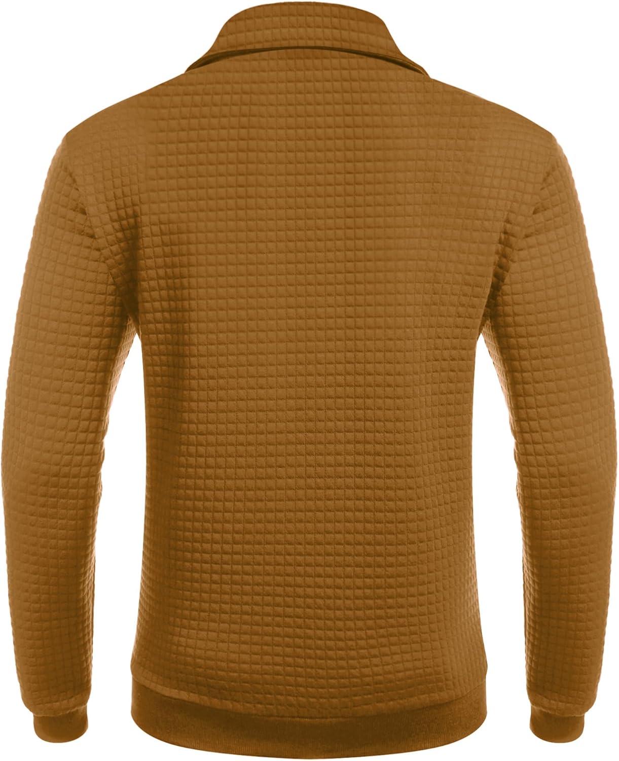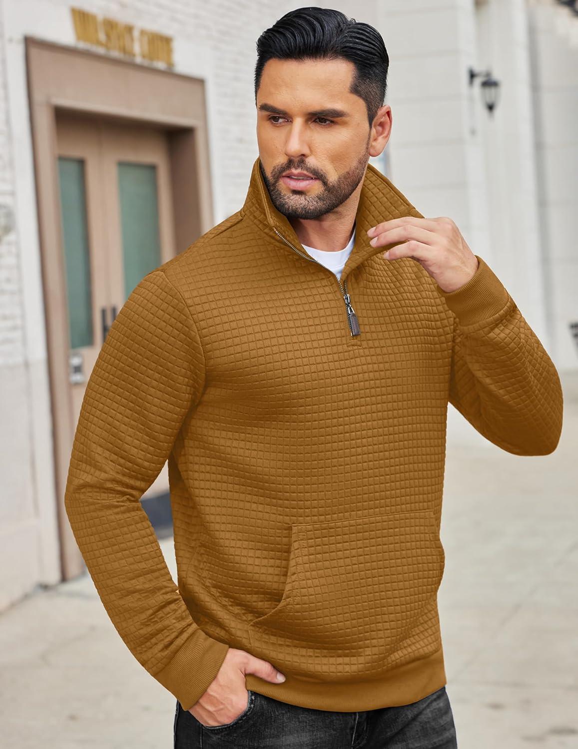 COOFANDY Mens Quarter Zip Sweatshirt Long Sleeve Casual Waffle Pullover Hoodies with Pocket(Brown)