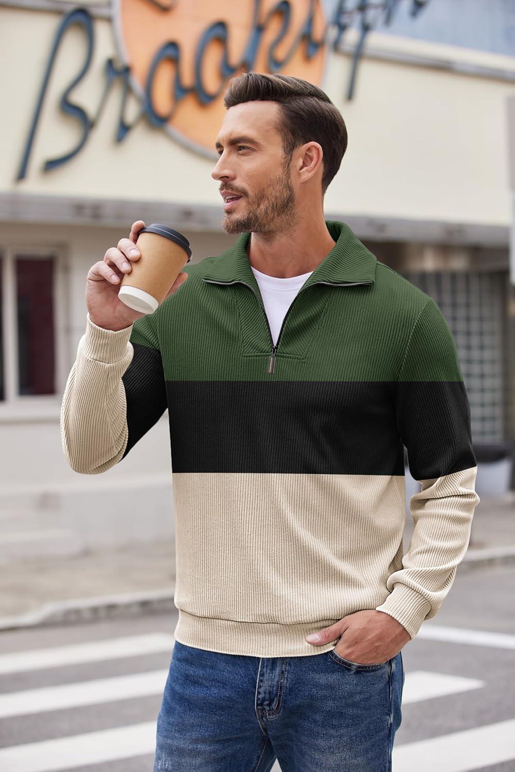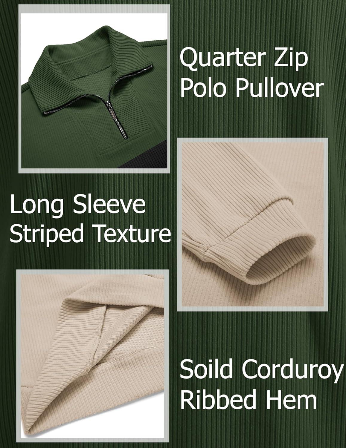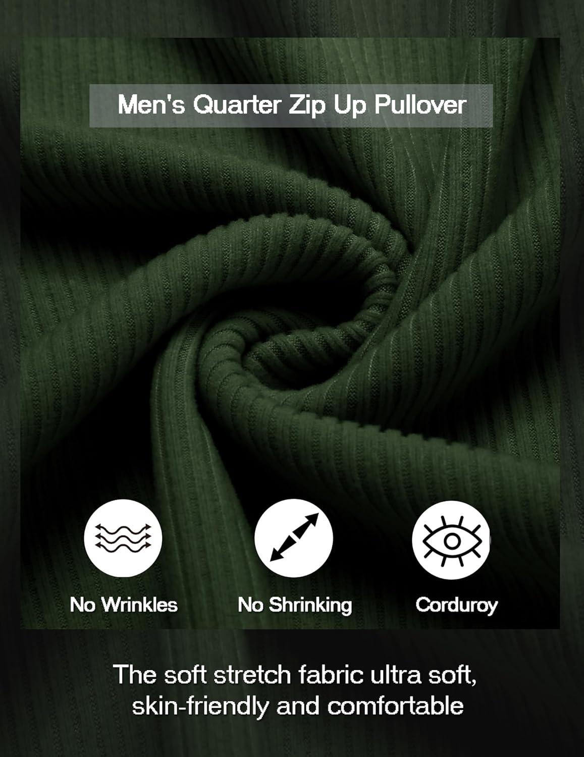 COOFANDY Men’s Quarter Zip Up Pullover Mock Neck Long Sleeve Sweater Casual Corduroy Polo Sweatshirt(Green Black Khaki)