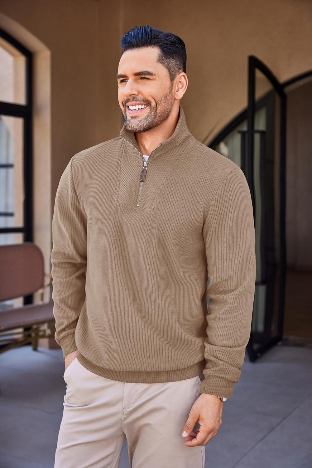 COOFANDY Men's Quarter Zip Up Pullover Mock Neck Long Sleeve Sweater Casual Corduroy Polo Sweatshirt(Khaki)