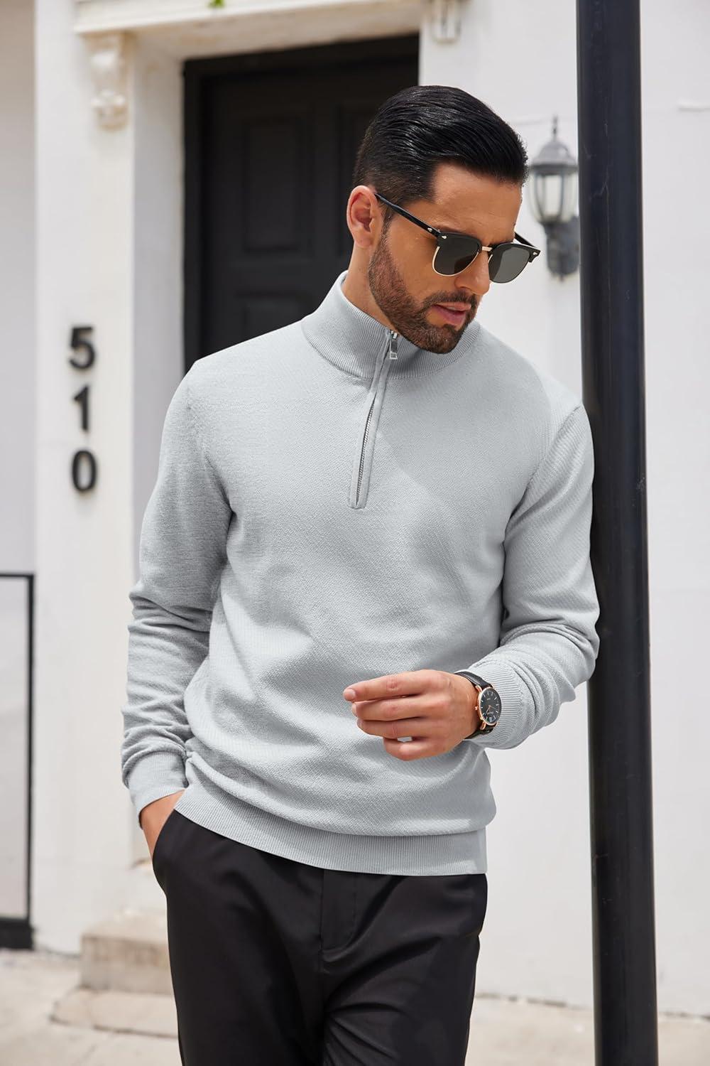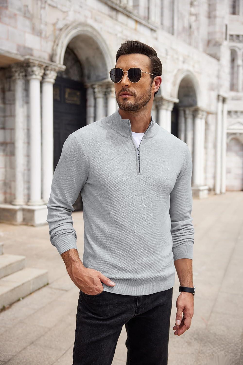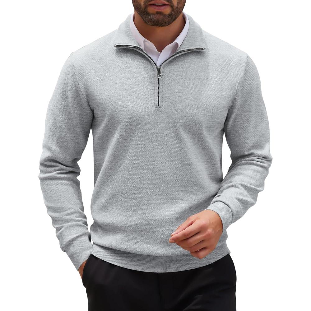 COOFANDY Men’s Quarter Zip Up Sweaters Slim Fit Casual Long Sleeve Knitted Mock Neck Pullover Sweaters(Light Grey)