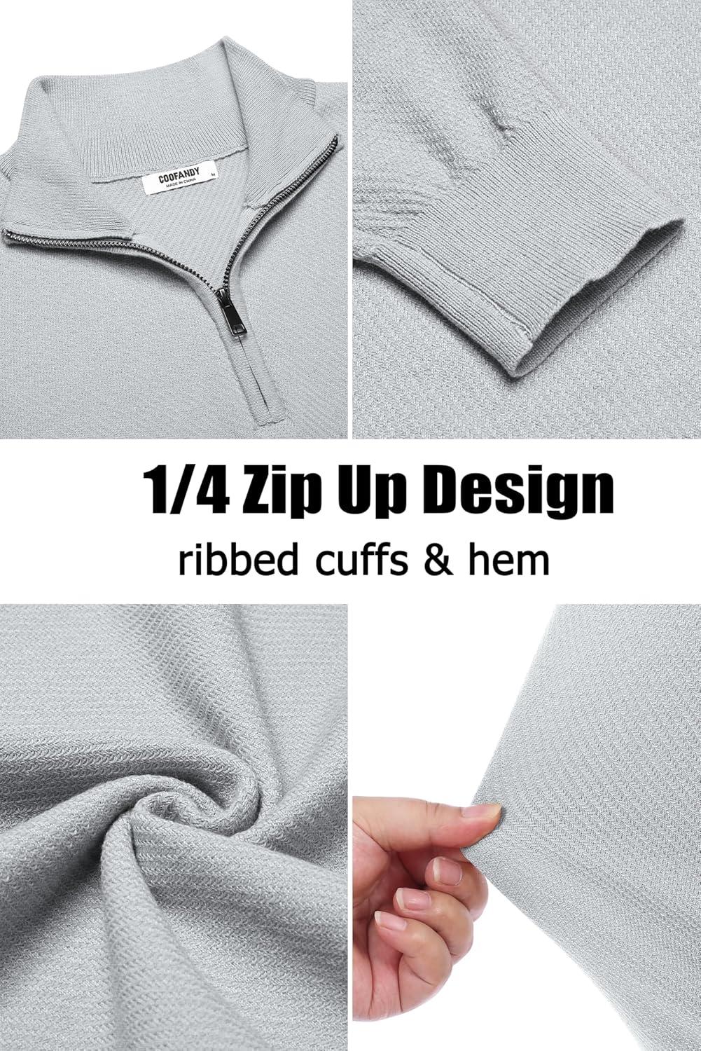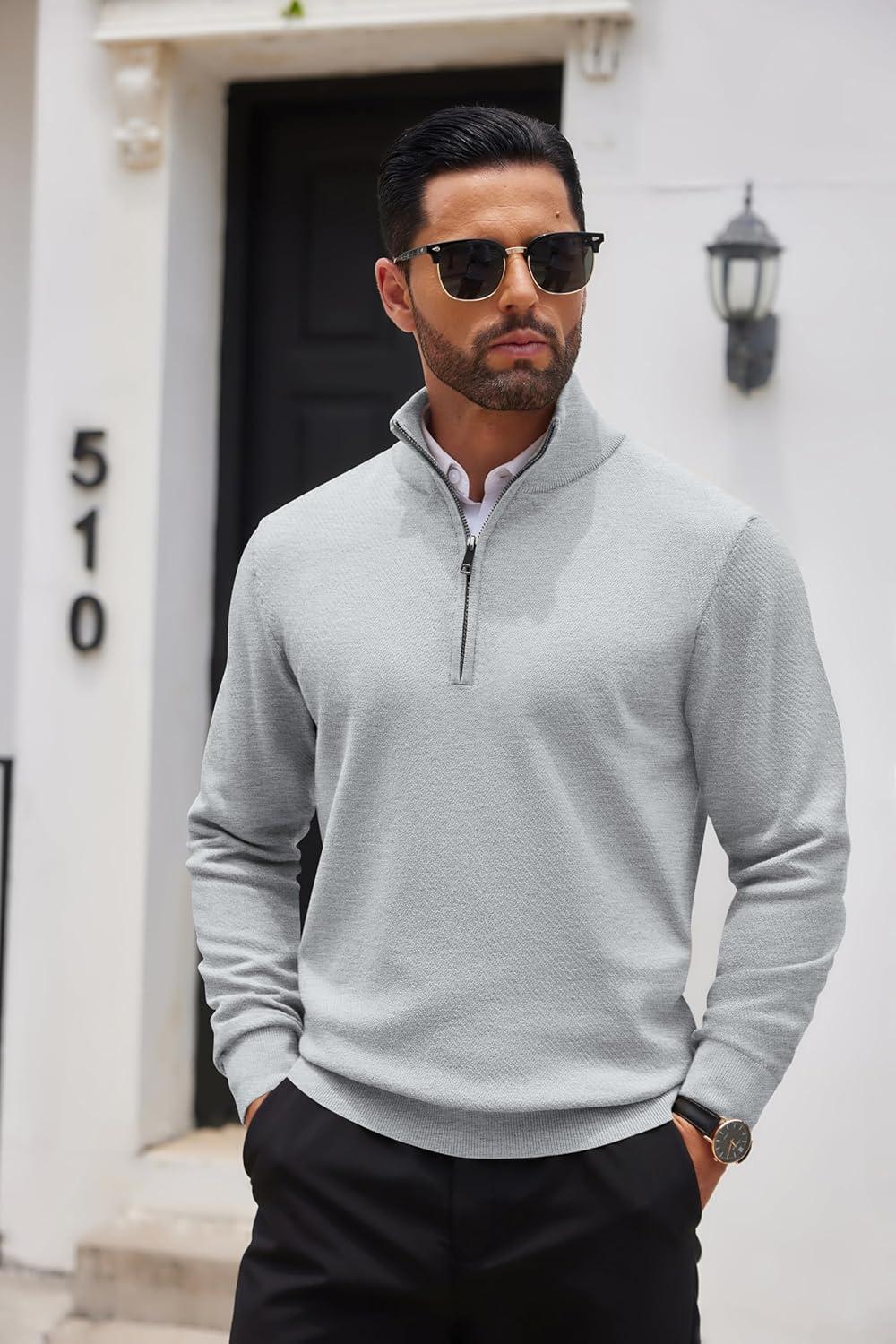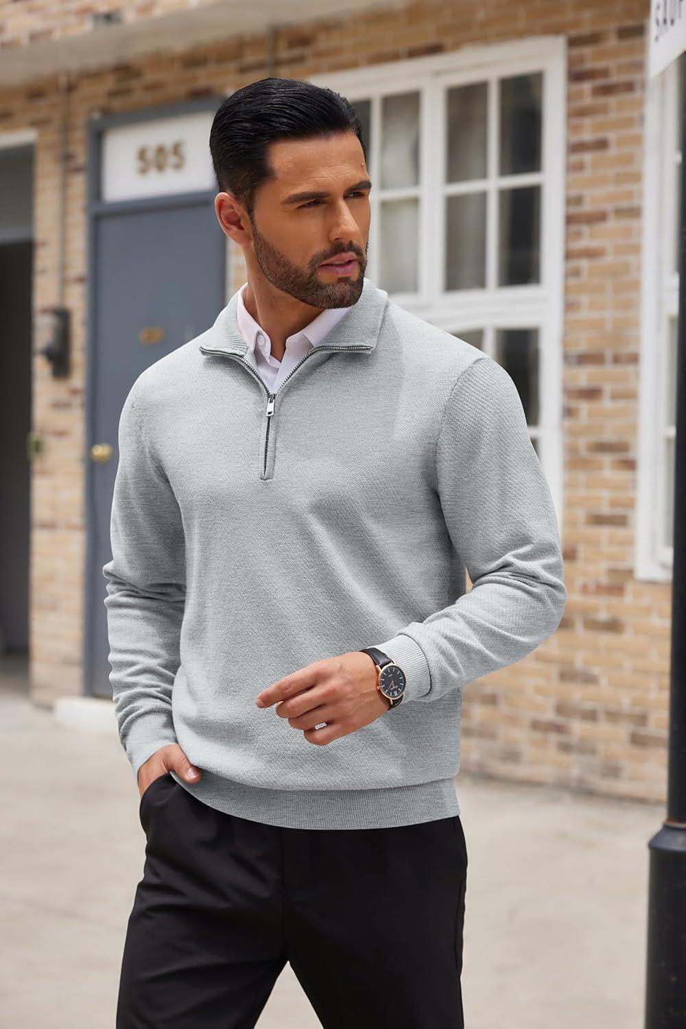 COOFANDY Men’s Quarter Zip Up Sweaters Slim Fit Casual Long Sleeve Knitted Mock Neck Pullover Sweaters(Light Grey)