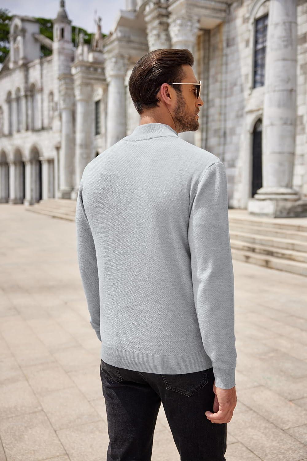 COOFANDY Men's Quarter Zip Up Sweaters Slim Fit Casual Long Sleeve Knitted Mock Neck Pullover Sweaters(Light Grey)