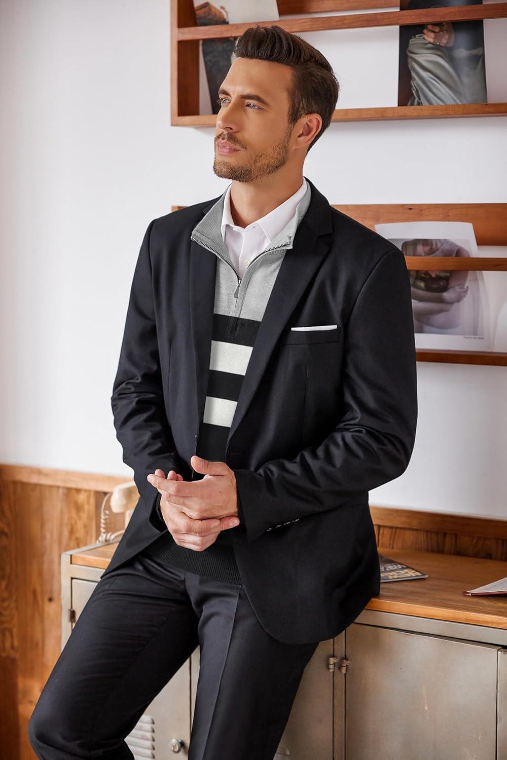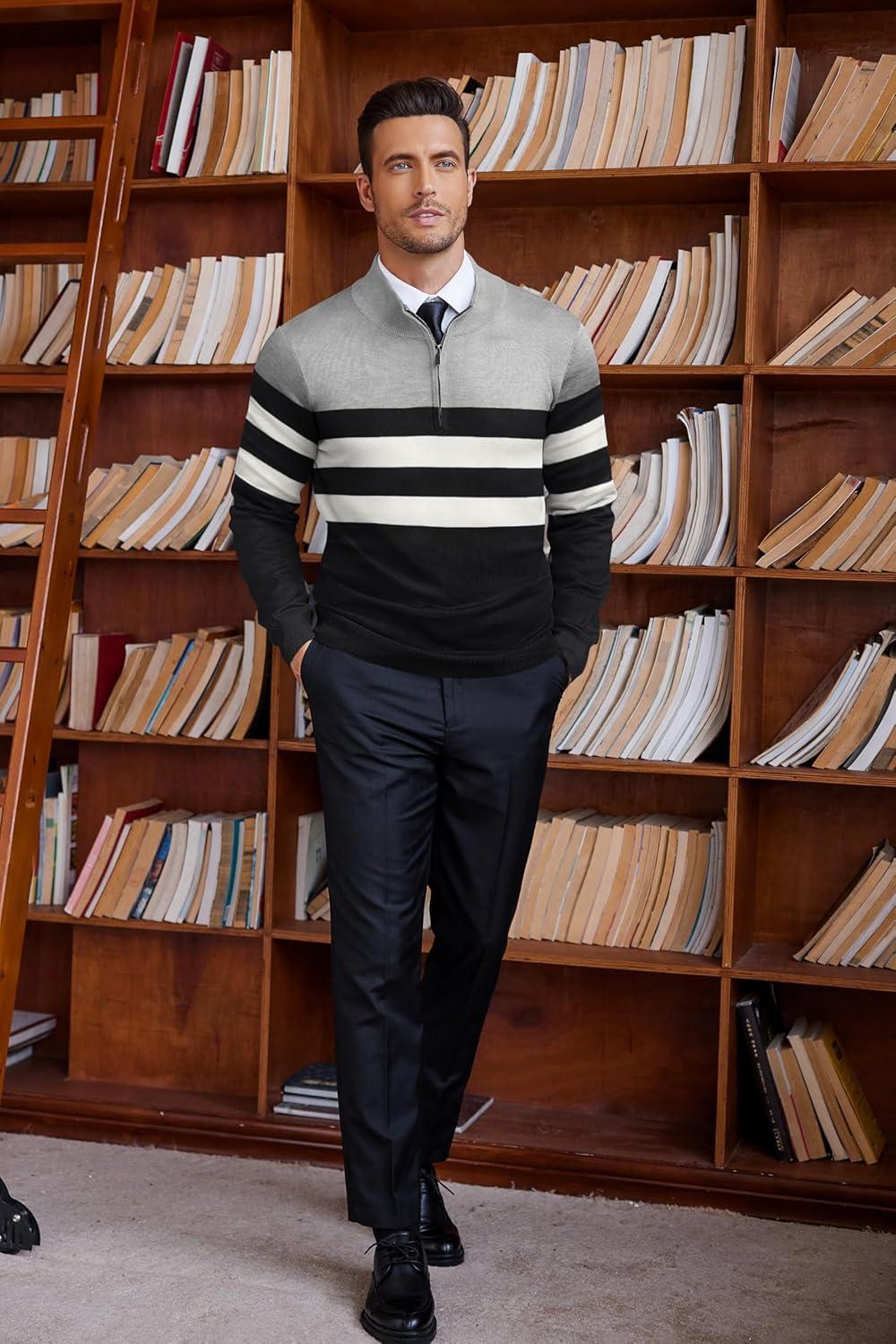 COOFANDY Men's Quarter Zip Up Sweaters Slim Fit Lightweight Mock Neck Pullover Casual Polo Sweaters(Black & White & Grey Stripe)
