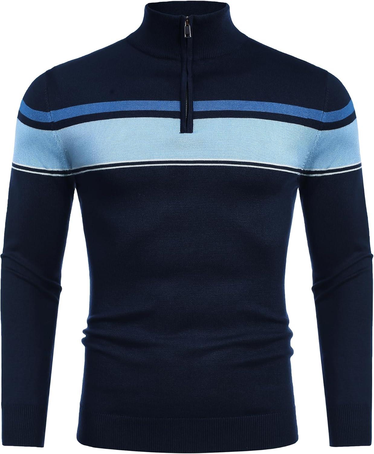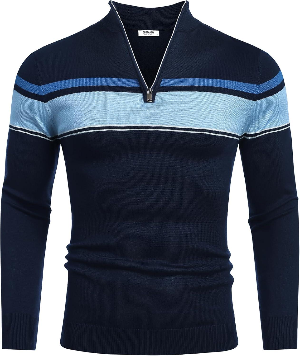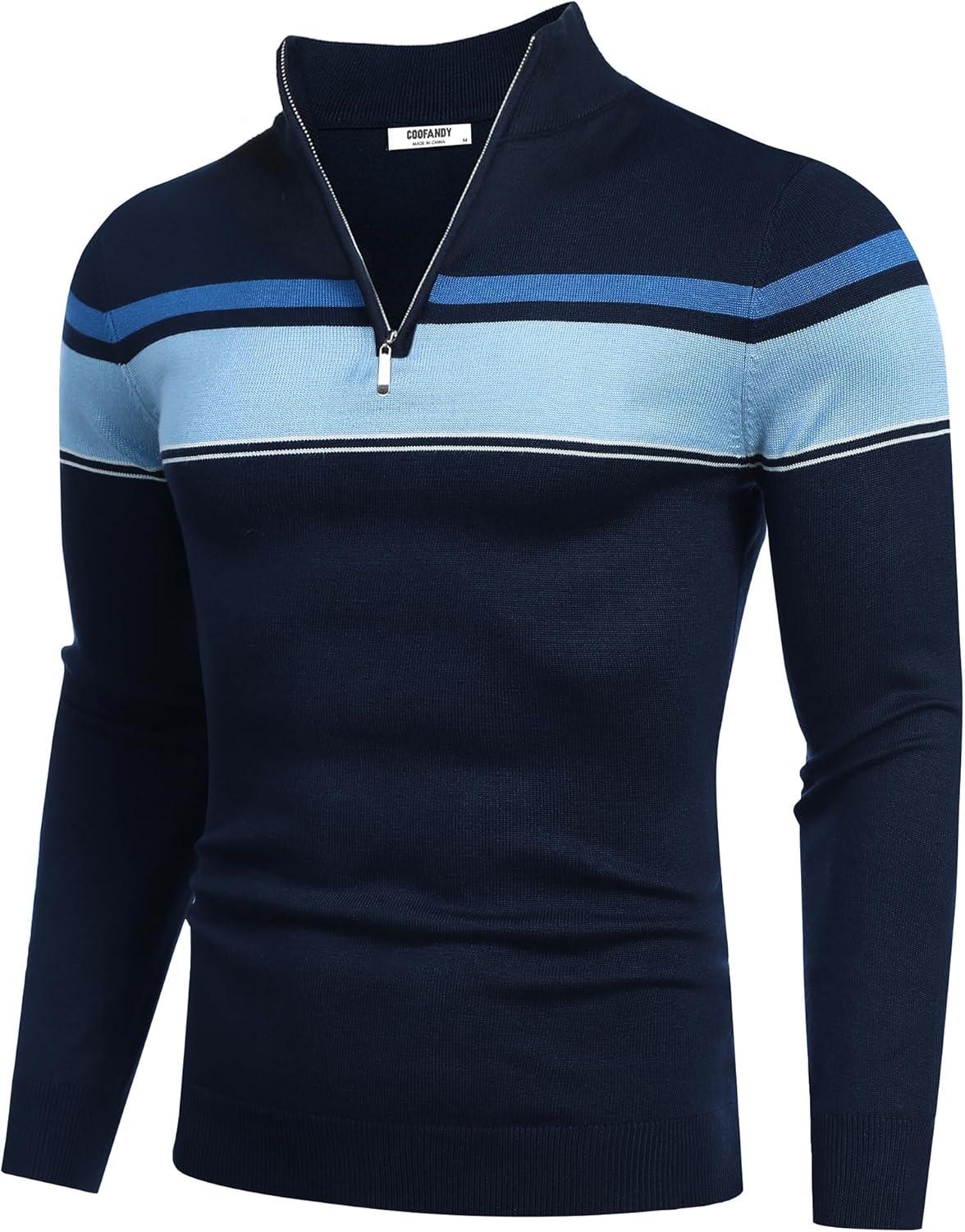 COOFANDY Men's Quarter Zip Up Sweaters Slim Fit Lightweight Mock Neck Pullover Casual Polo Sweaters(Stripe-blue)