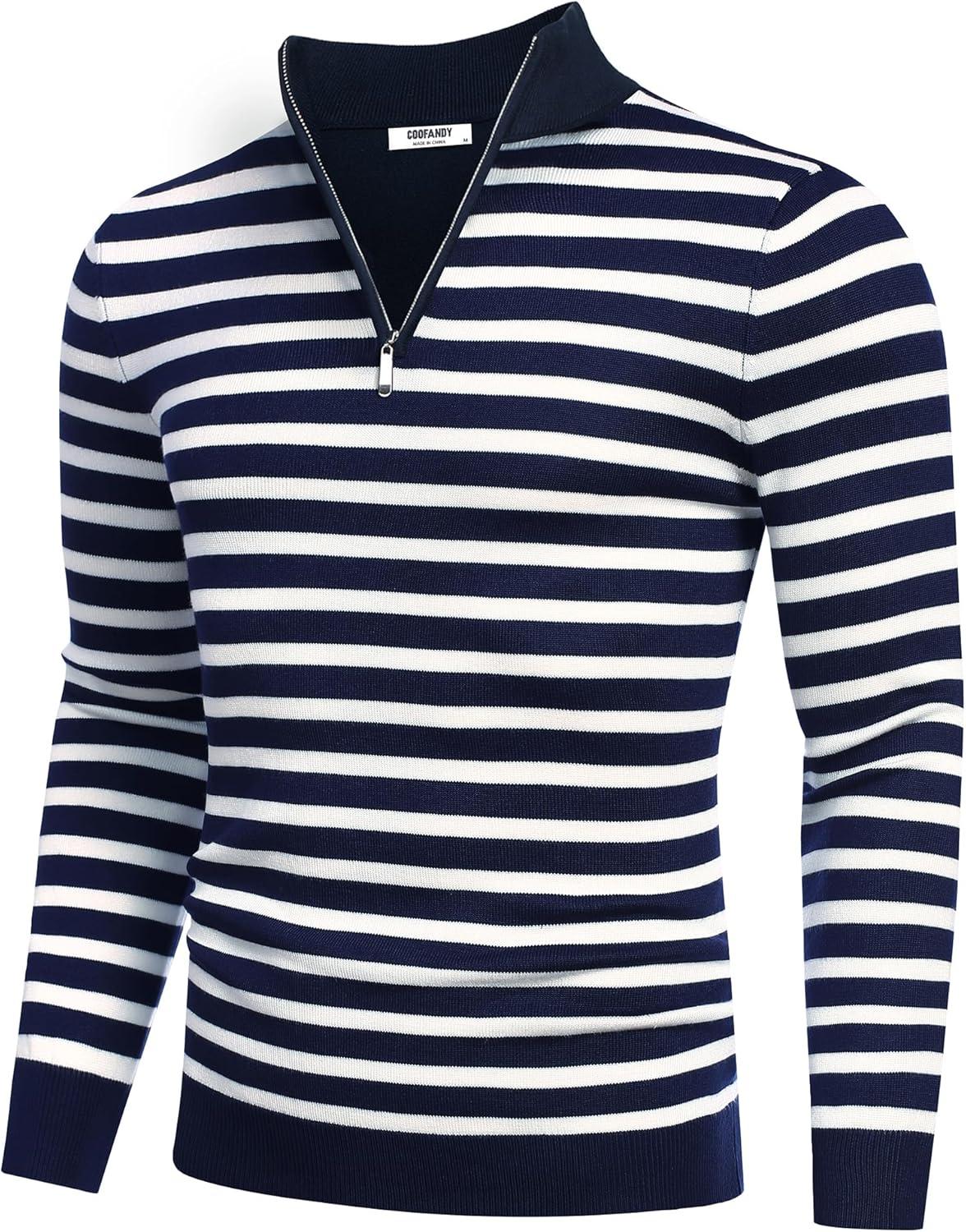 Don’t miss out on our limited-time offer: buy COOFANDY Men’s Quarter Zip Up Sweaters Slim Fit Lightweight Mock Neck Pullover Casual Polo Sweaters(Stripe-navy Blue White), get {accessory} 50% off!