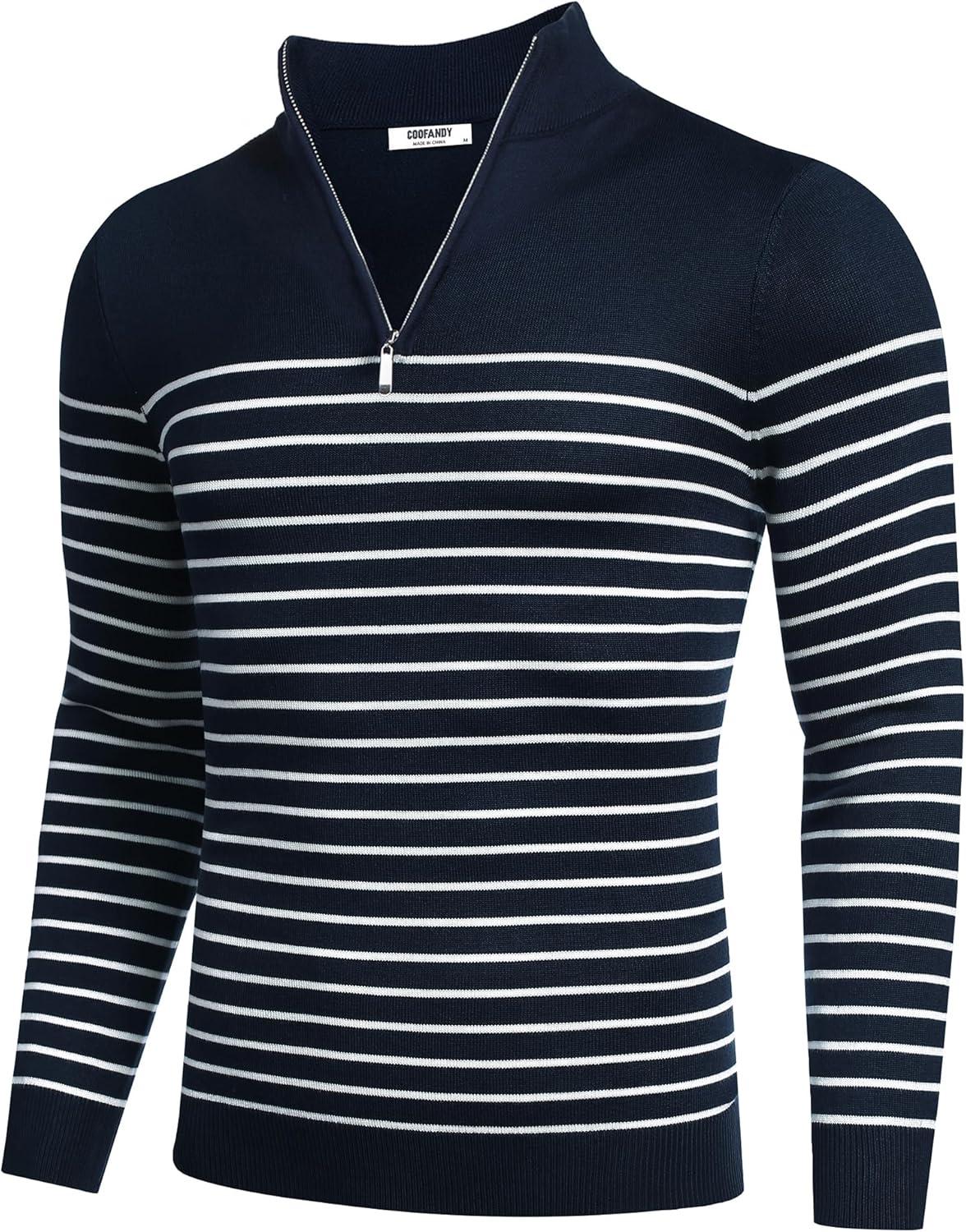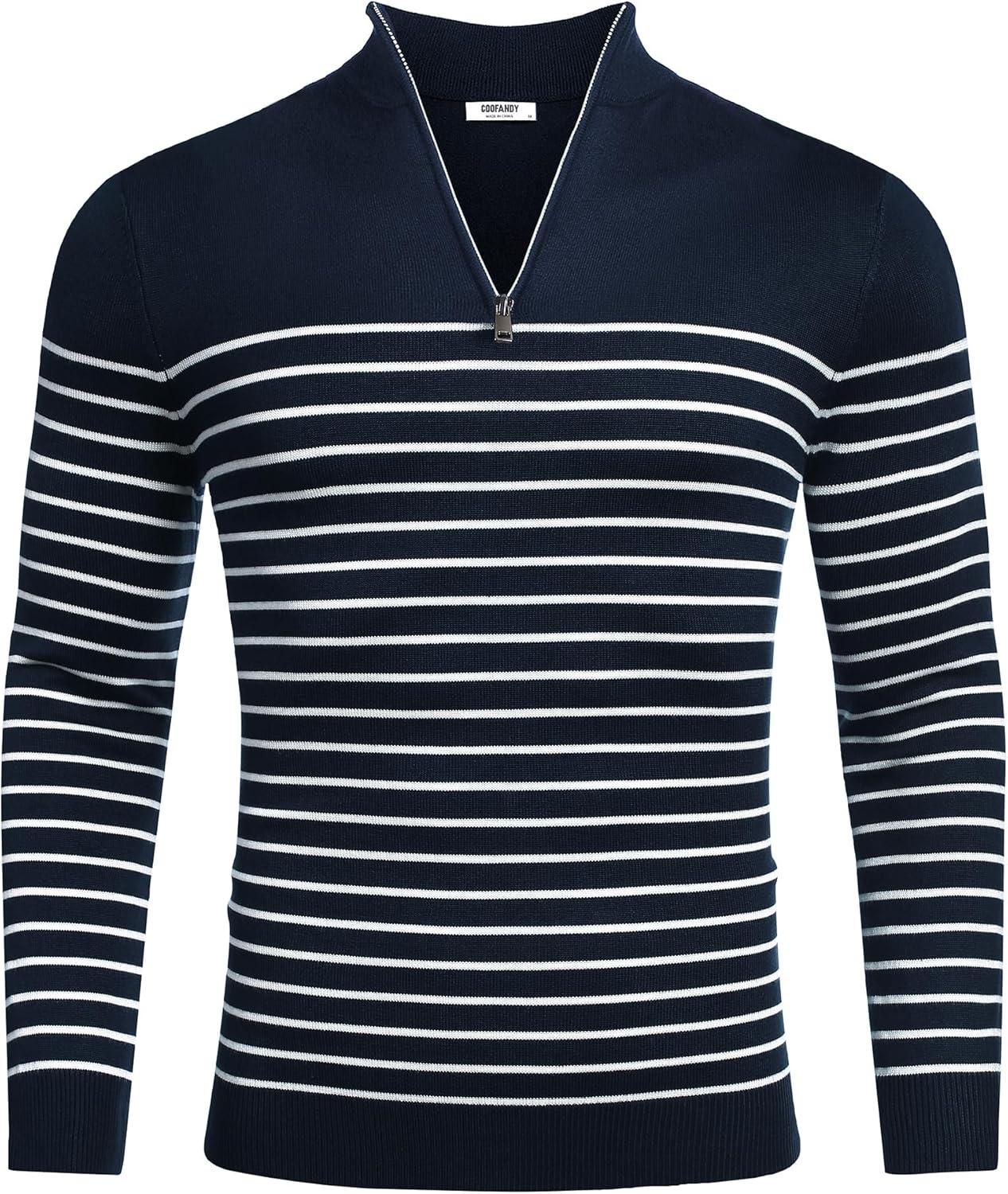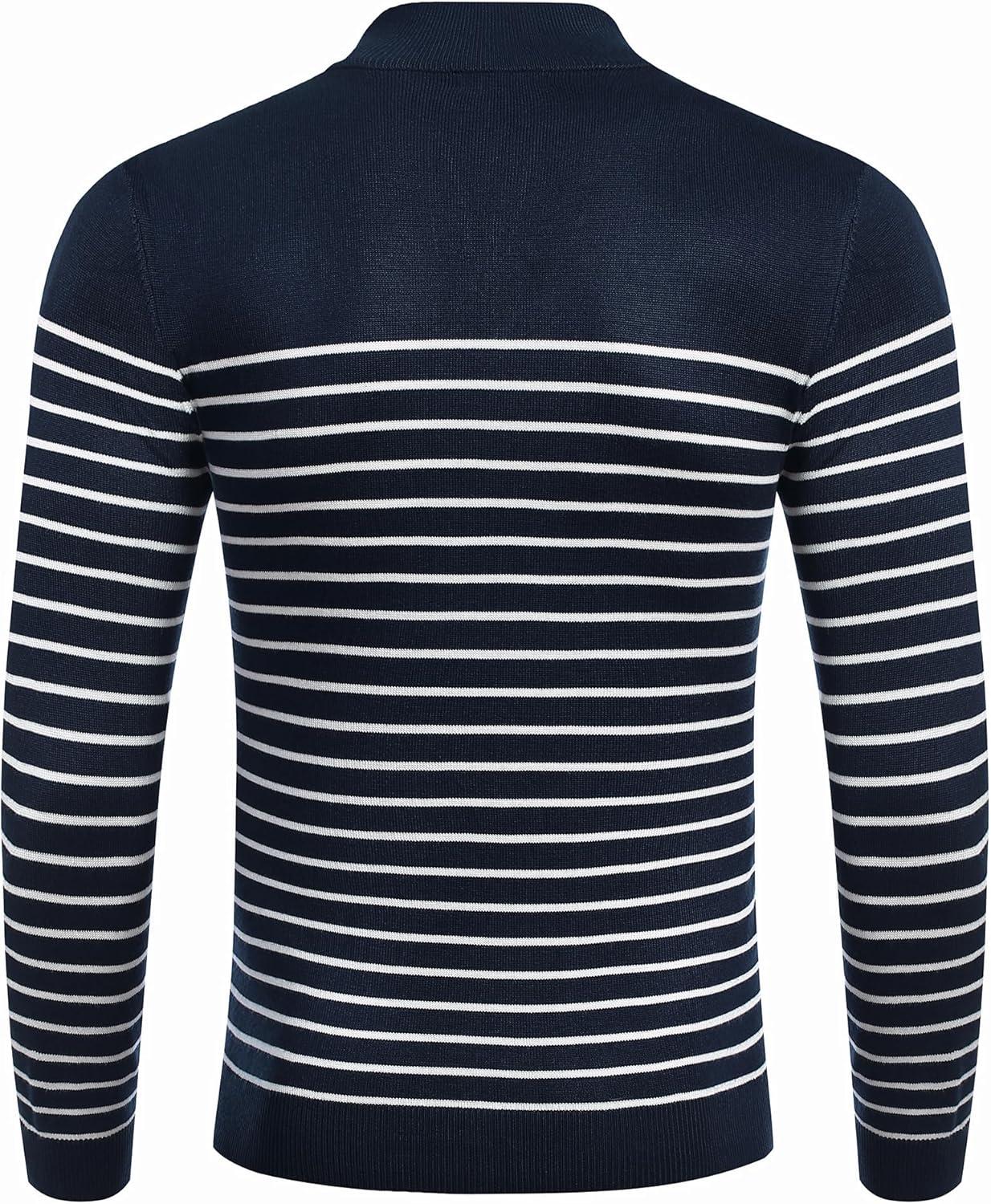 COOFANDY Men's Quarter Zip Up Sweaters Slim Fit Lightweight Mock Neck Pullover Casual Polo Sweaters(Stripe-white Navy)