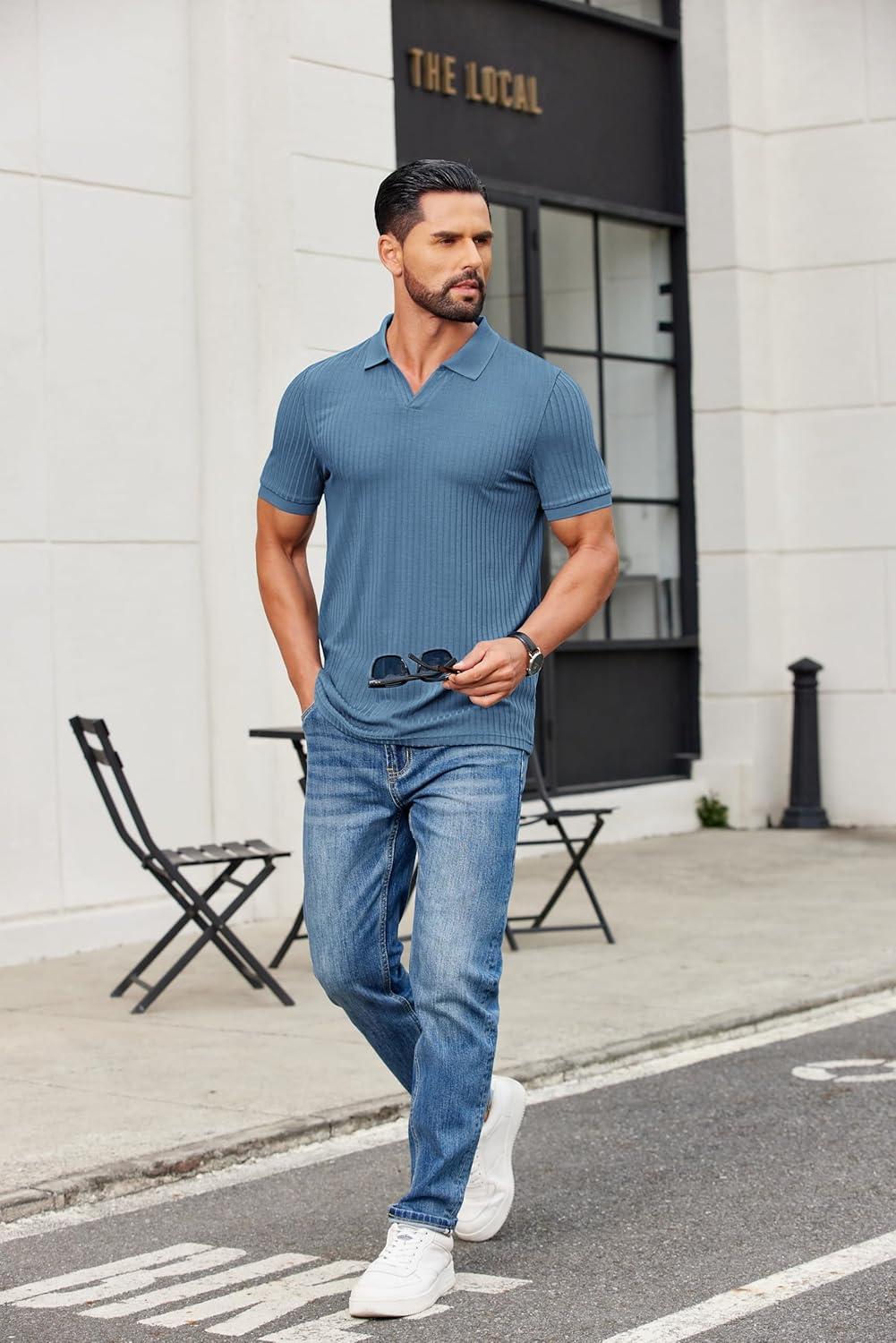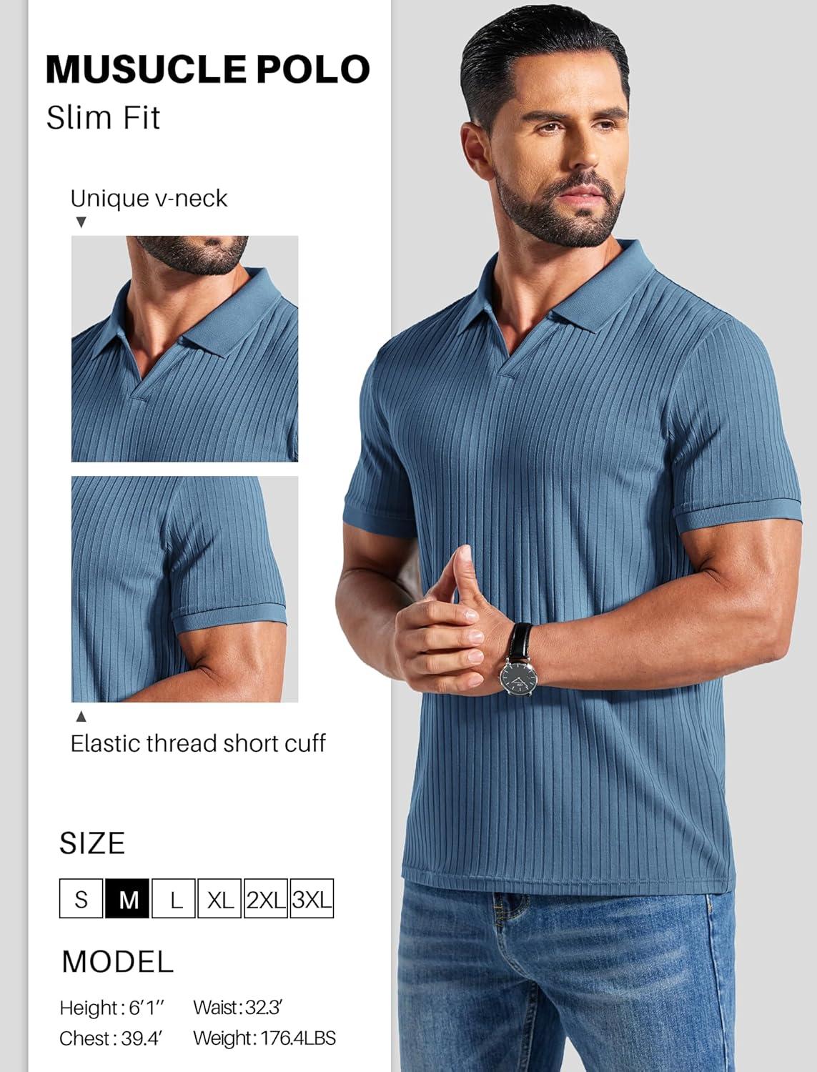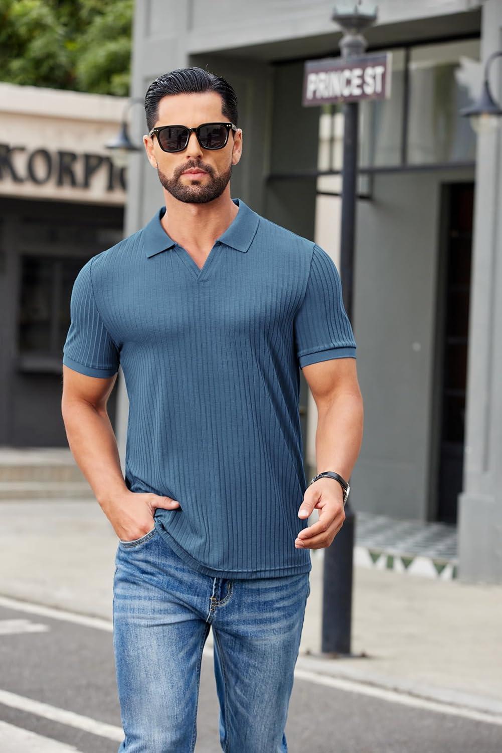 COOFANDY Men's Ribbed Polo Shirts Short Sleeve V Neck Slim Fit Polo T-Shirt Casual Summer Collared Golf Shirt(Gray Blue)
