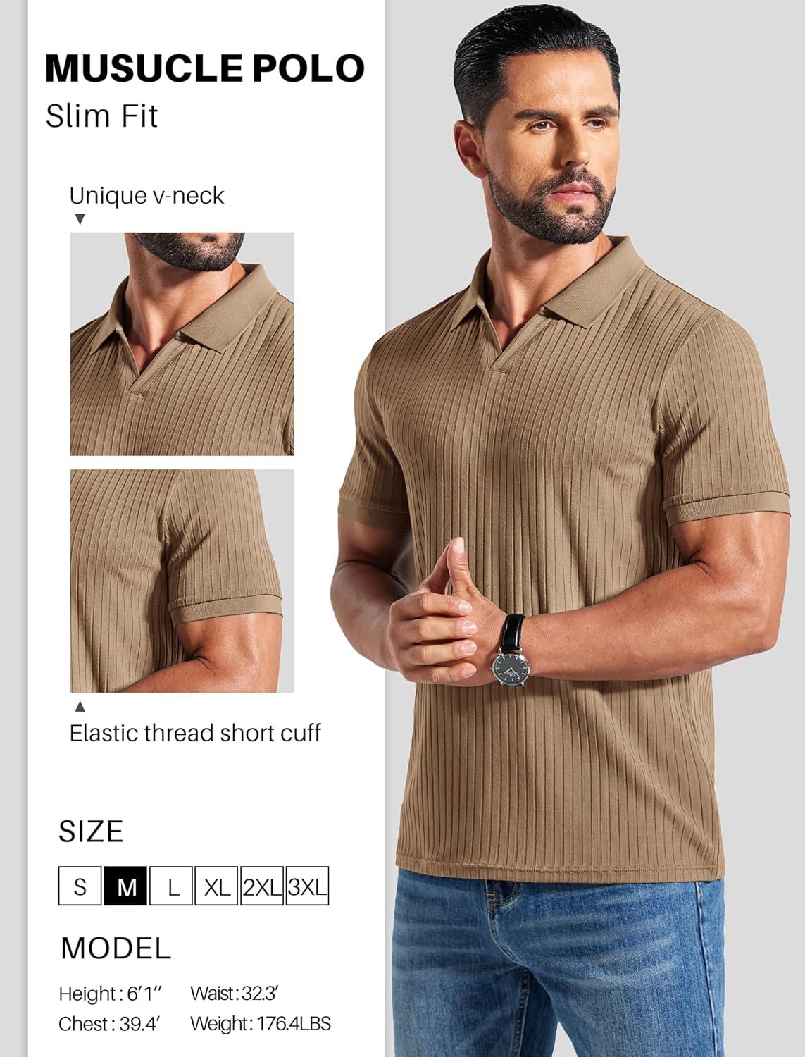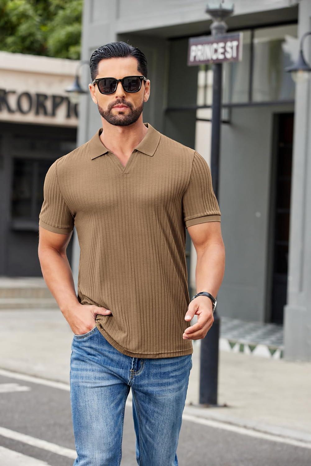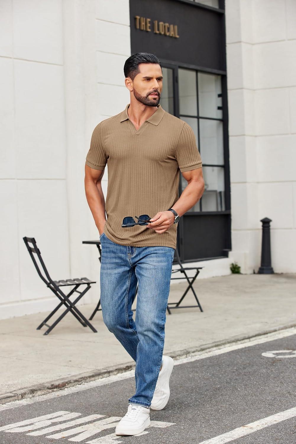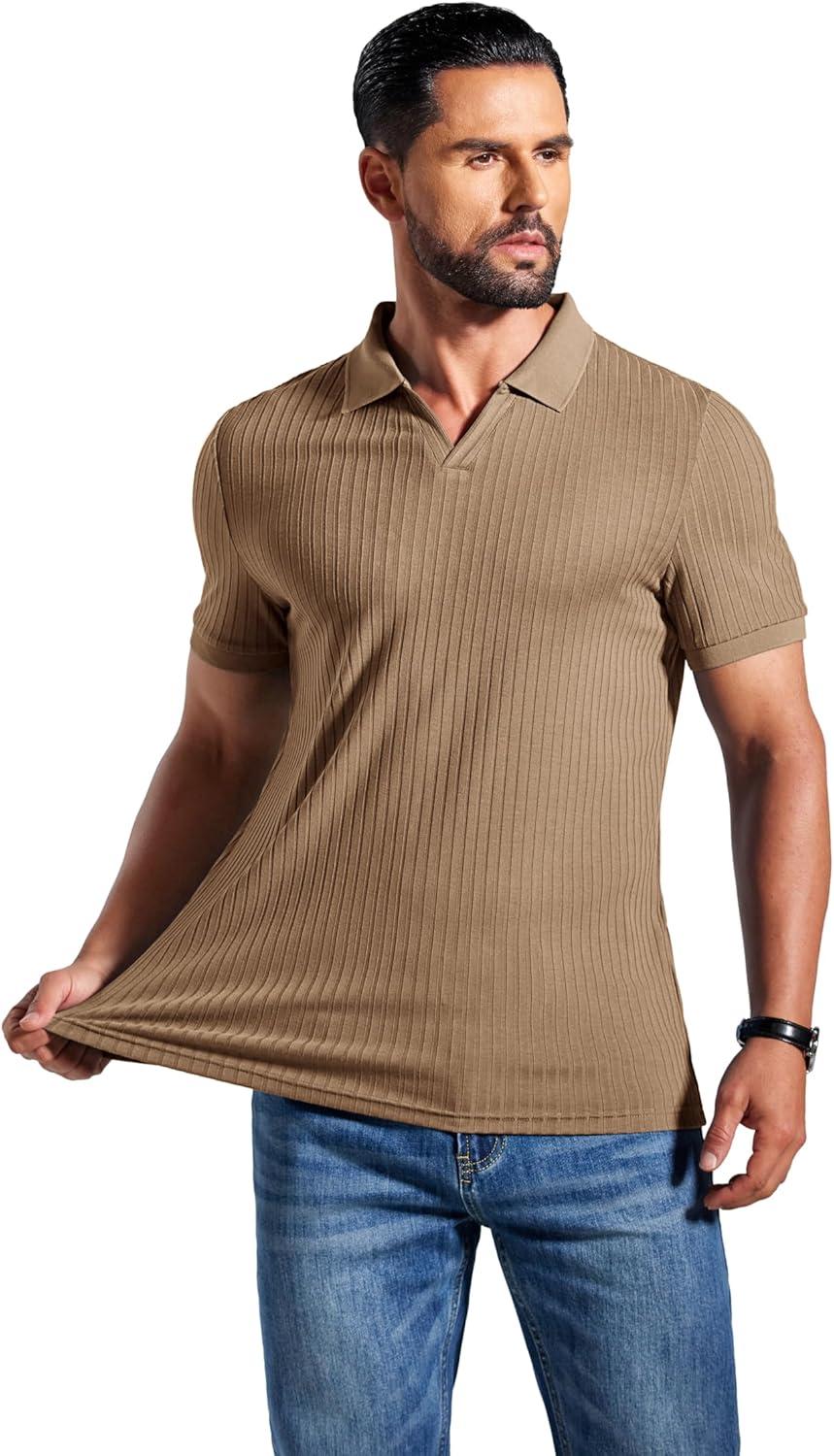COOFANDY Men's Ribbed Polo Shirts Short Sleeve V Neck Slim Fit Polo T-Shirt Casual Summer Collared Golf Shirt(Khaki)