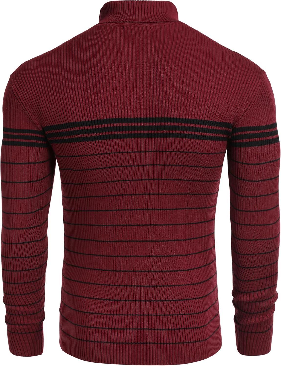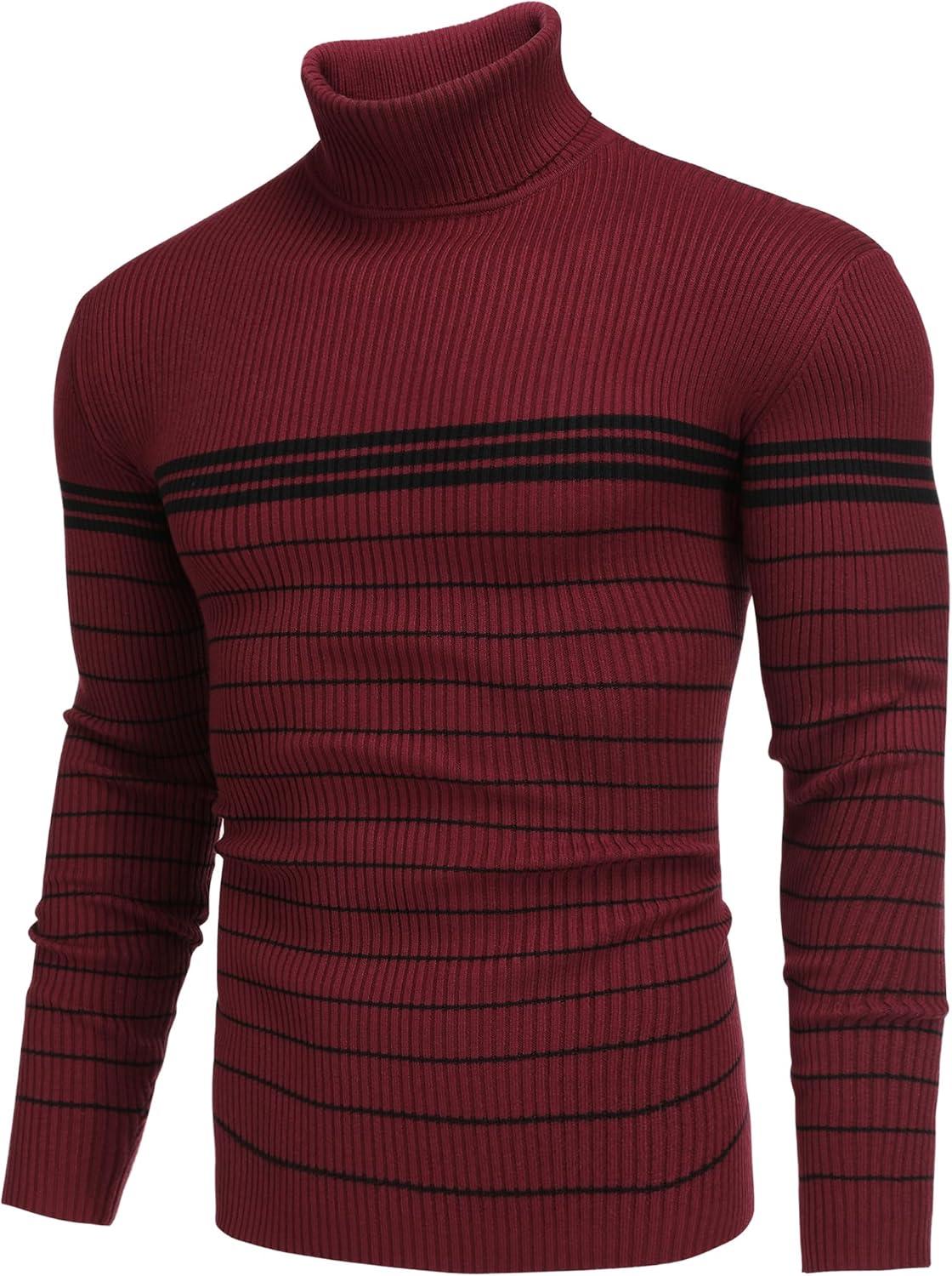 COOFANDY Mens Ribbed Slim Fit Knitted Pullover Casual Turtleneck Sweater(Striped-red)
