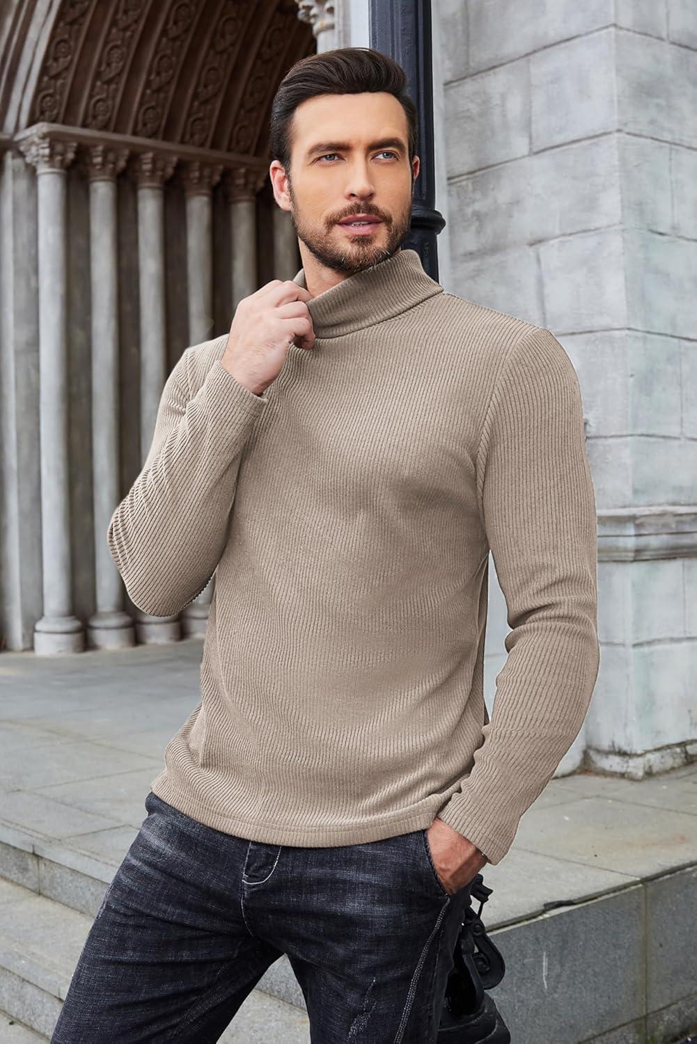 COOFANDY Men's Ribbed Turtleneck Sweater Casual Basic Long Sleeve Knitted Pullover Sweater(Light Khaki)