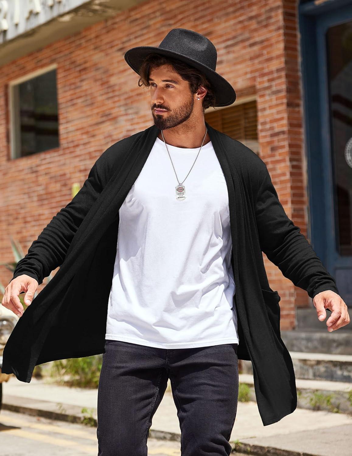 COOFANDY Men's Ruffle Shawl Collar Cardigan Open Front Lightweight Long Length Drape Cape Overcoat with Pockets(Black)