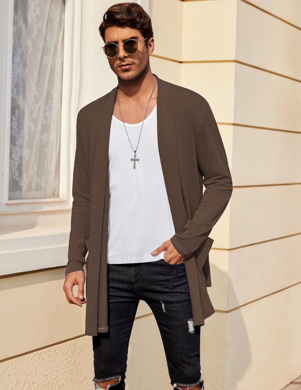 COOFANDY Men's Ruffle Shawl Collar Cardigan Open Front Lightweight Long Length Drape Cape Overcoat with Pockets(Coffe)