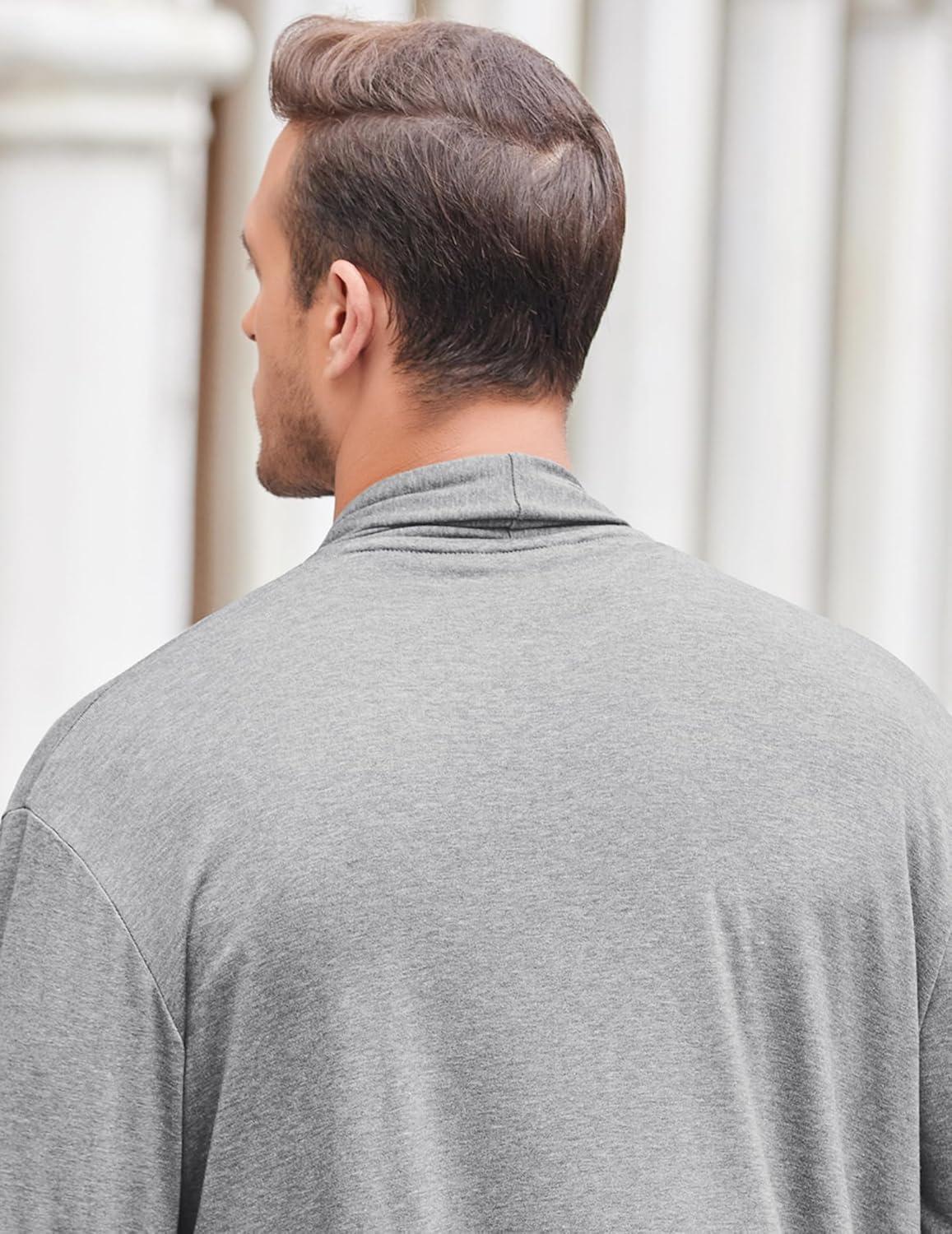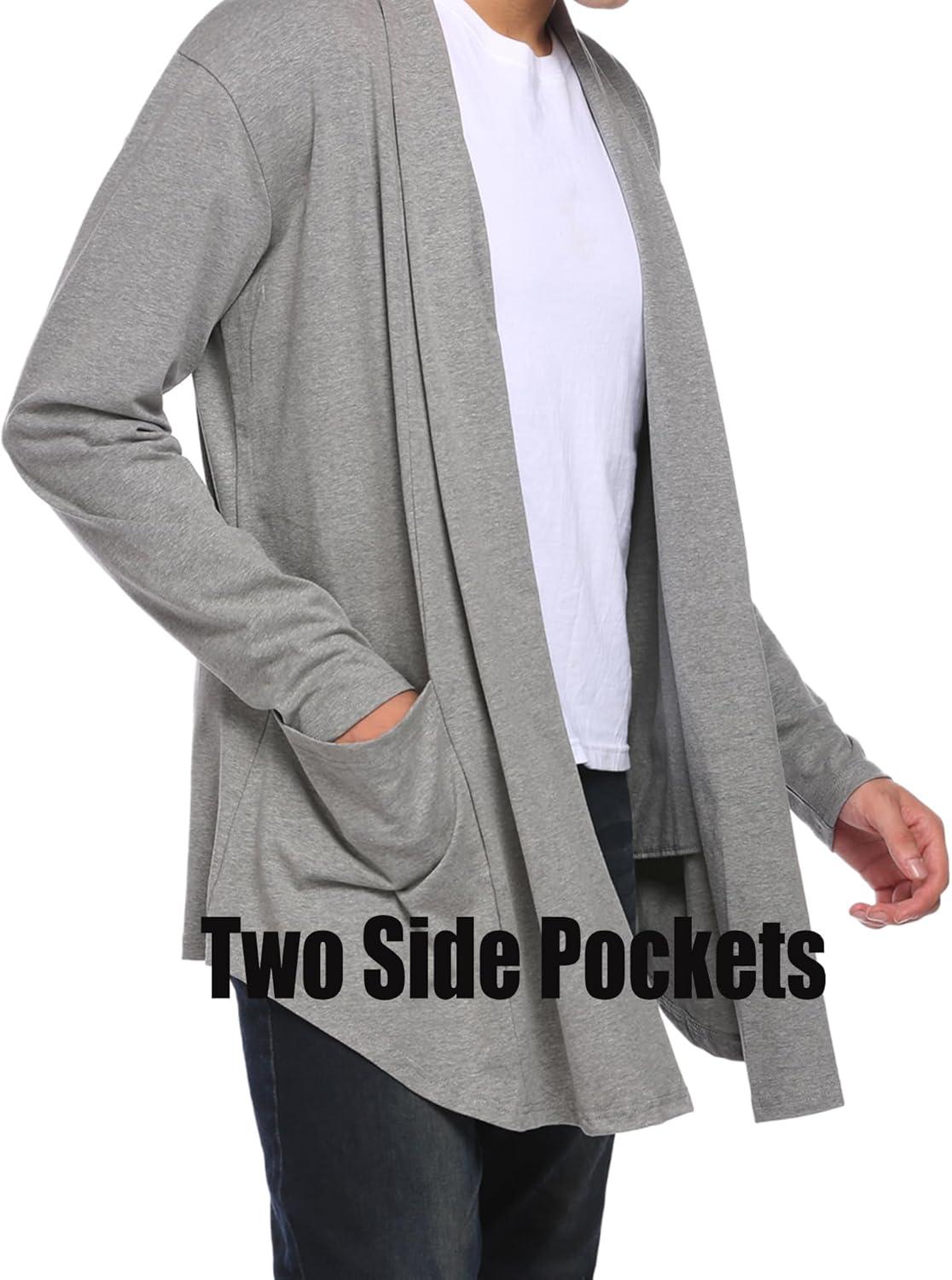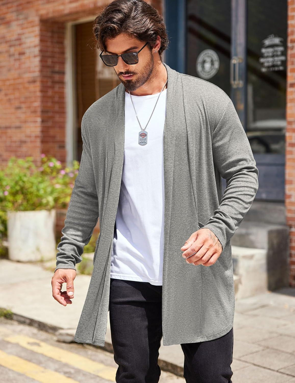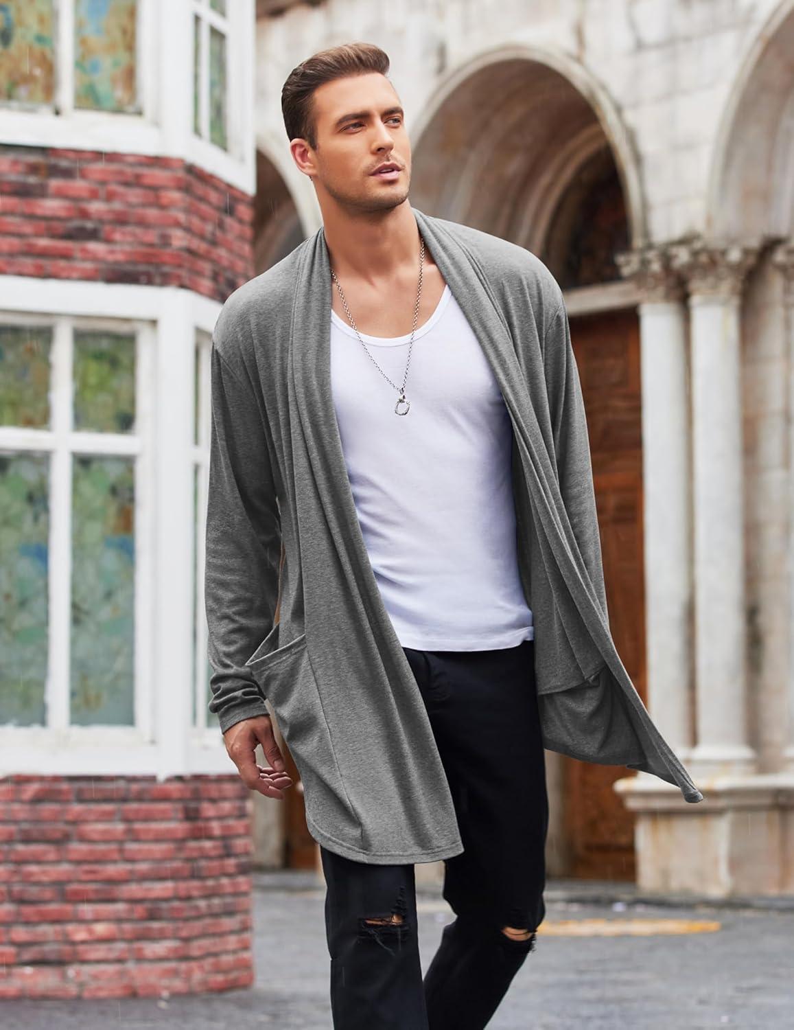 COOFANDY Men's Ruffle Shawl Collar Cardigan Open Front Lightweight Long Length Drape Cape Overcoat with Pockets(Gray)