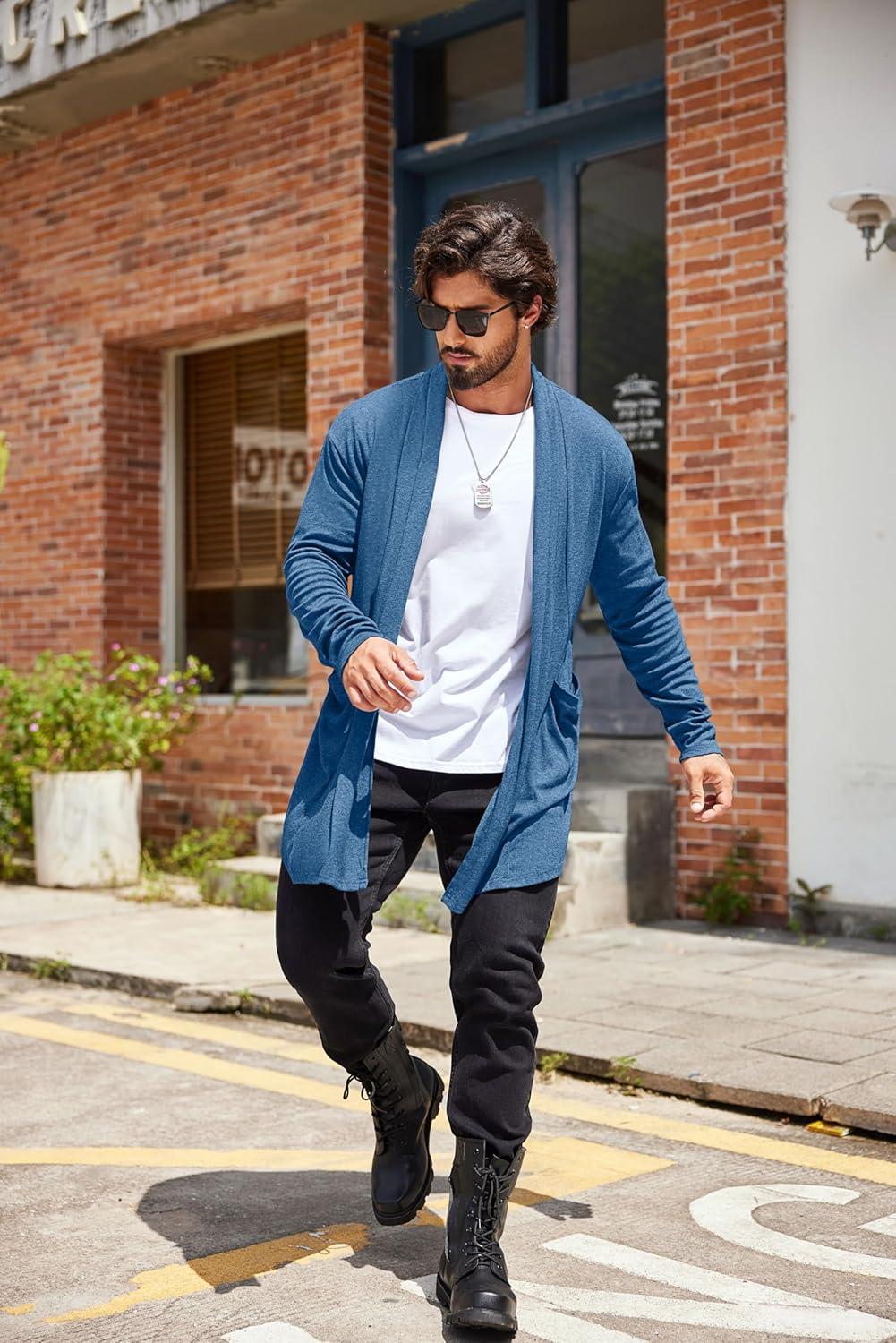 COOFANDY Men's Ruffle Shawl Collar Cardigan Open Front Lightweight Long Length Drape Cape Overcoat with Pockets(Navy Blue)