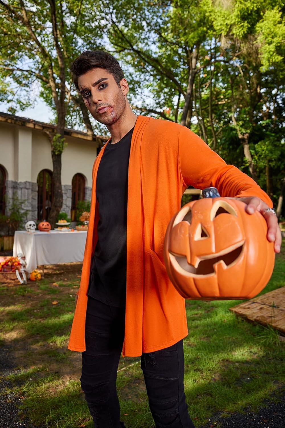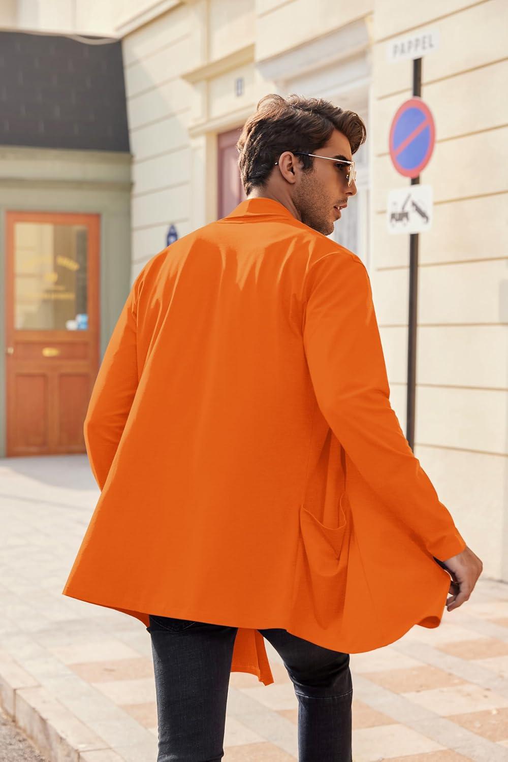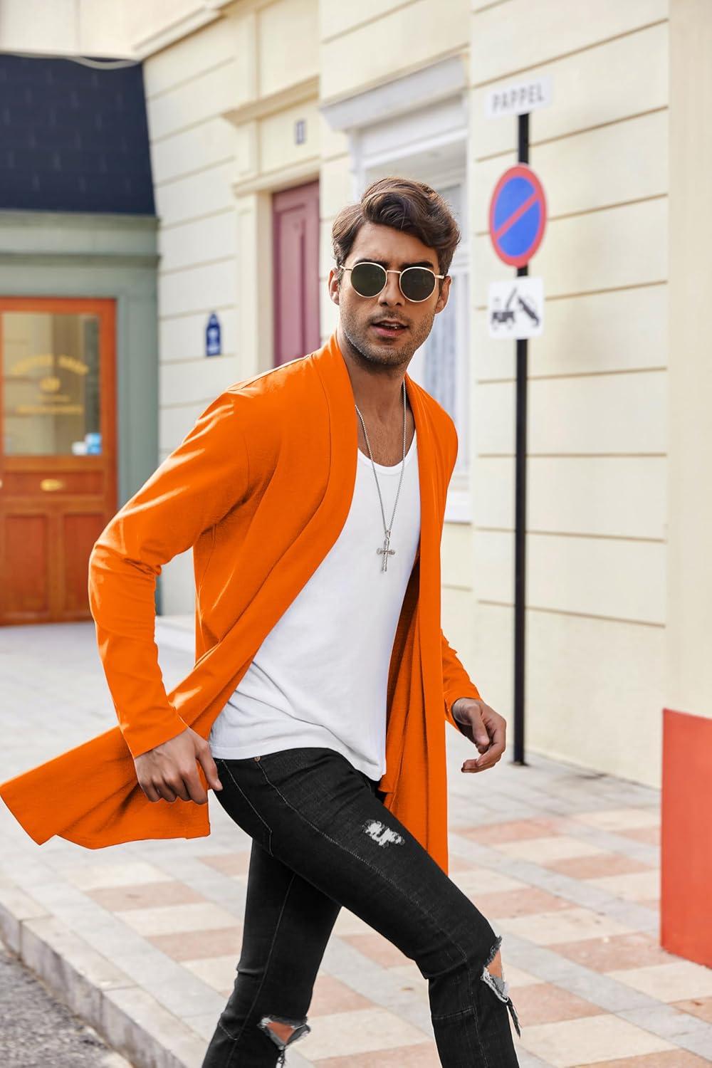 COOFANDY Men's Ruffle Shawl Collar Cardigan Open Front Lightweight Long Length Drape Cape Overcoat with Pockets(Orange)