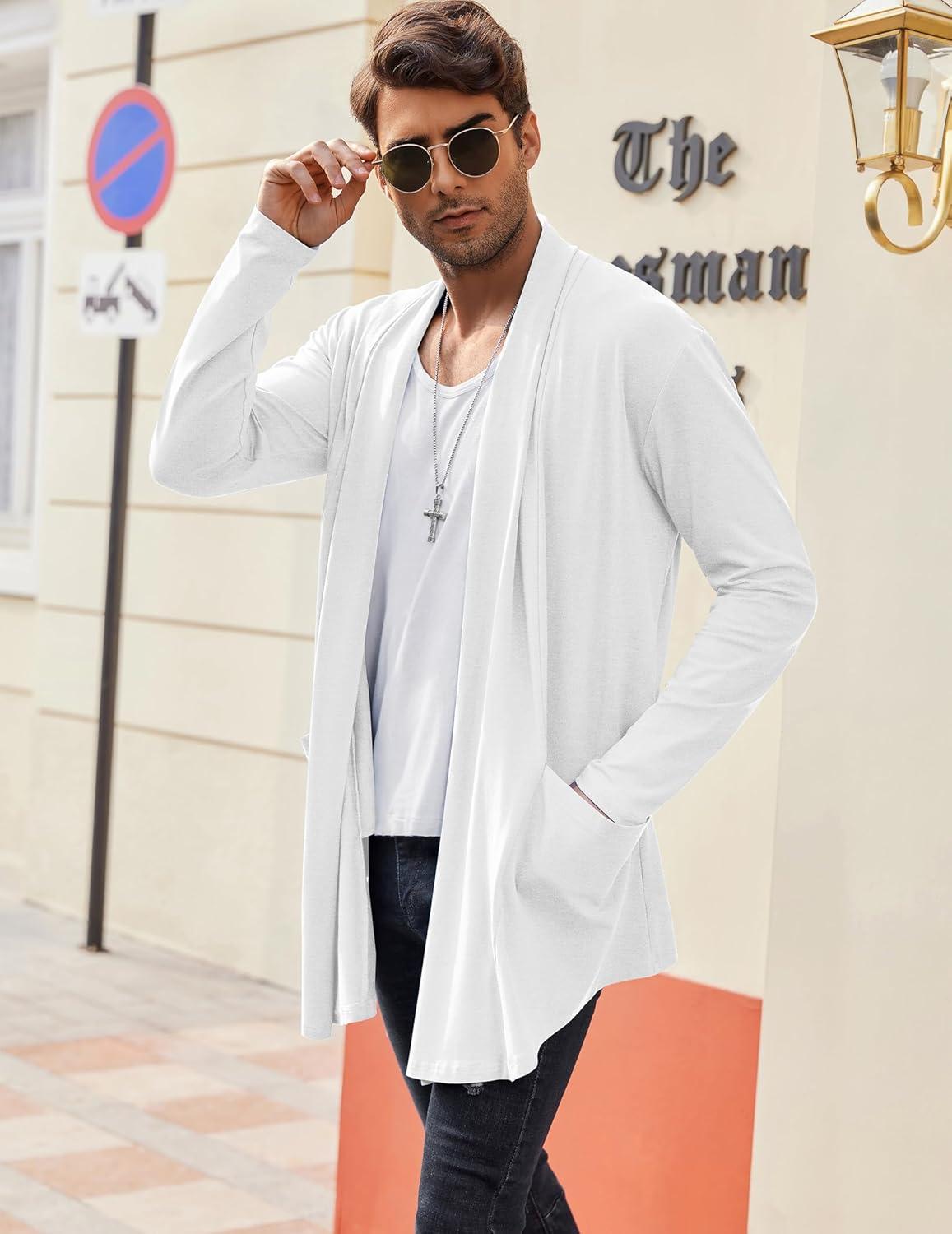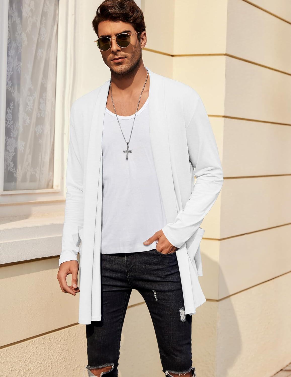 COOFANDY Men's Ruffle Shawl Collar Cardigan Open Front Lightweight Long Length Drape Cape Overcoat with Pockets(White)