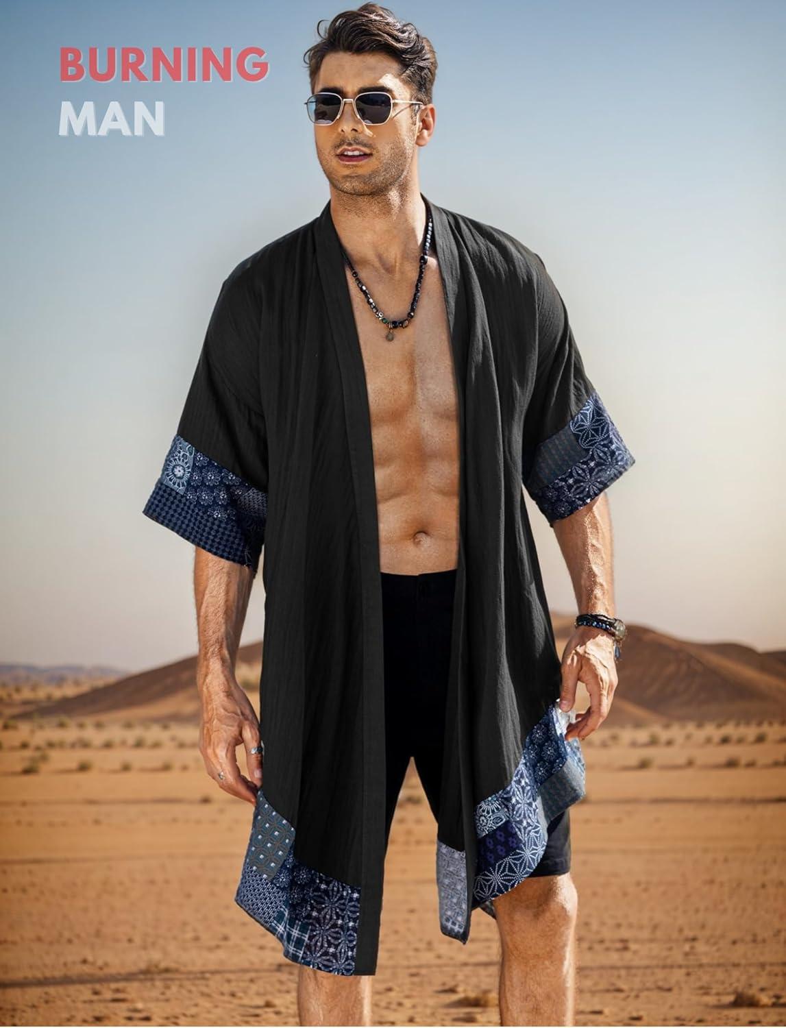 COOFANDY Men's Ruffle Shawl Collar Lightweight Cardigan Long Kimono Jackets Open Front Drape Cape Coat(A_black)