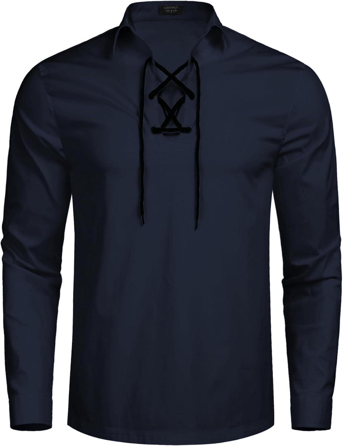COOFANDY Mens Scottish Jacobite Ghillie Kilt Shirts Medieval Renaissance Pirate Costume Long Sleeve Lace Up Henley Shirt(Navy Blue)