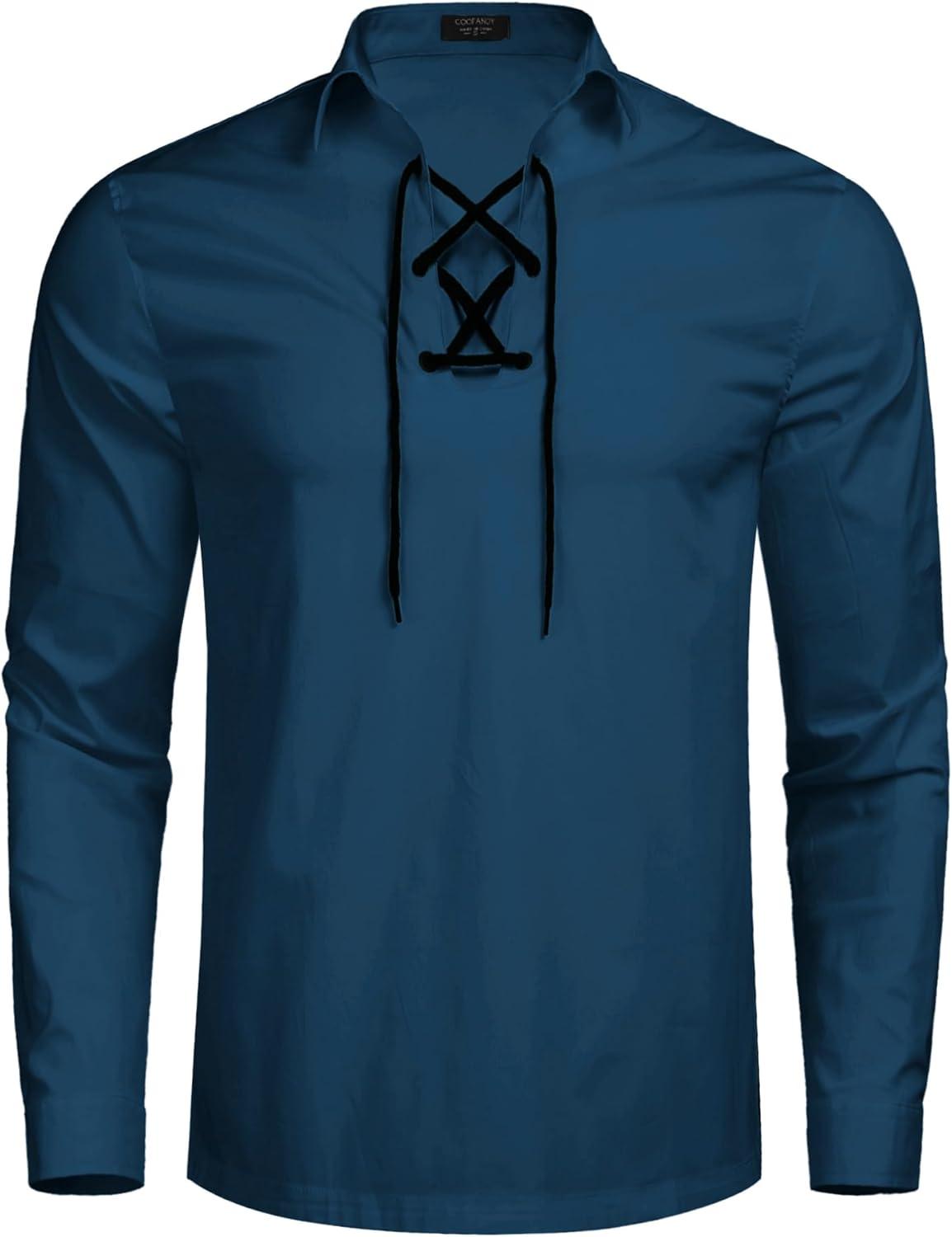 COOFANDY Mens Scottish Jacobite Ghillie Kilt Shirts Medieval Renaissance Pirate Costume Long Sleeve Lace Up Henley Shirt(Peacock Blue)
