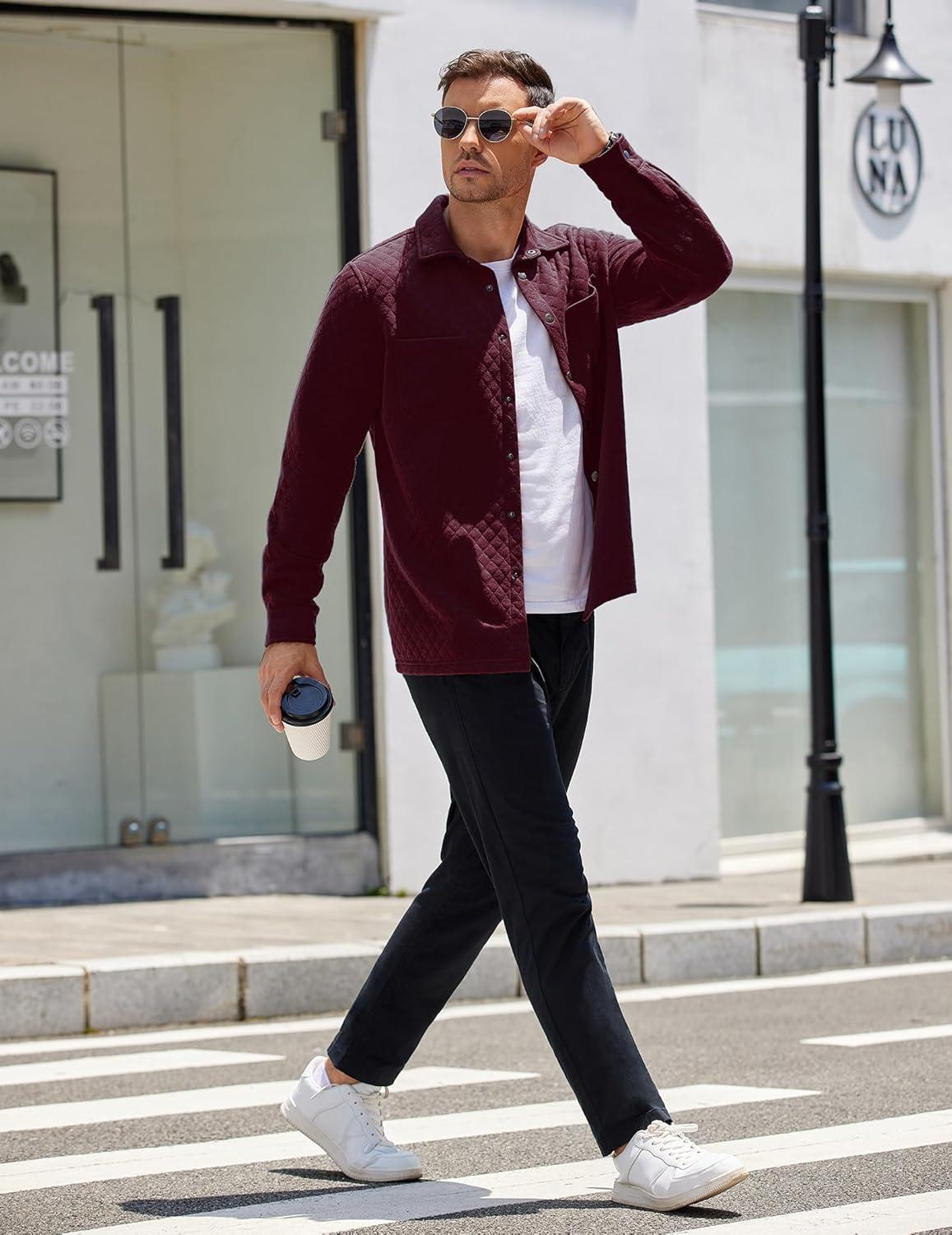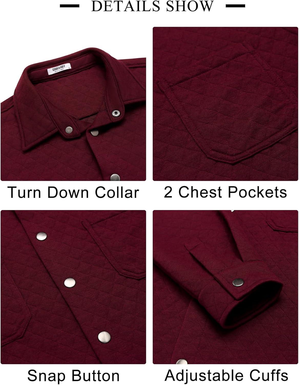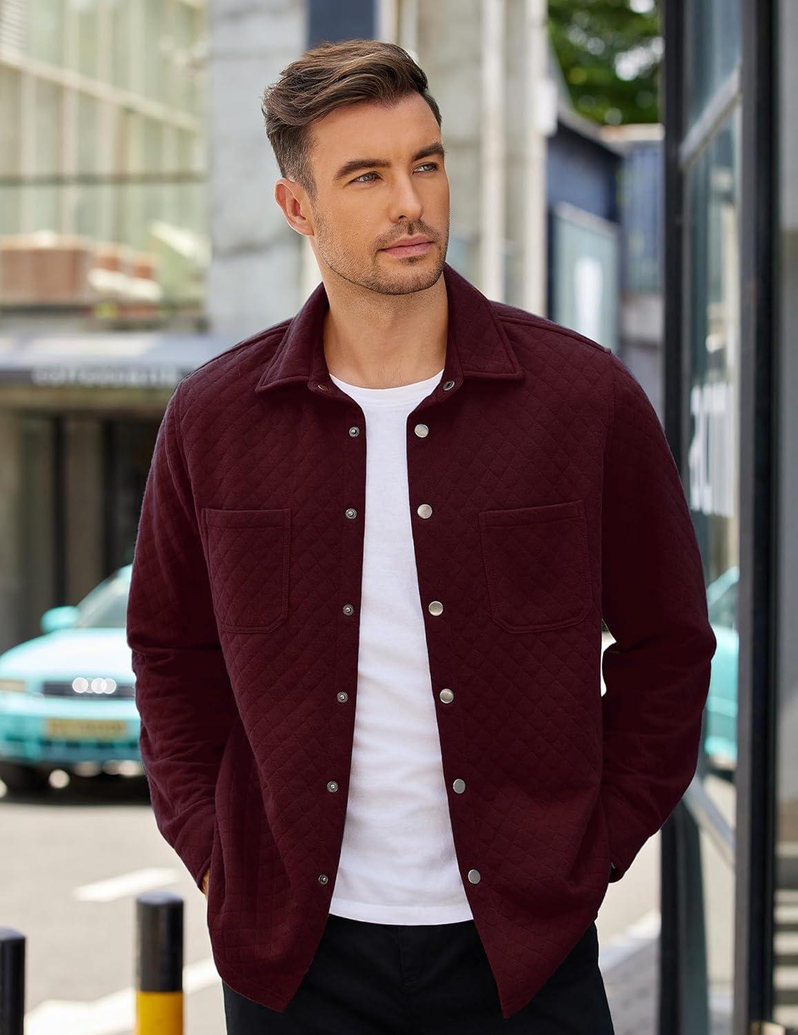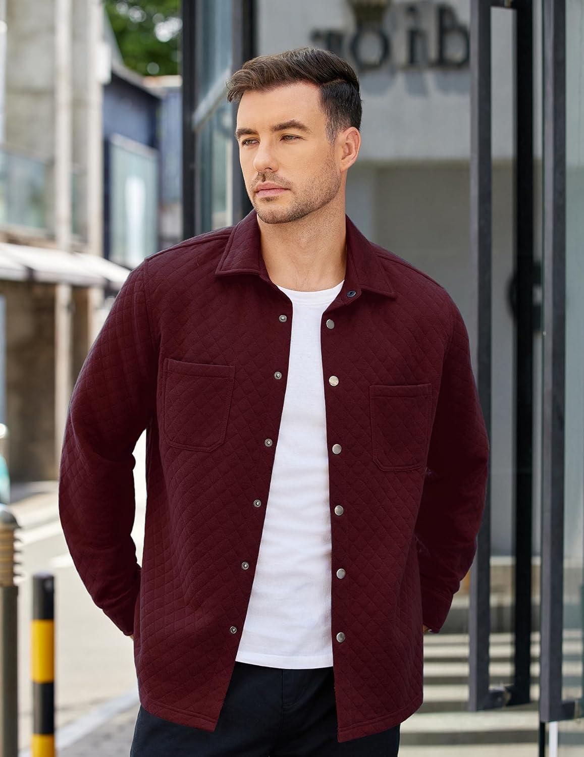 COOFANDY Mens Shacket Long Sleeve Shirt Jacket with Pockets Lightweight Quilted Overshirt(Wine Red)