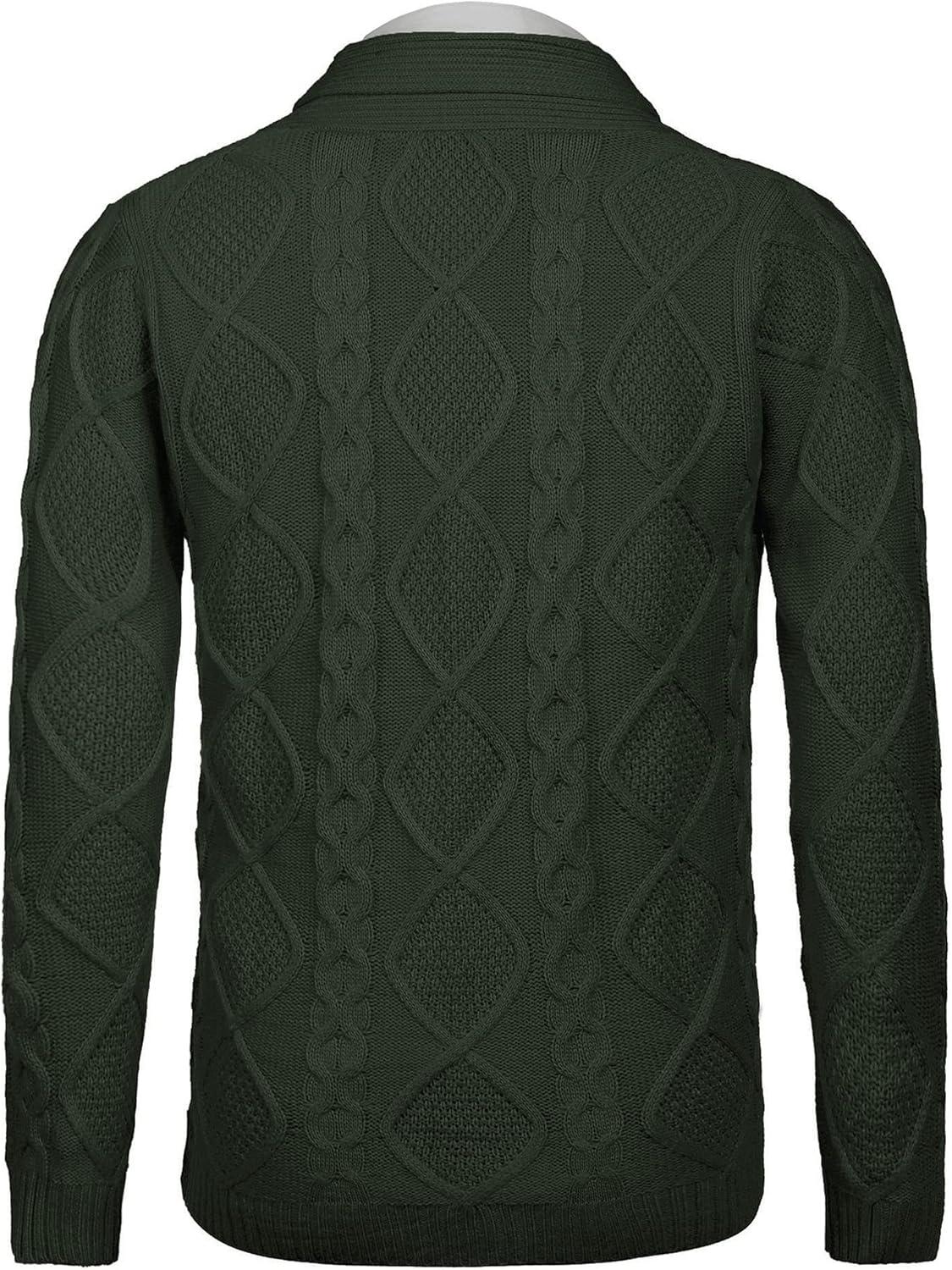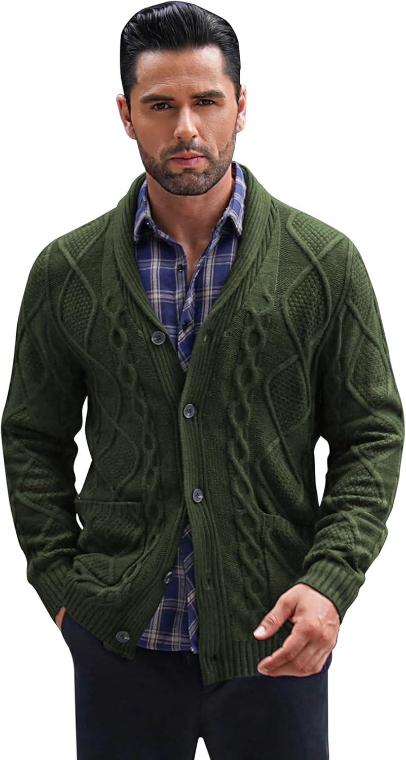 COOFANDY Mens Shawl Collar Cardigan Sweater Slim Fit Button Down Cable Knitted Sweater with Pockets(Army Green)