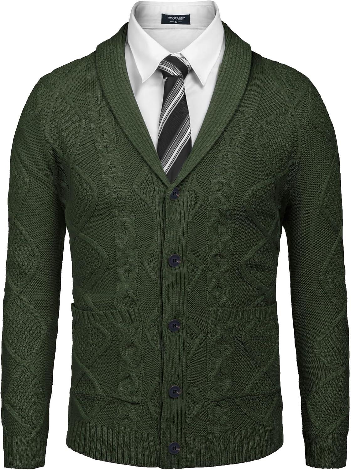 Save up to 40% on COOFANDY Mens Shawl Collar Cardigan Sweater Slim Fit Button Down Cable Knitted Sweater with Pockets(Army Green) styles during our end-of-season sale.