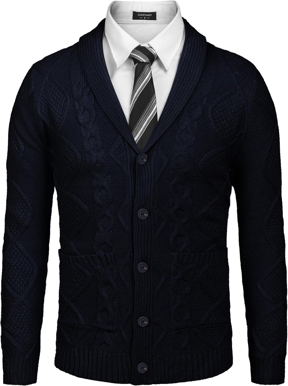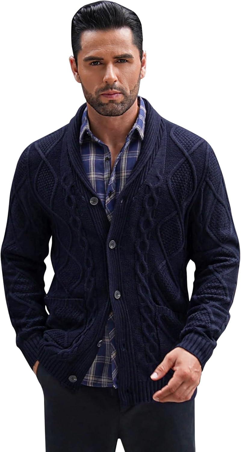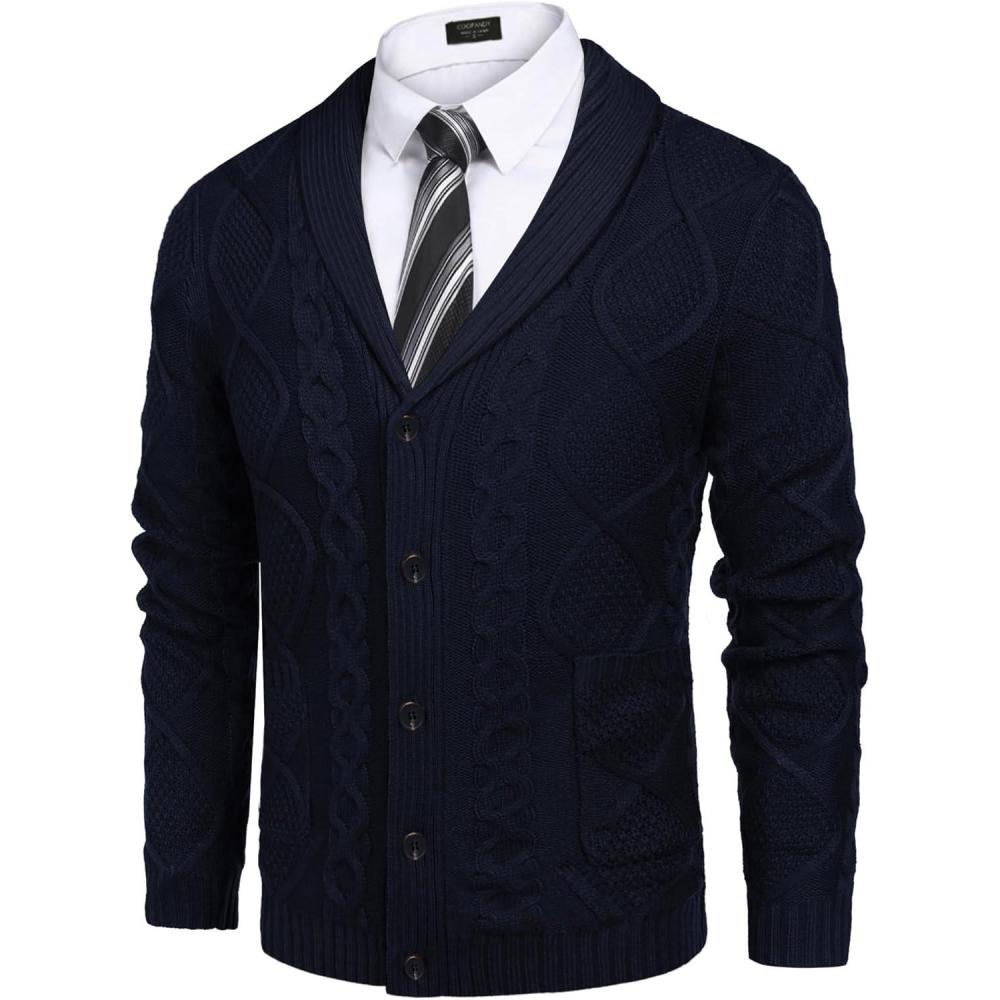Get your hands on our exclusive COOFANDY Mens Shawl Collar Cardigan Sweater Slim Fit Button Down Cable Knitted Sweater with Pockets(Navy Blue) collection, now at a discounted price.