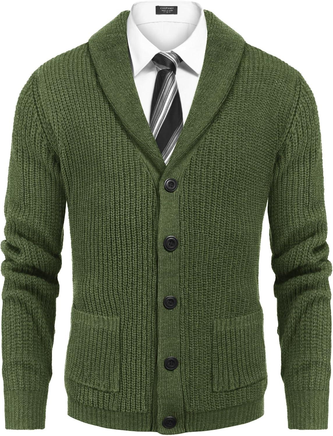 COOFANDY Men’s Shawl Collar Cardigan Sweater Slim Fit Cable Knit Button up Sweater with Pockets(Army Green)