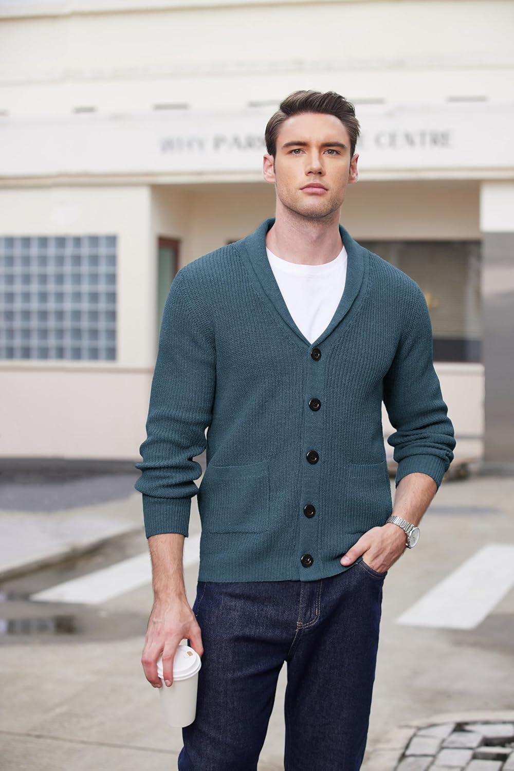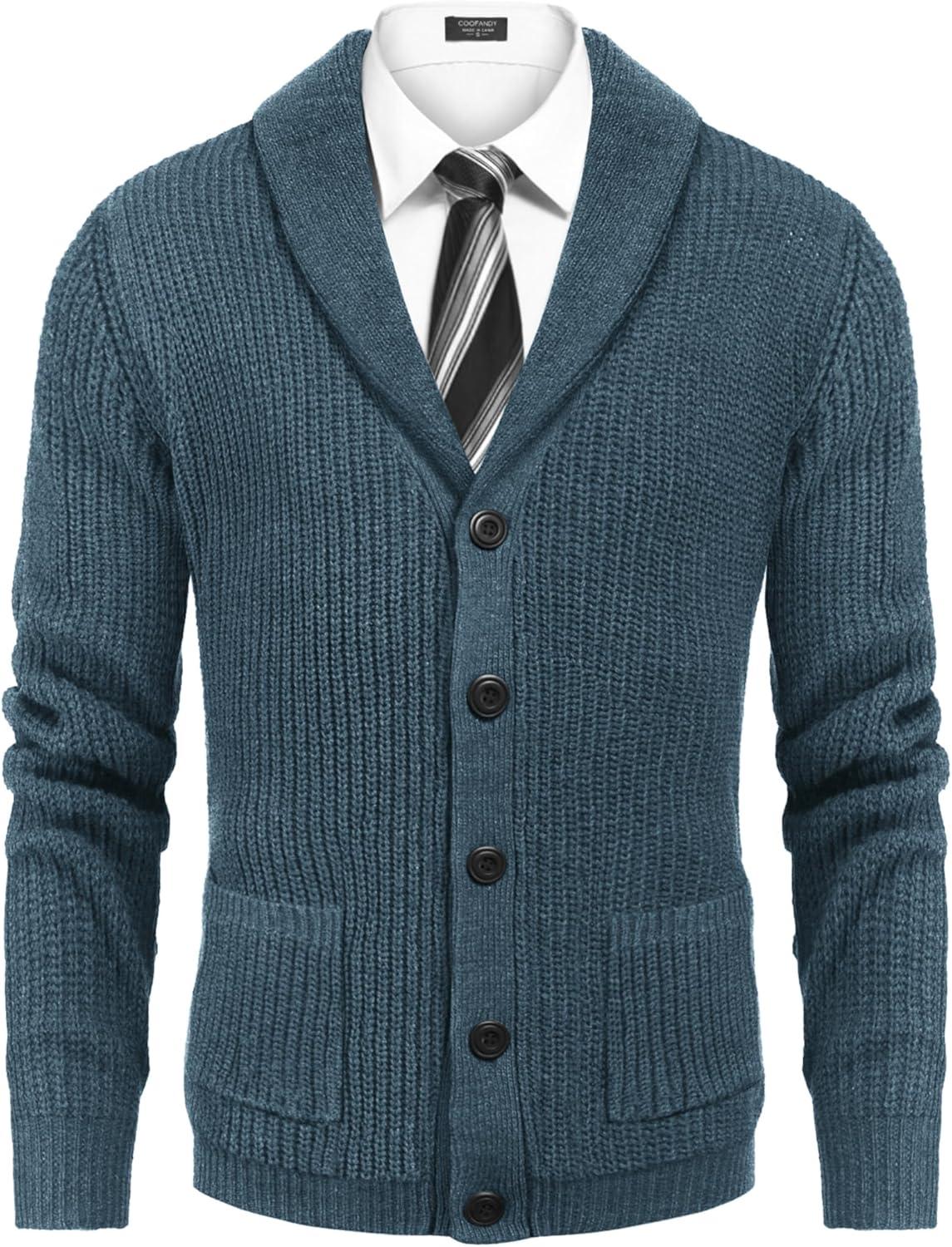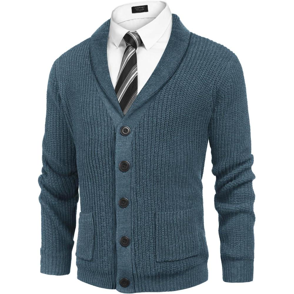 COOFANDY Men’s Shawl Collar Cardigan Sweater Slim Fit Cable Knit Button up Sweater with Pockets(Blue Heather)