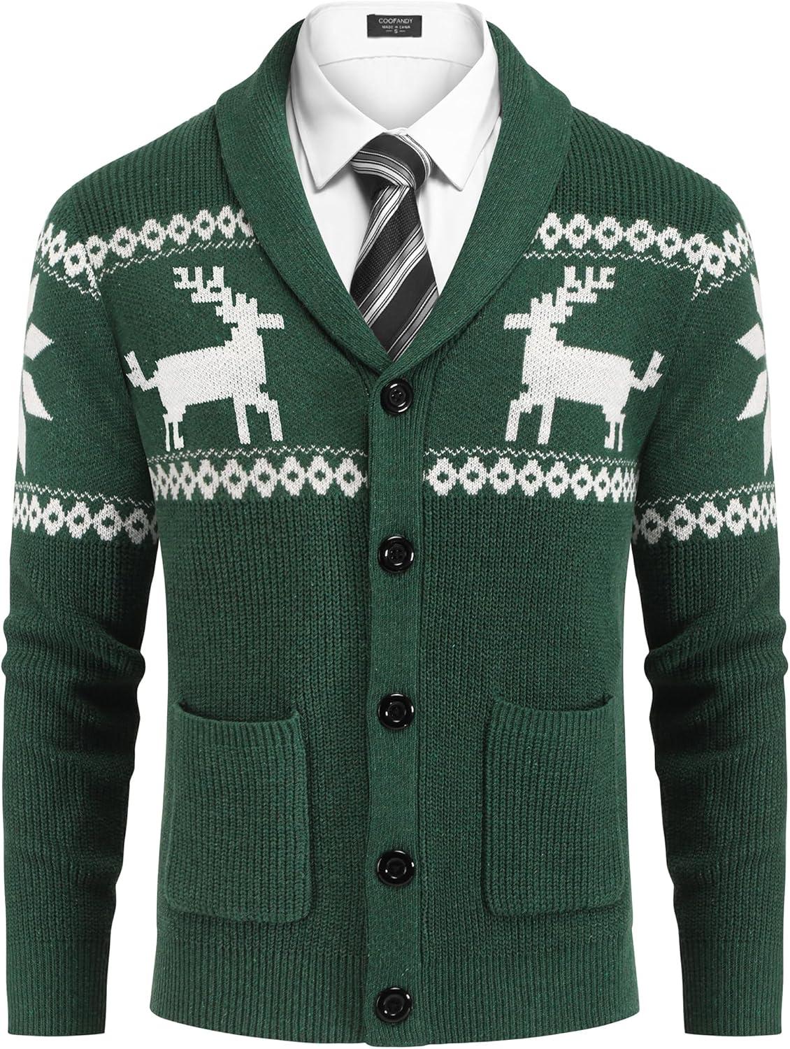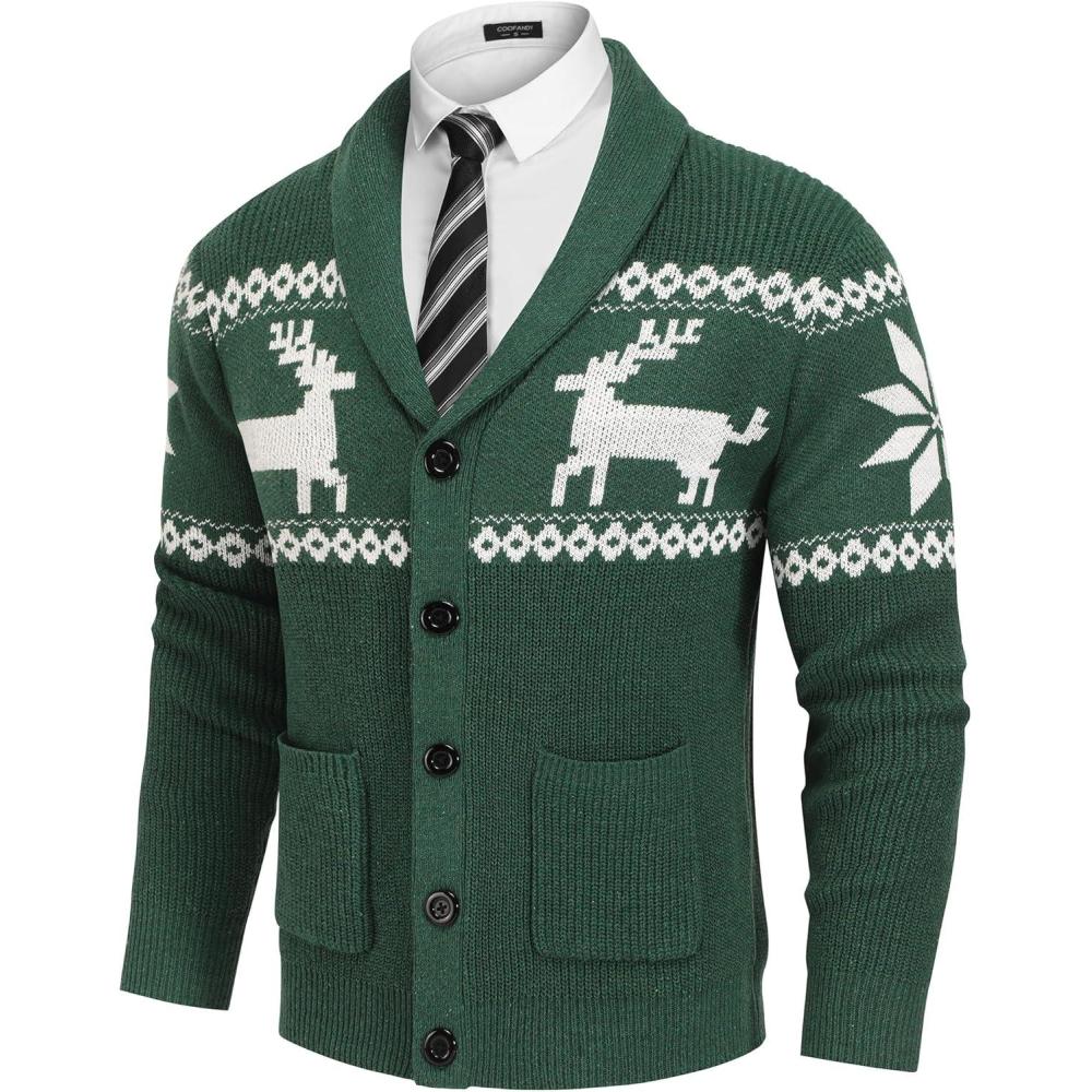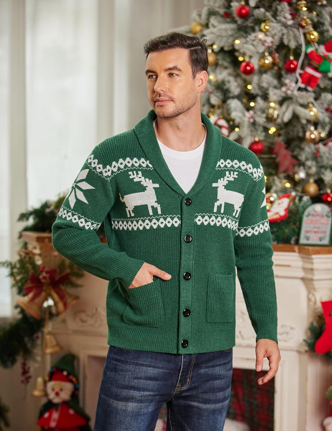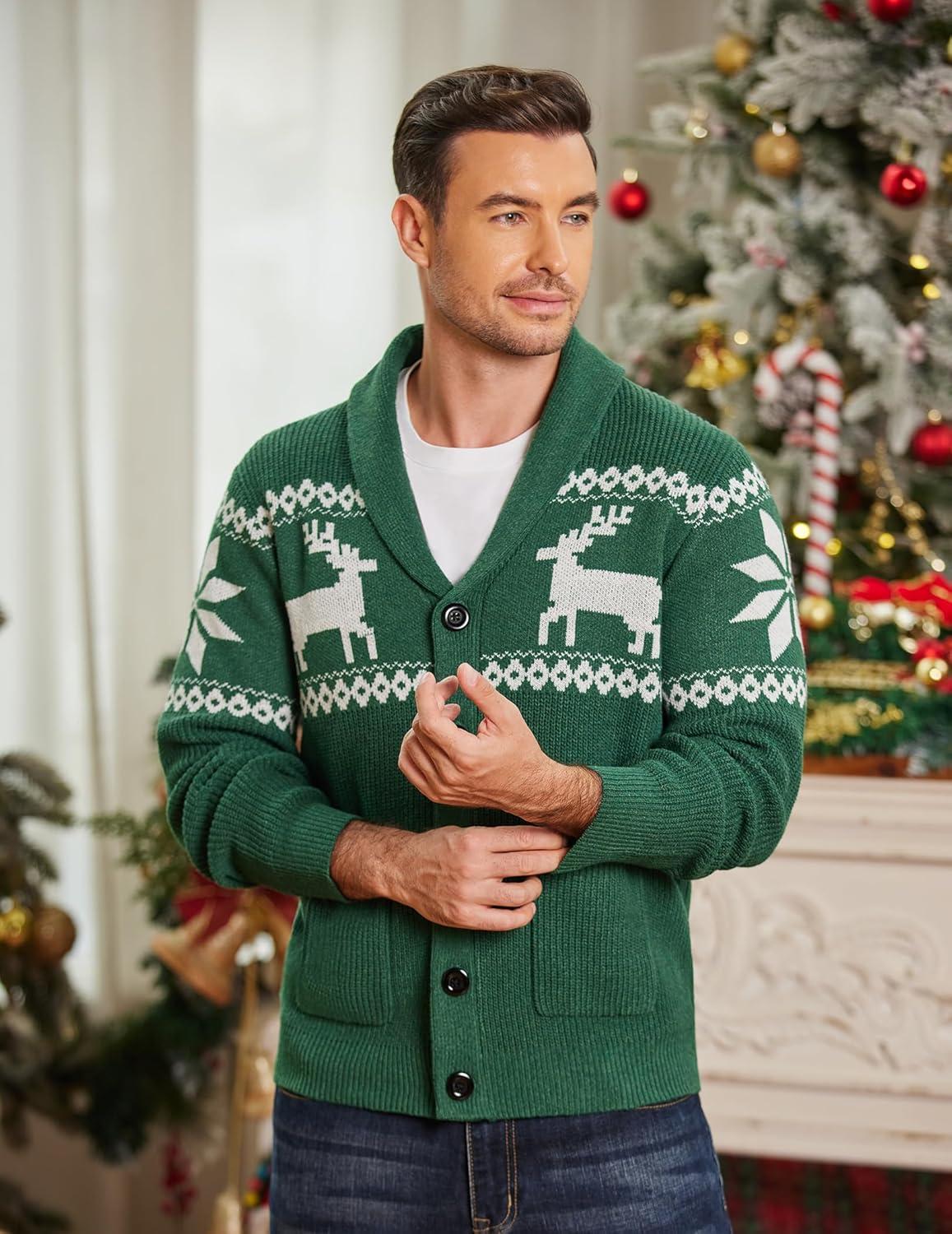 COOFANDY Men's Shawl Collar Cardigan Sweater Slim Fit Cable Knit Button up Sweater with Pockets(Christmas Green/White)