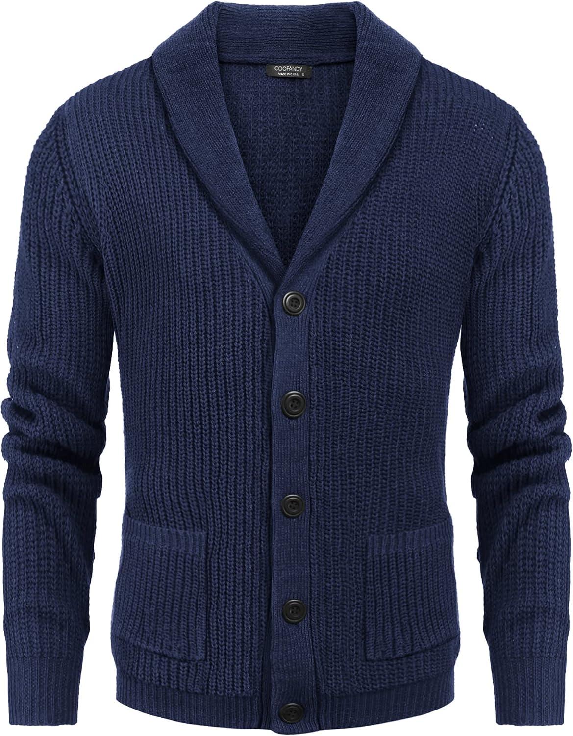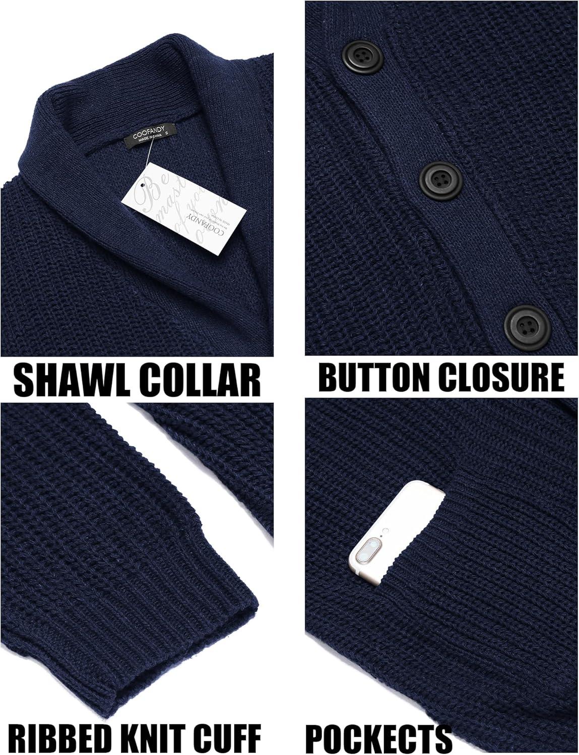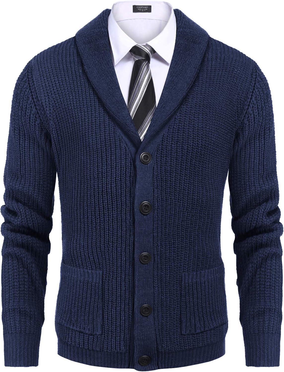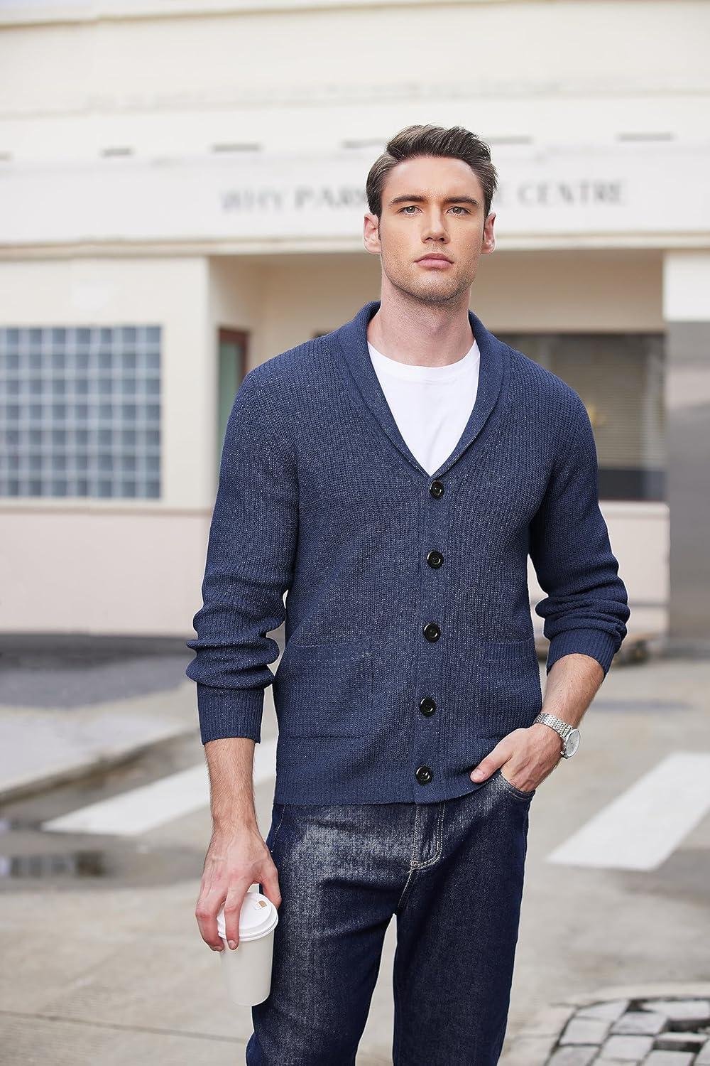 COOFANDY Men’s Shawl Collar Cardigan Sweater Slim Fit Cable Knit Button up Sweater with Pockets(Snorkel Blue)