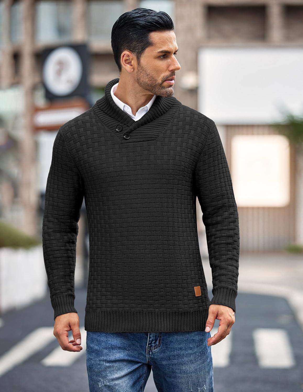 COOFANDY Men's Shawl Collar Pullover Sweater Casual Slim Fit Button Textured Knit Sweaters: Basic pullover sweater featuring shawl collar, solid colors, basket knit patterned, two round buttons, and ribbed at cuffs and hem