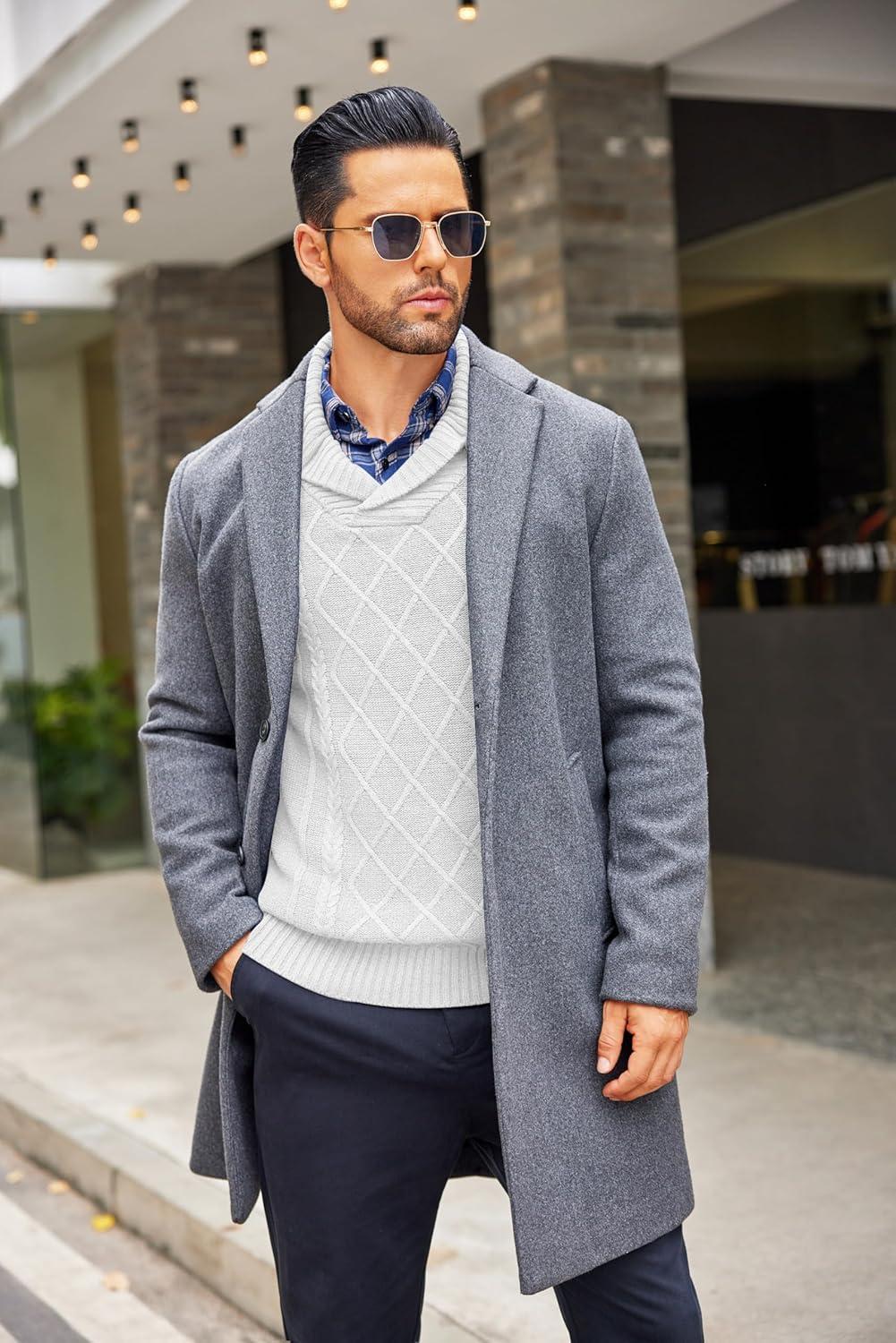 COOFANDY Men’s Shawl Collar Sweaters V-Neck Relaxed Fit Cable Pullovers(Khaki)