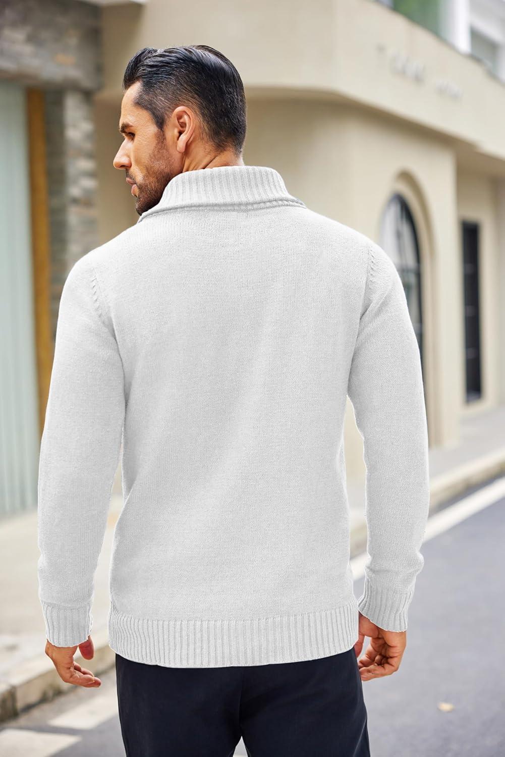 COOFANDY Men's Shawl Collar Sweaters V-Neck Relaxed Fit Cable Pullovers(White)