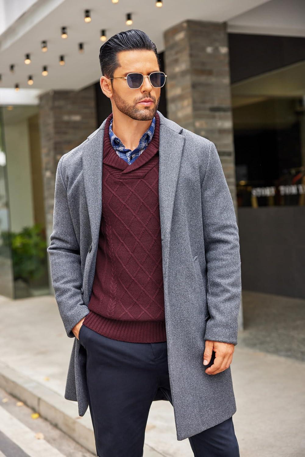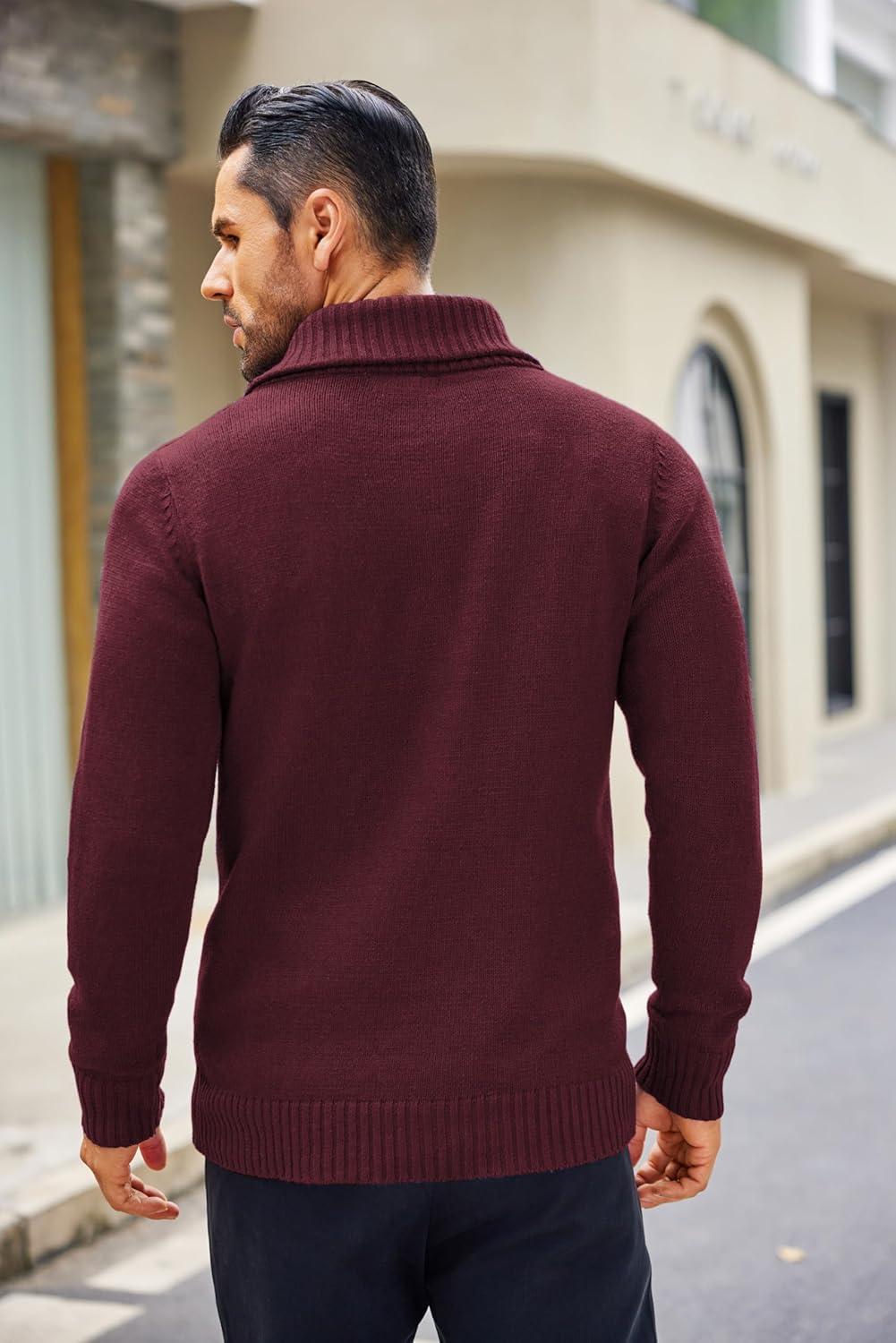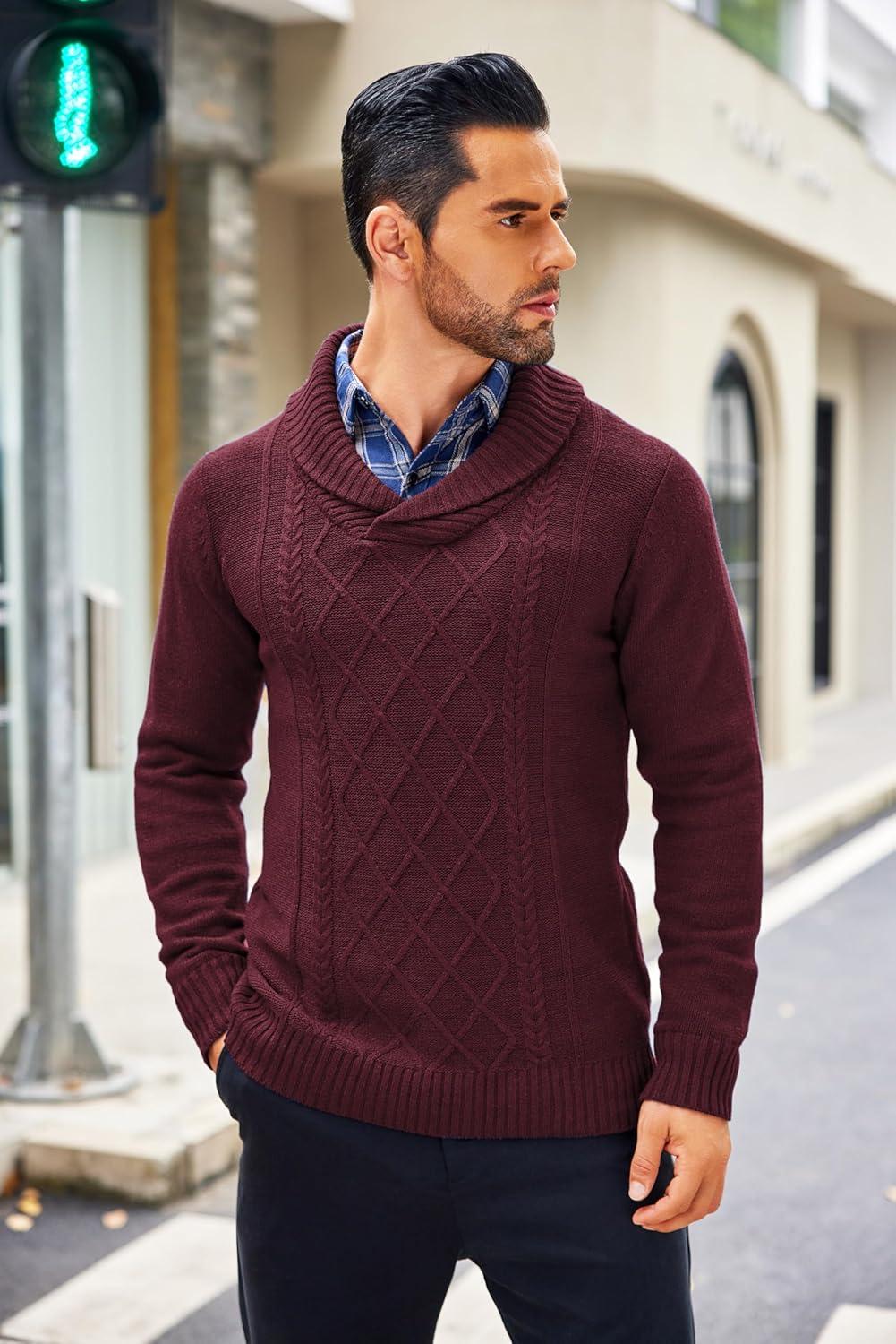 COOFANDY Men's Shawl Collar Sweaters V-Neck Relaxed Fit Cable Pullovers(Wine Red)