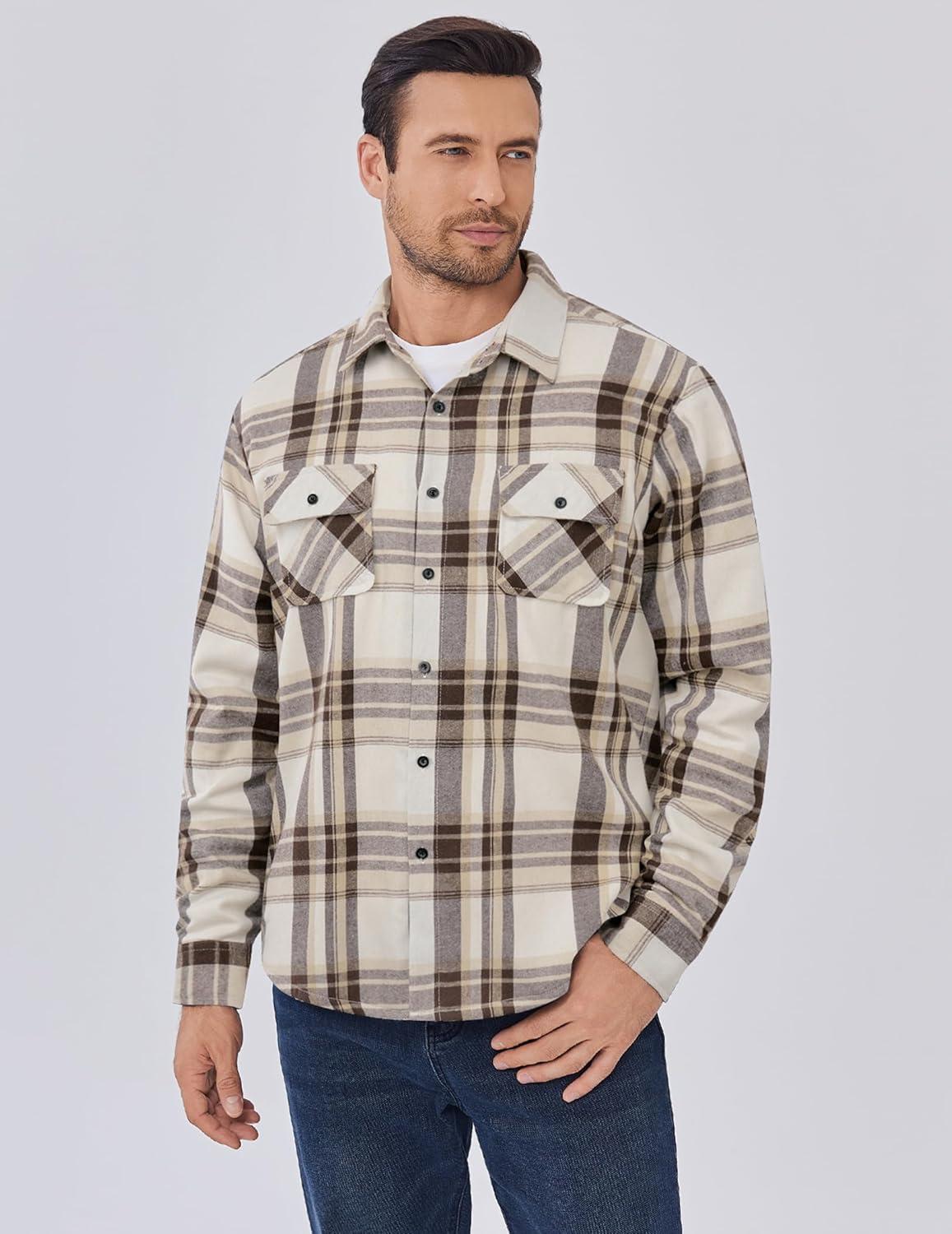 COOFANDY Men's Sherpa Lined Flannel Shirt Jacket Long Sleeve Button Up Fleece Plaid Shirts(Dark Brown Grey White Plaid)