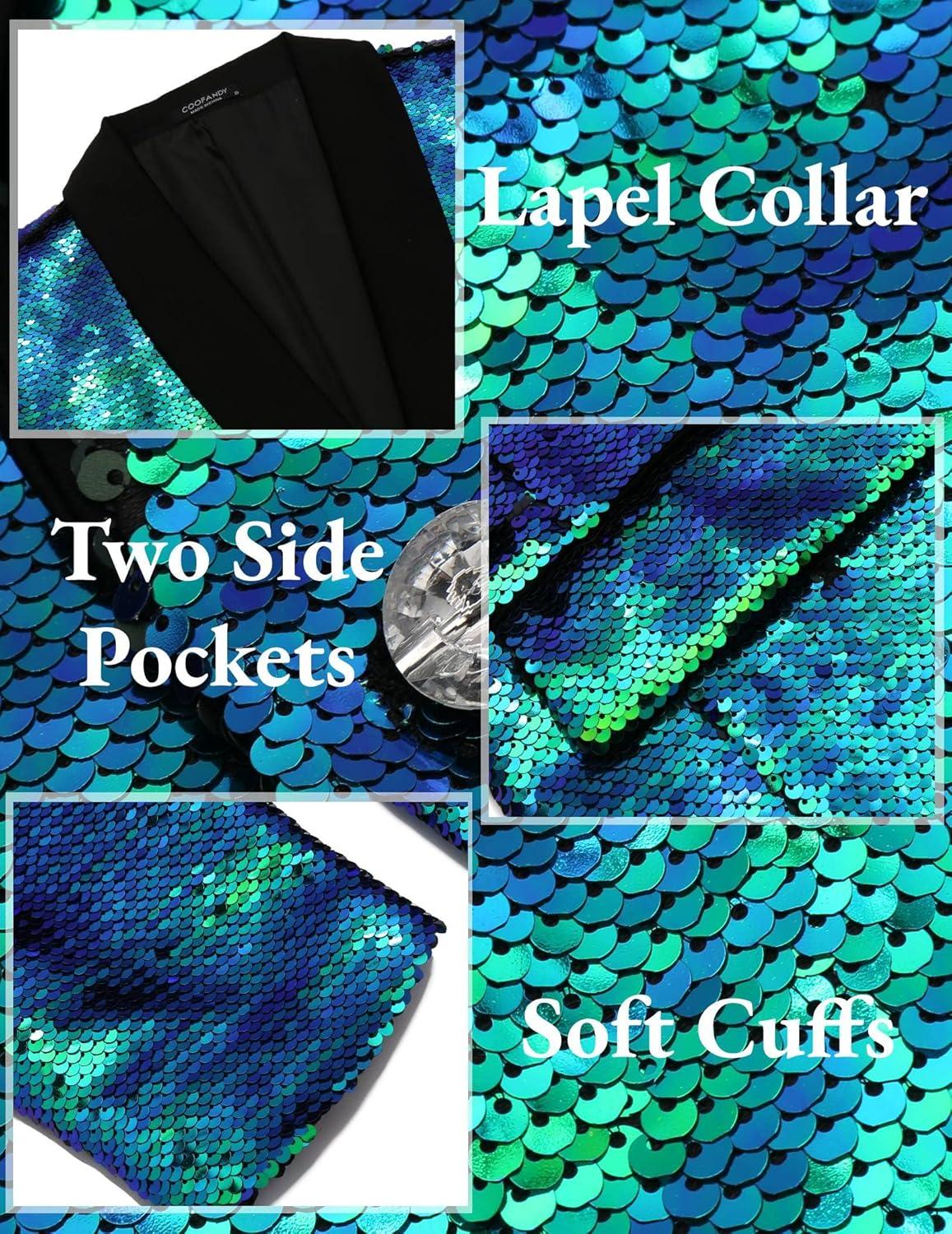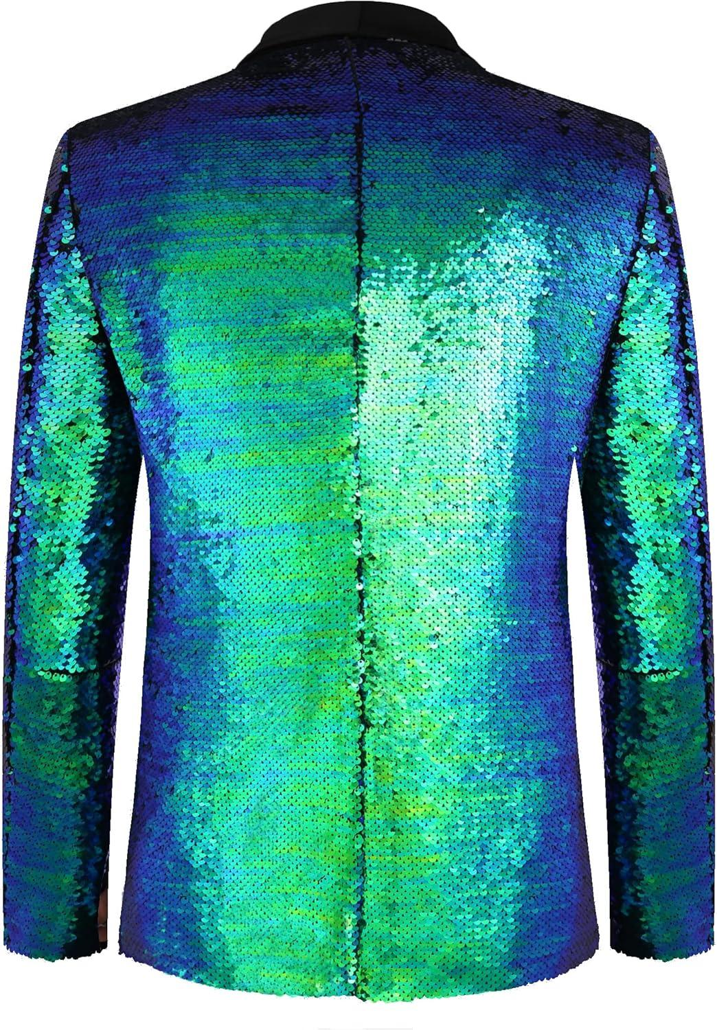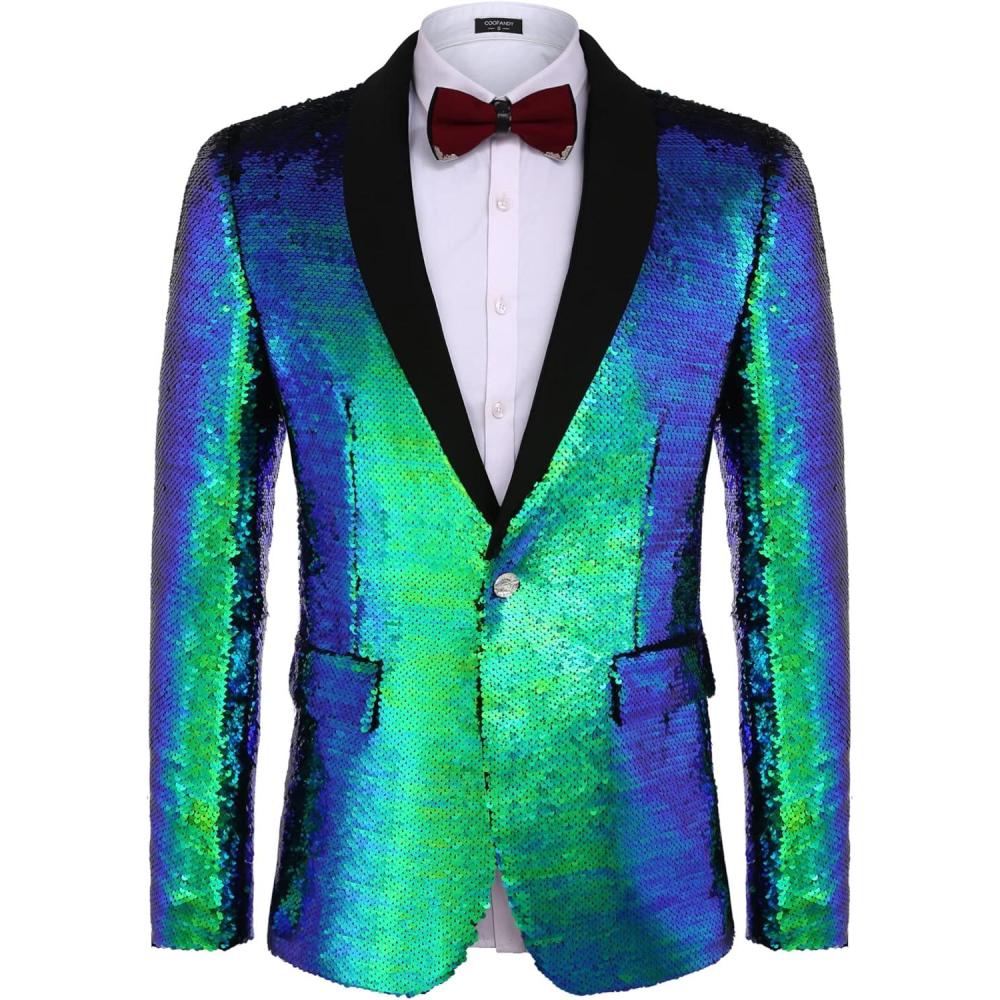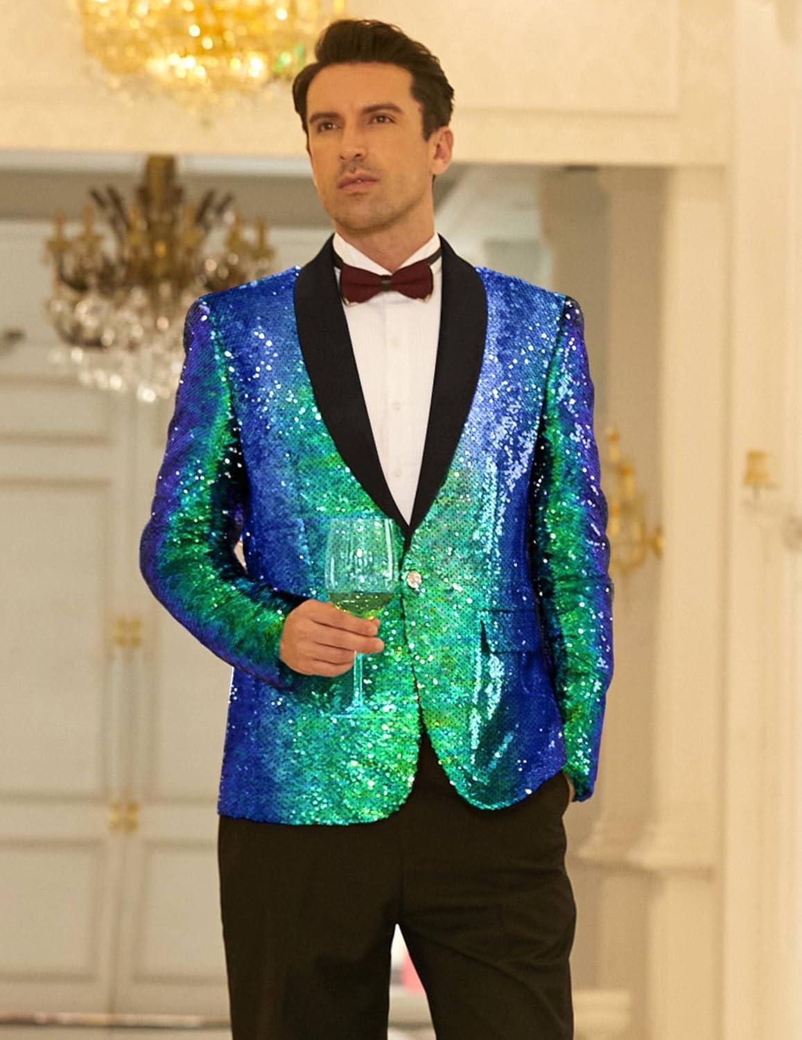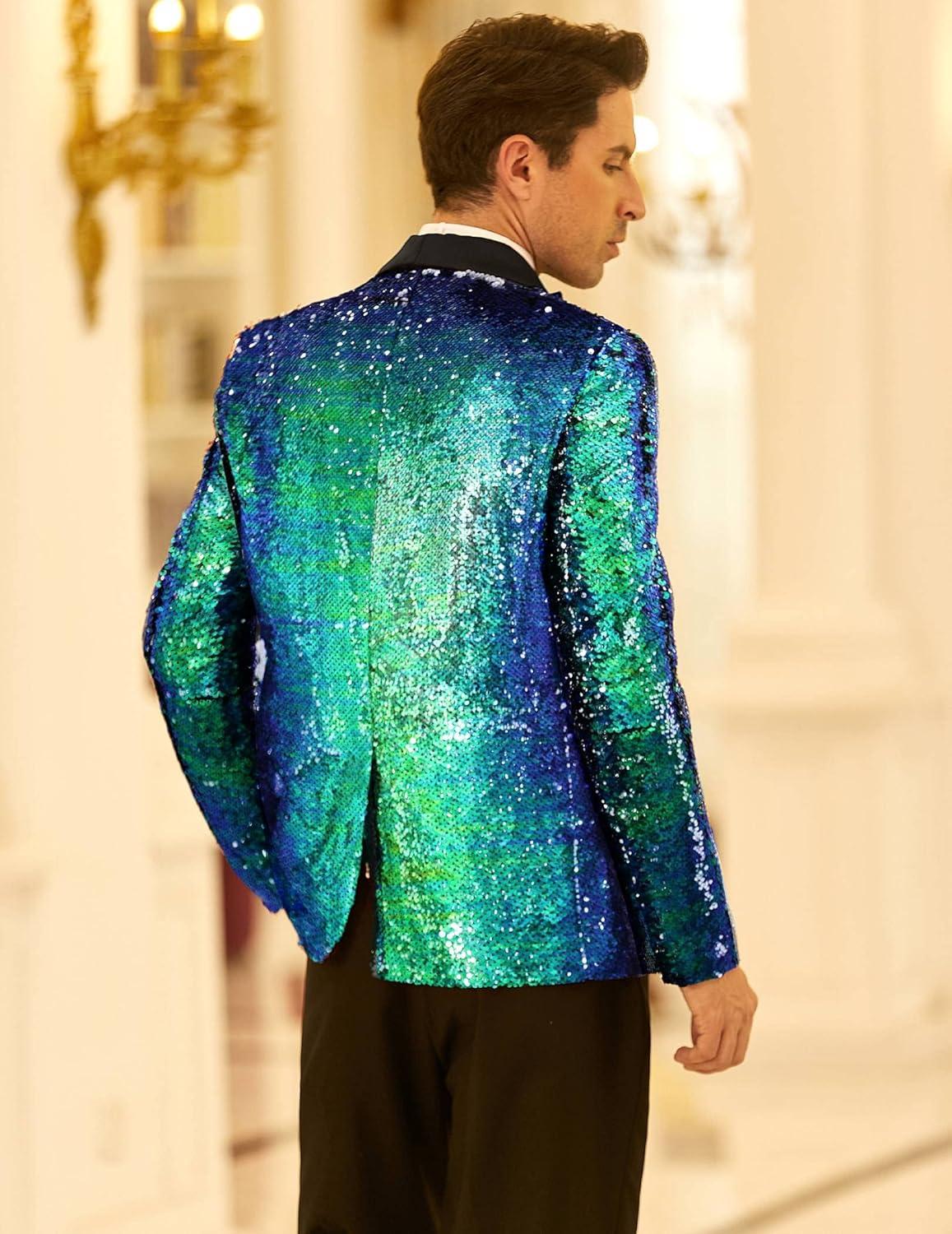 COOFANDY Mens Shiny Sequin Blazer Tuxedo Party Dinner Prom One Button Suit Jacket(Blue Green)